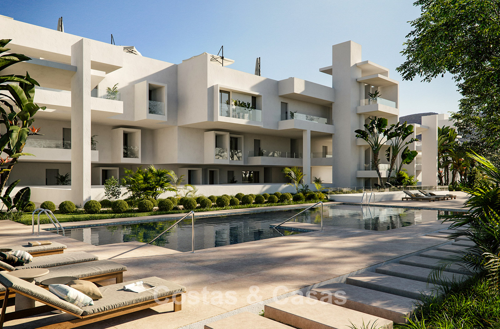 Elegante off-plan appartementen te koop op een steenworp van een grote blauwe lagune aan de Costa del Sol