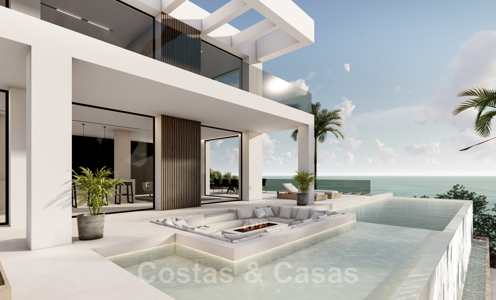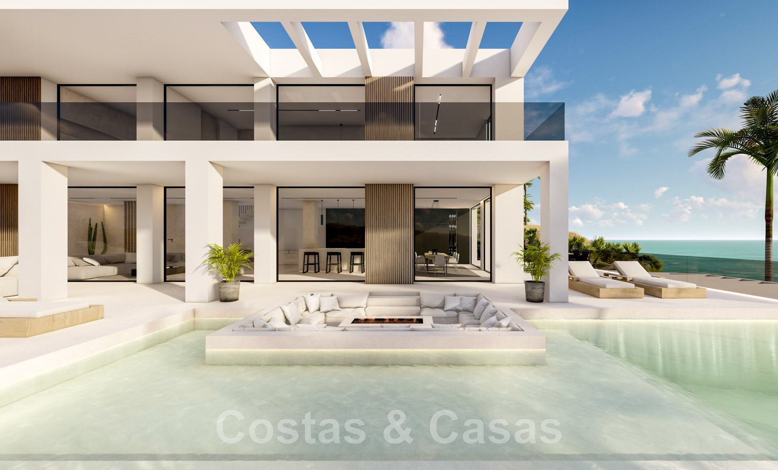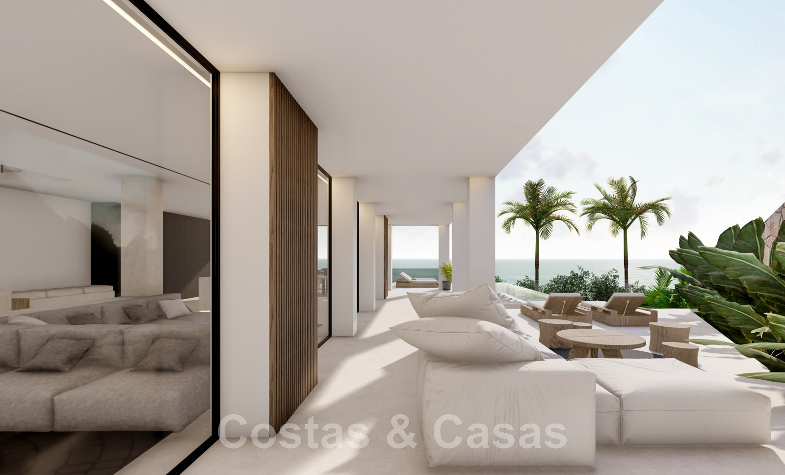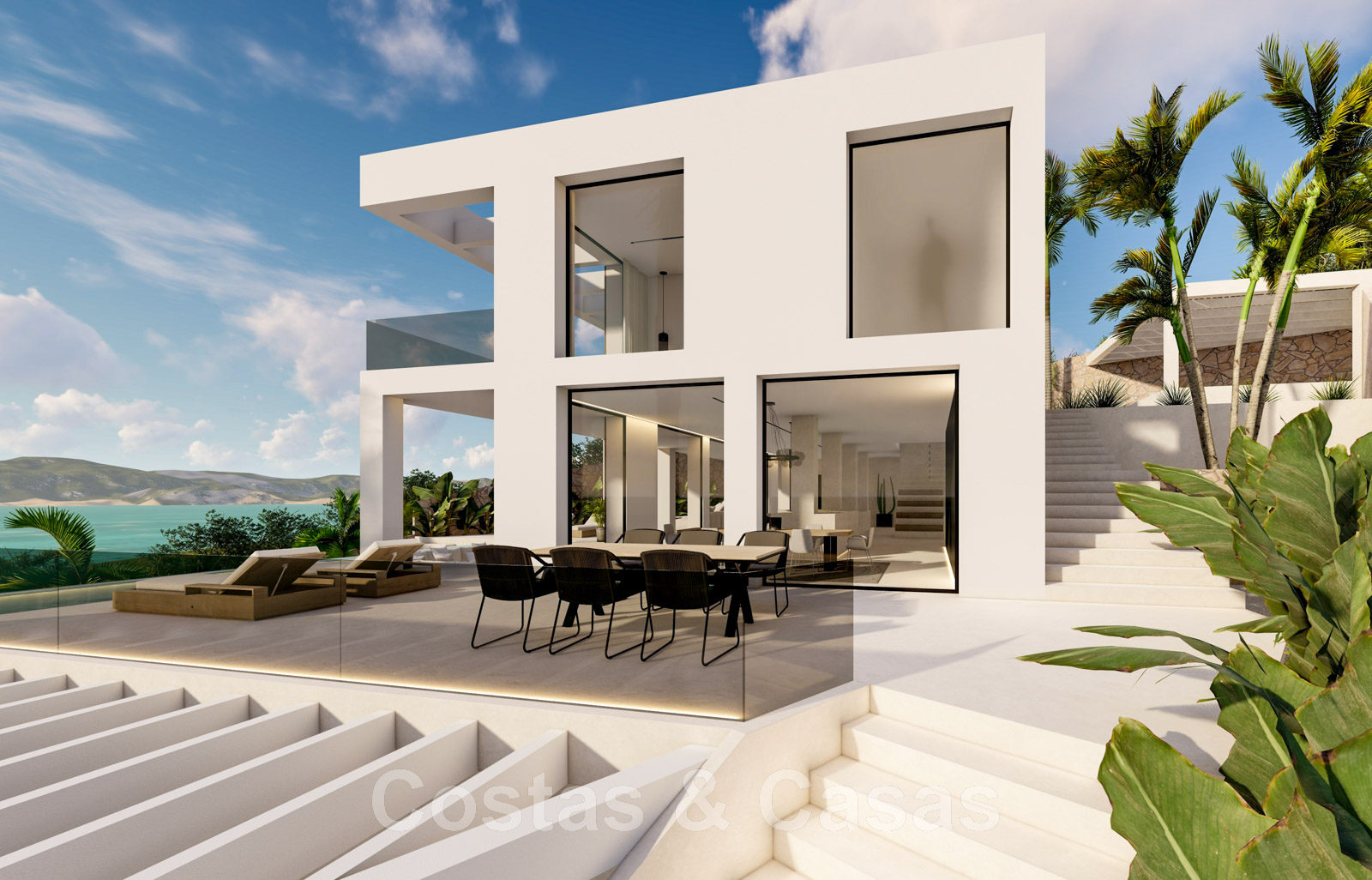 Nieuwe designervilla te koop, met panoramisch zeezicht in een rustige omgeving op loopafstand van het strand in Manilva, Costa del Sol