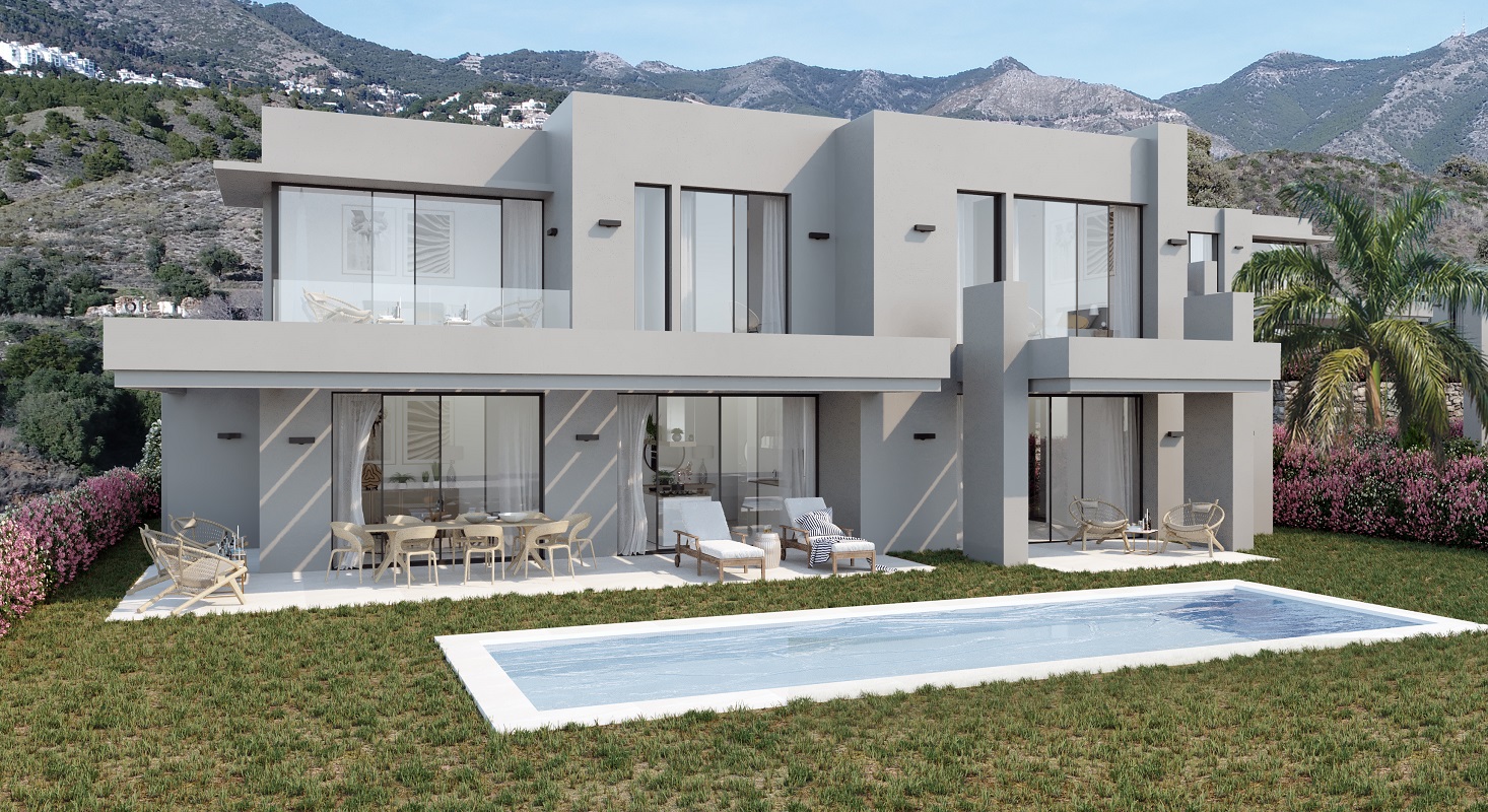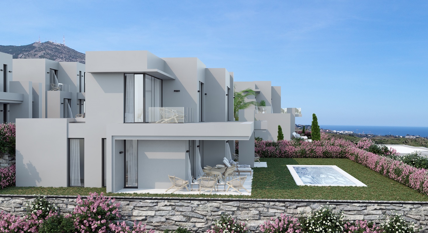 Moderne, luxevilla te koop in een golfresort in Mijas aan de Costa del Sol met panoramisch uitzicht op het landschap en de zee