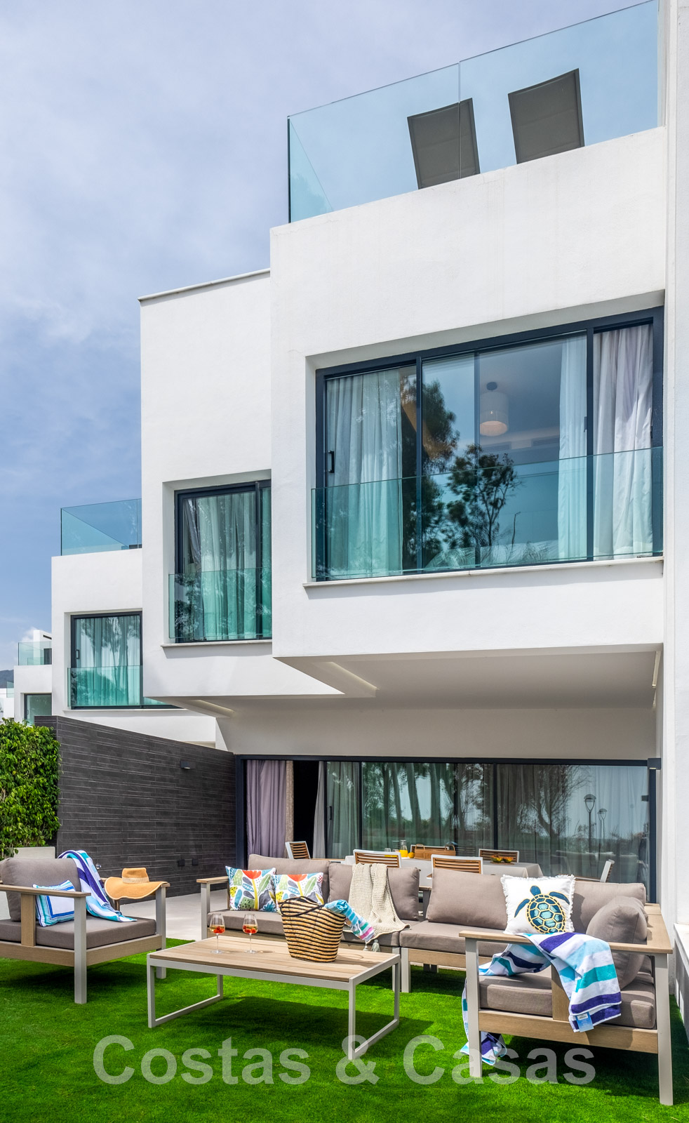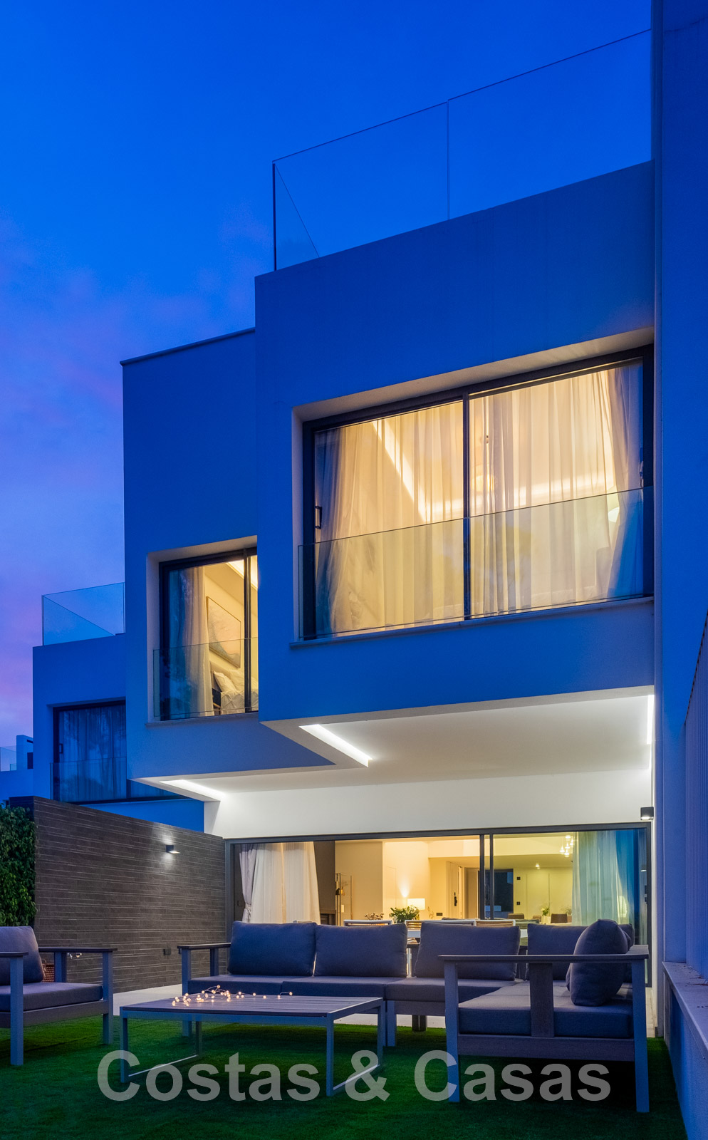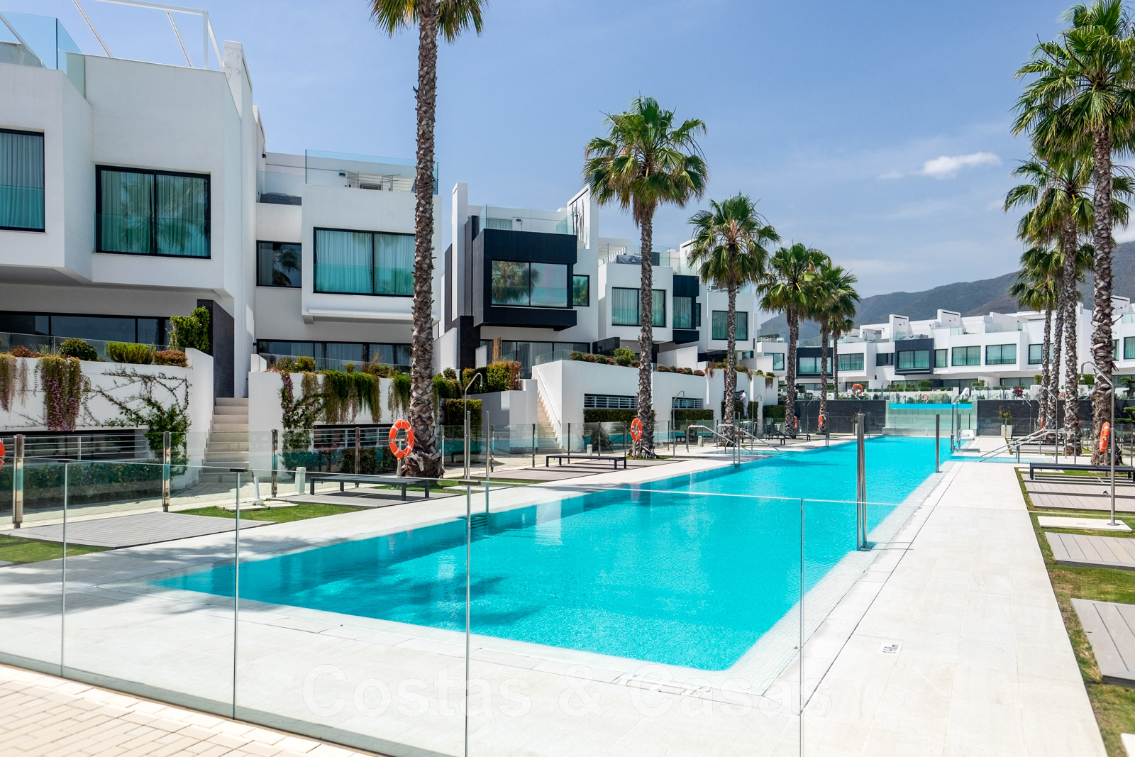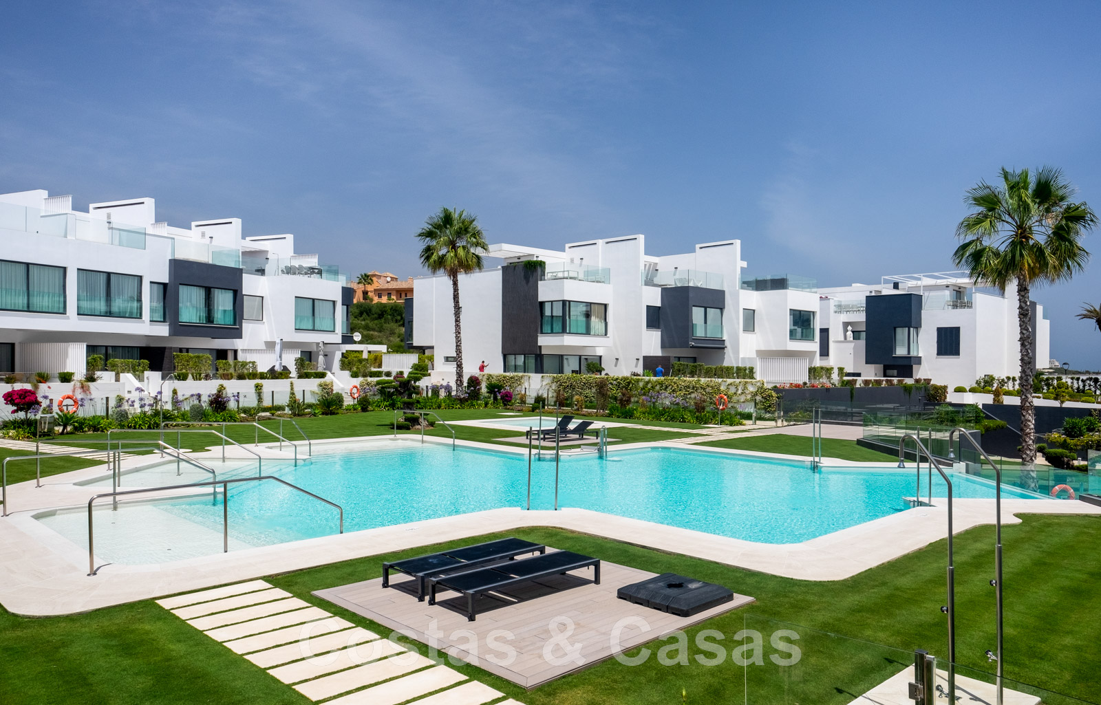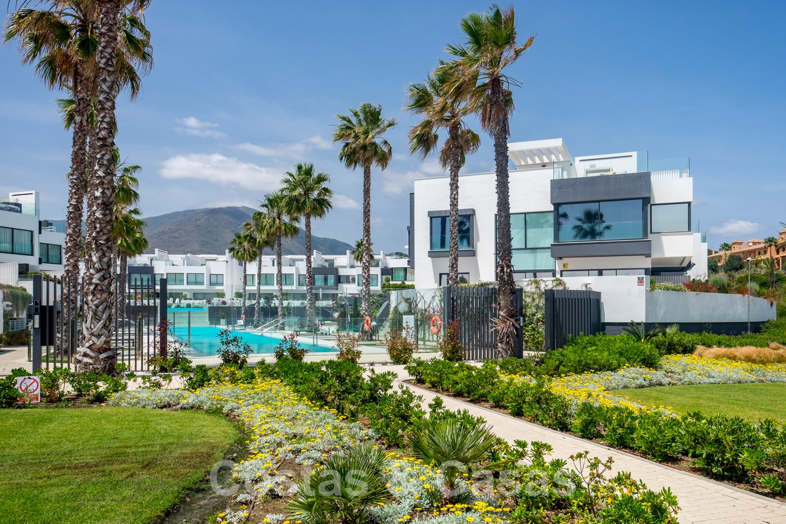 Instapklare, modernistisch hoekhuis met frontaal zeezicht te koop op enkele minuten lopen van Estepona centrum