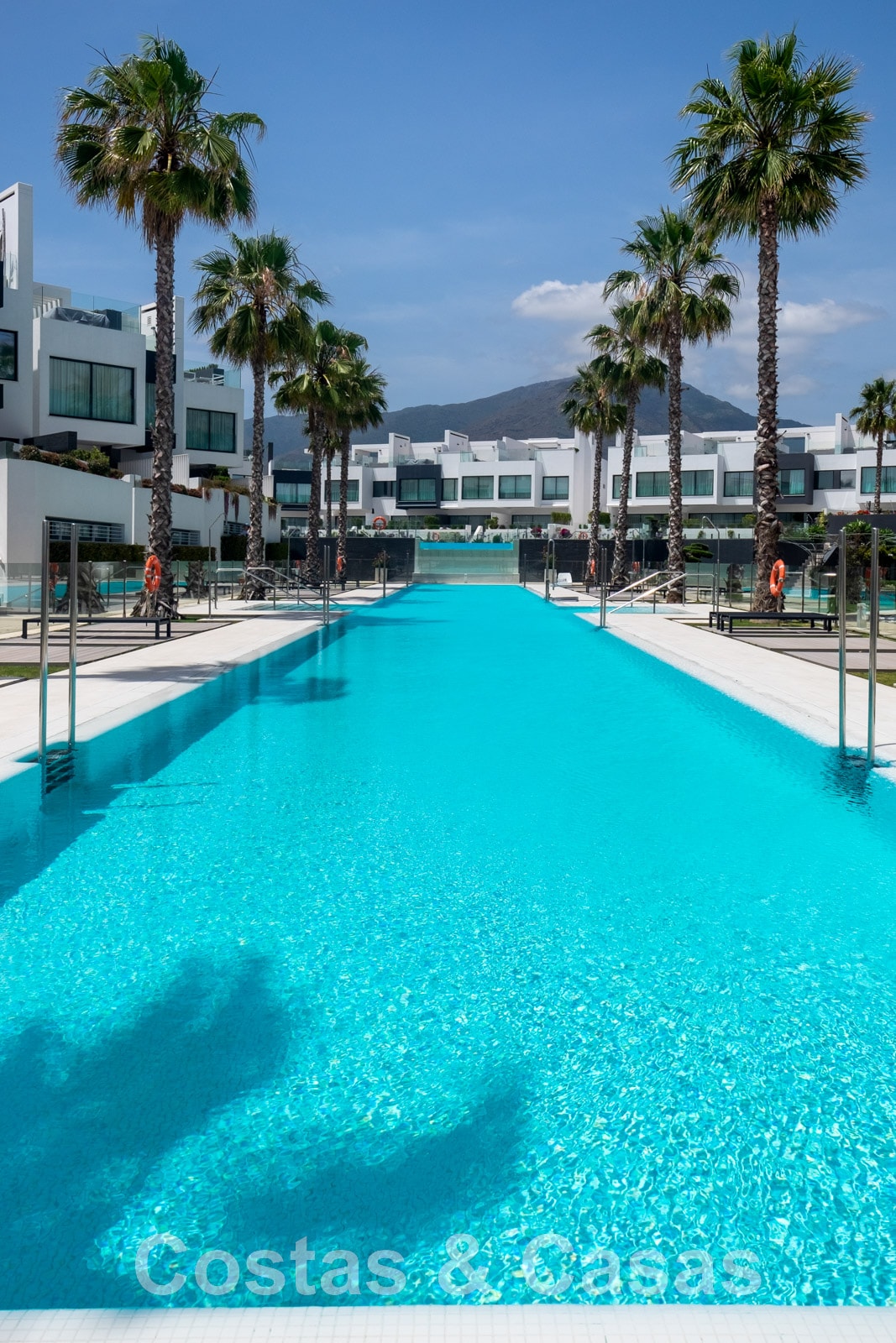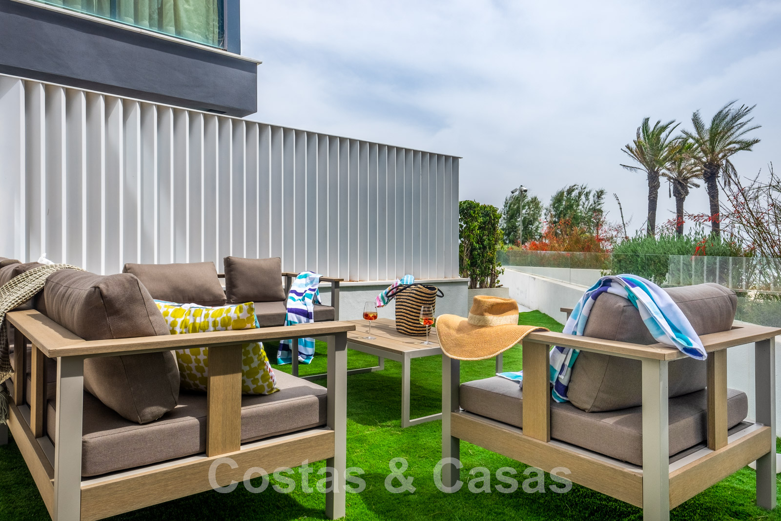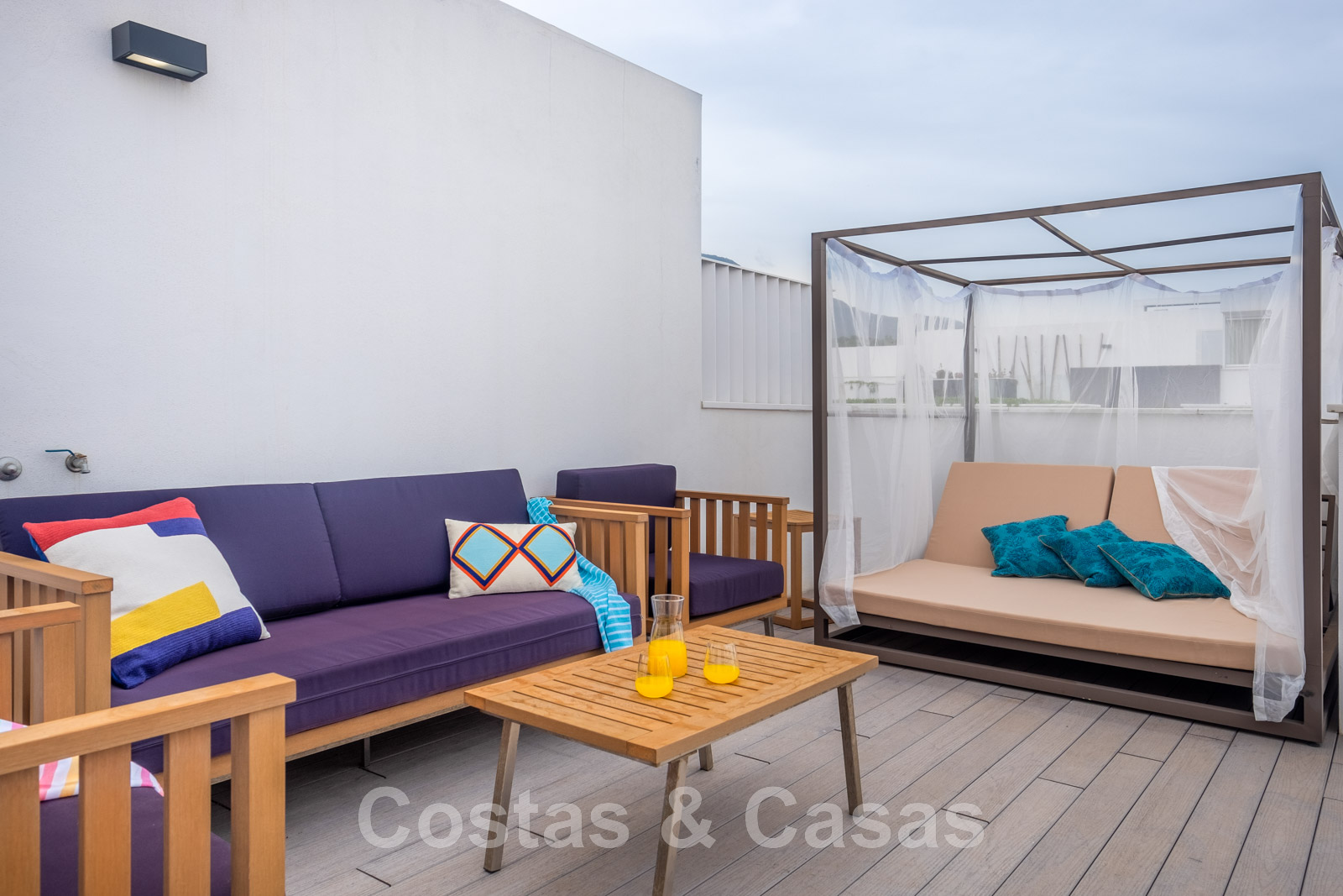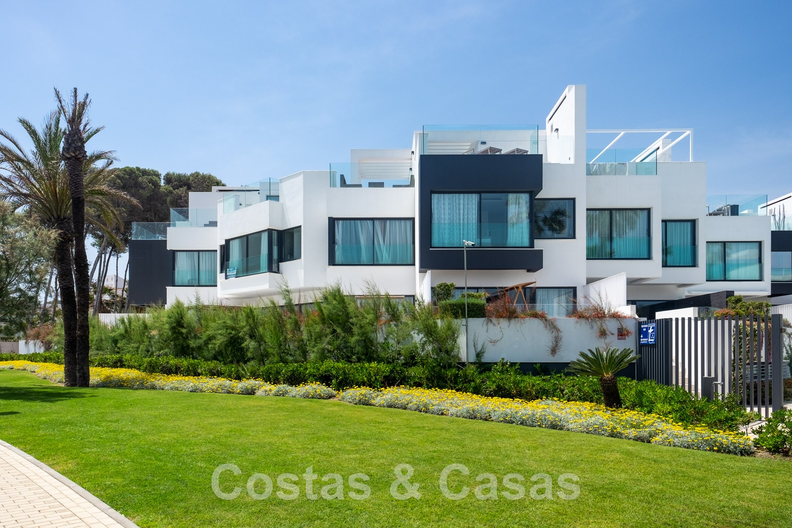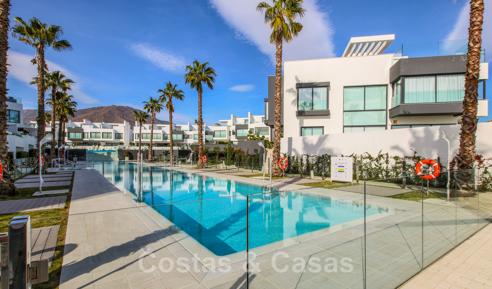 Instapklare, modernistisch hoekhuis met frontaal zeezicht te koop op enkele minuten lopen van Estepona centrum