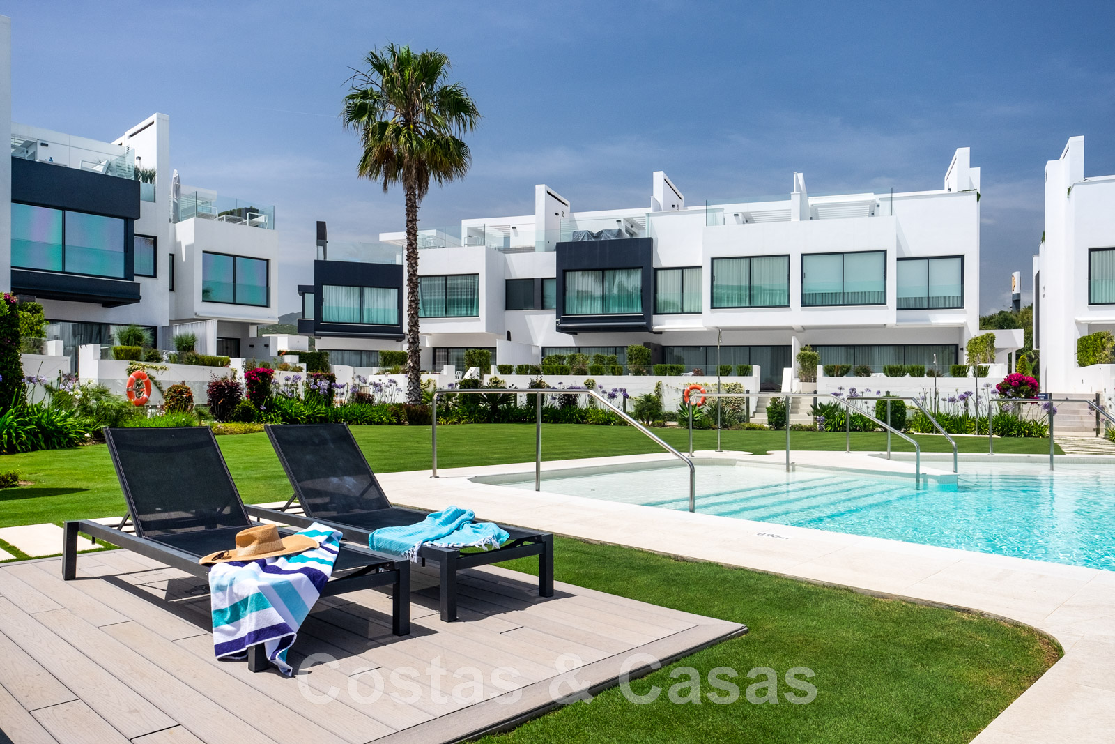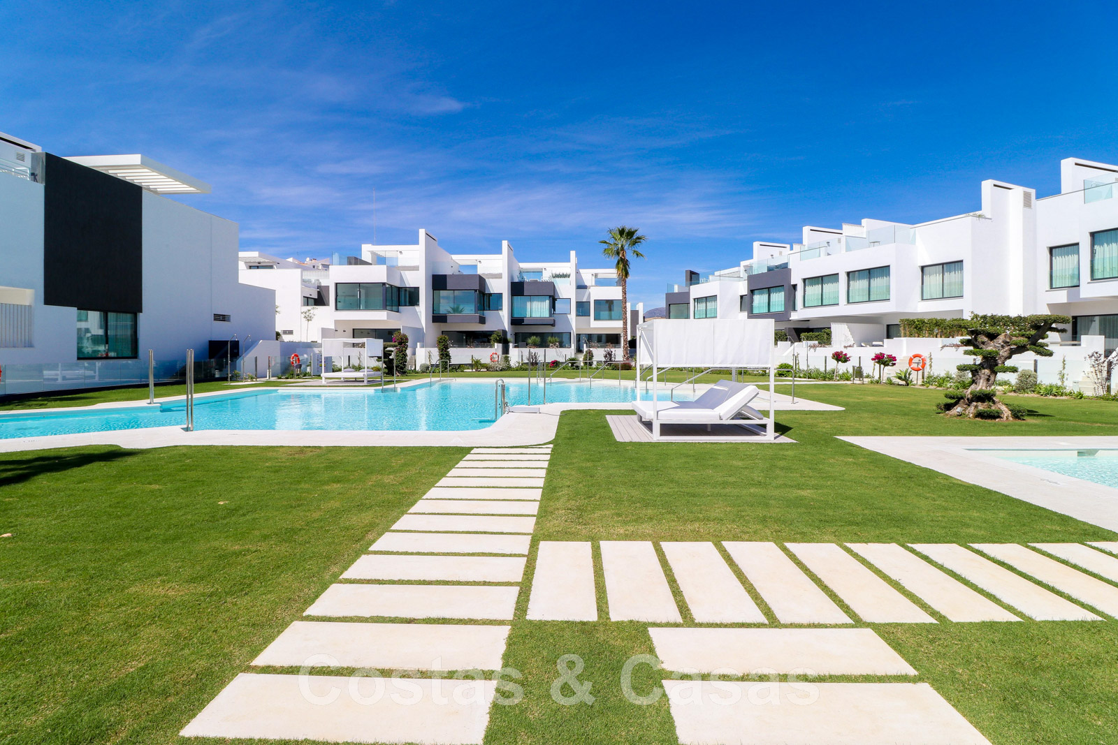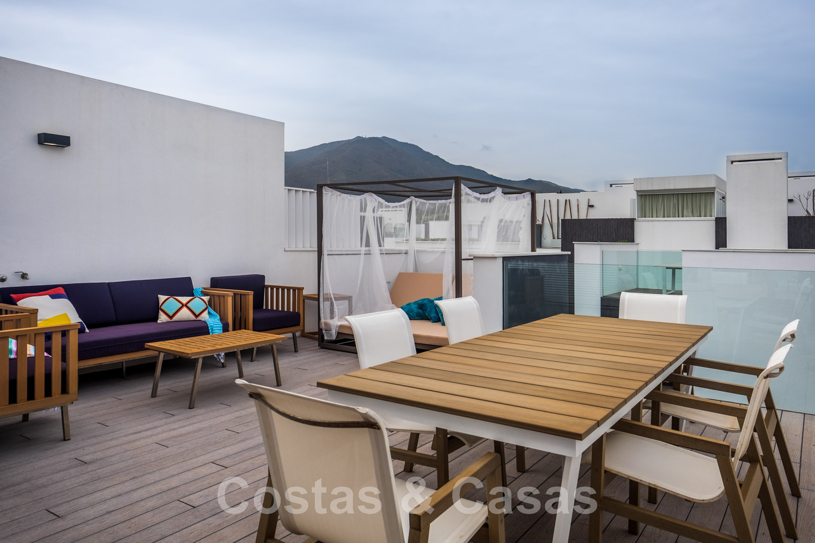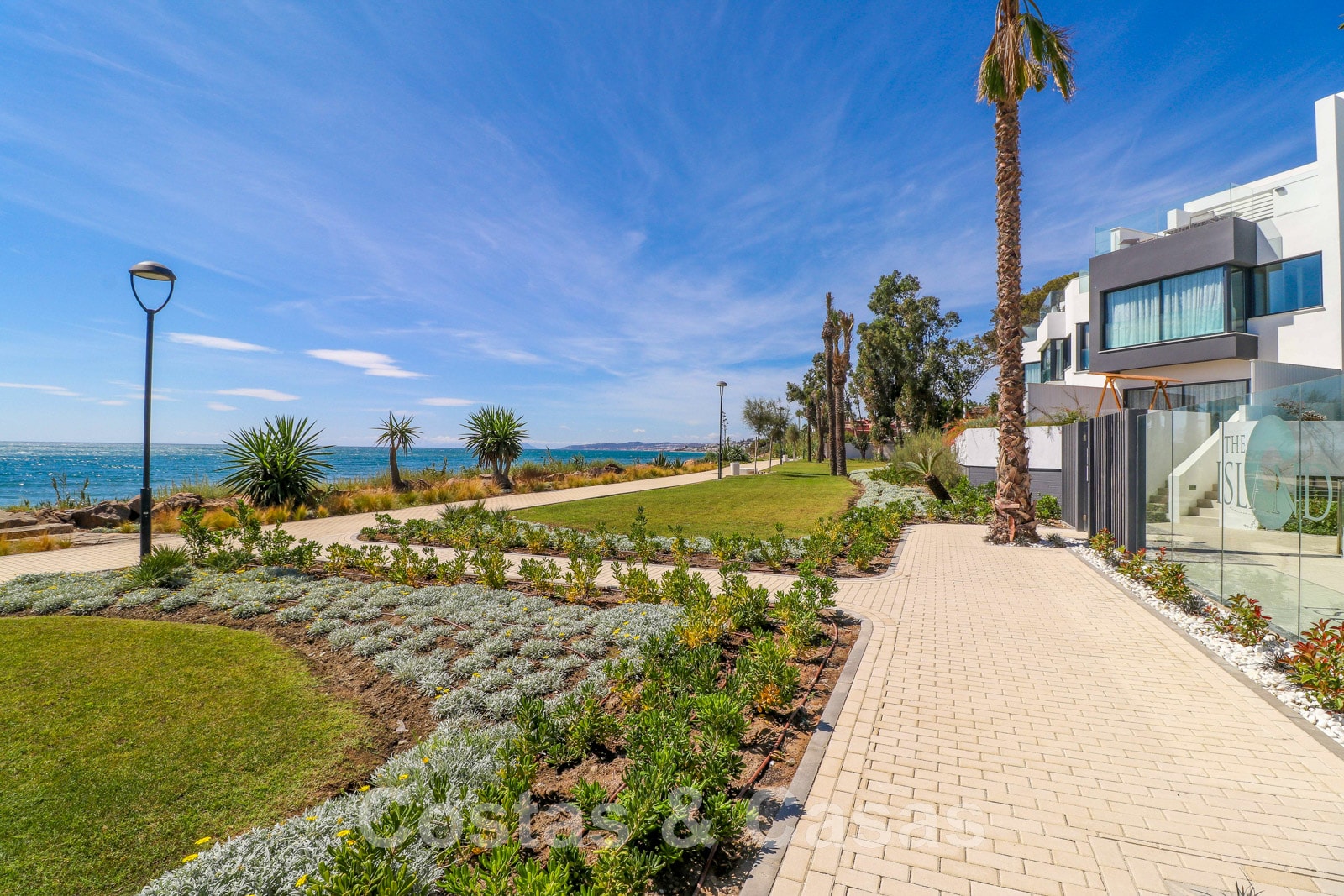 Instapklare, modernistisch hoekhuis met frontaal zeezicht te koop op enkele minuten lopen van Estepona centrum