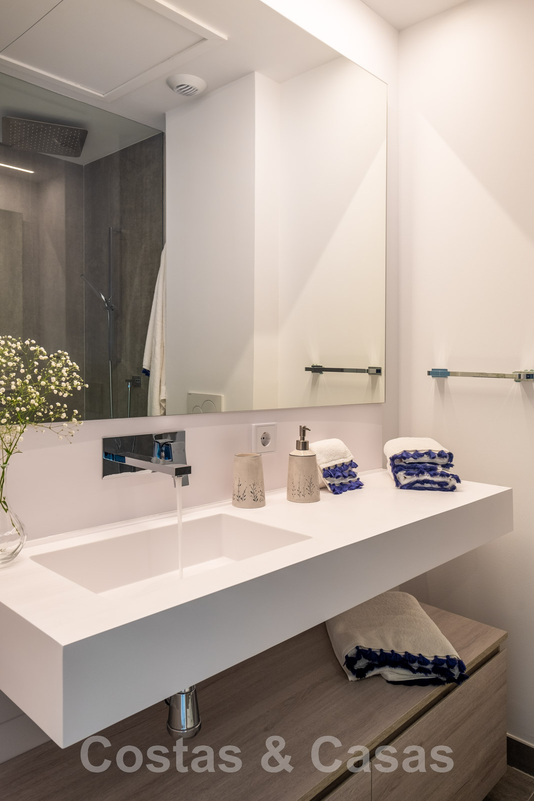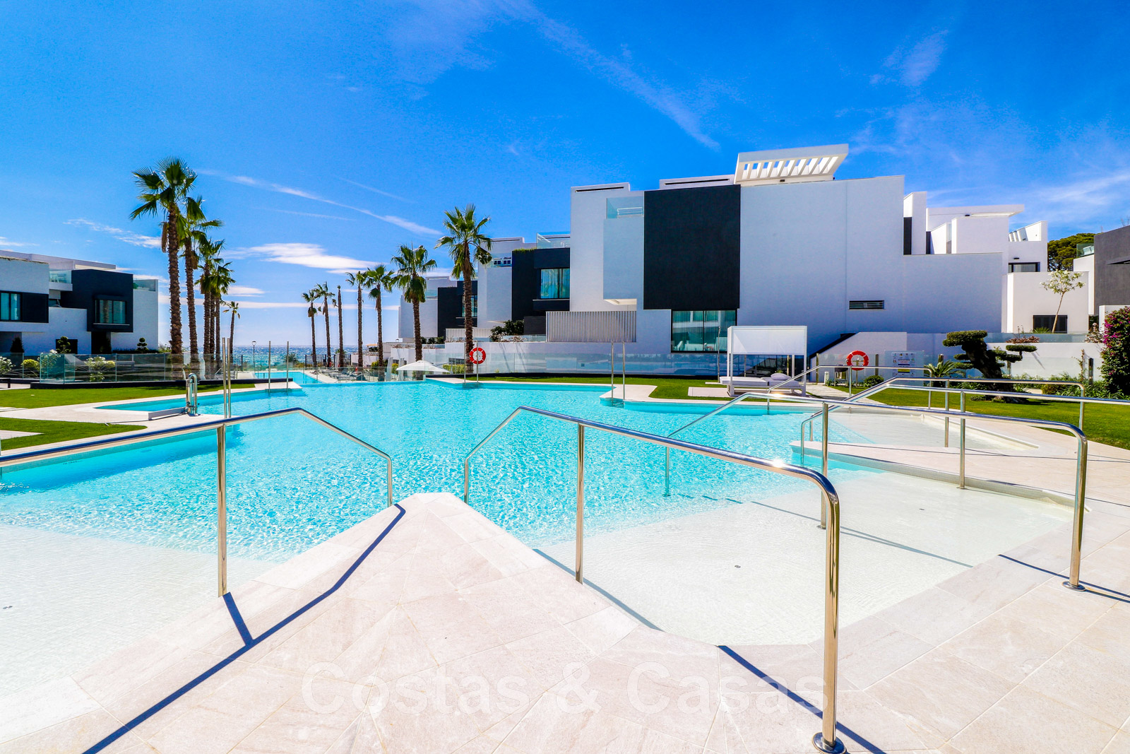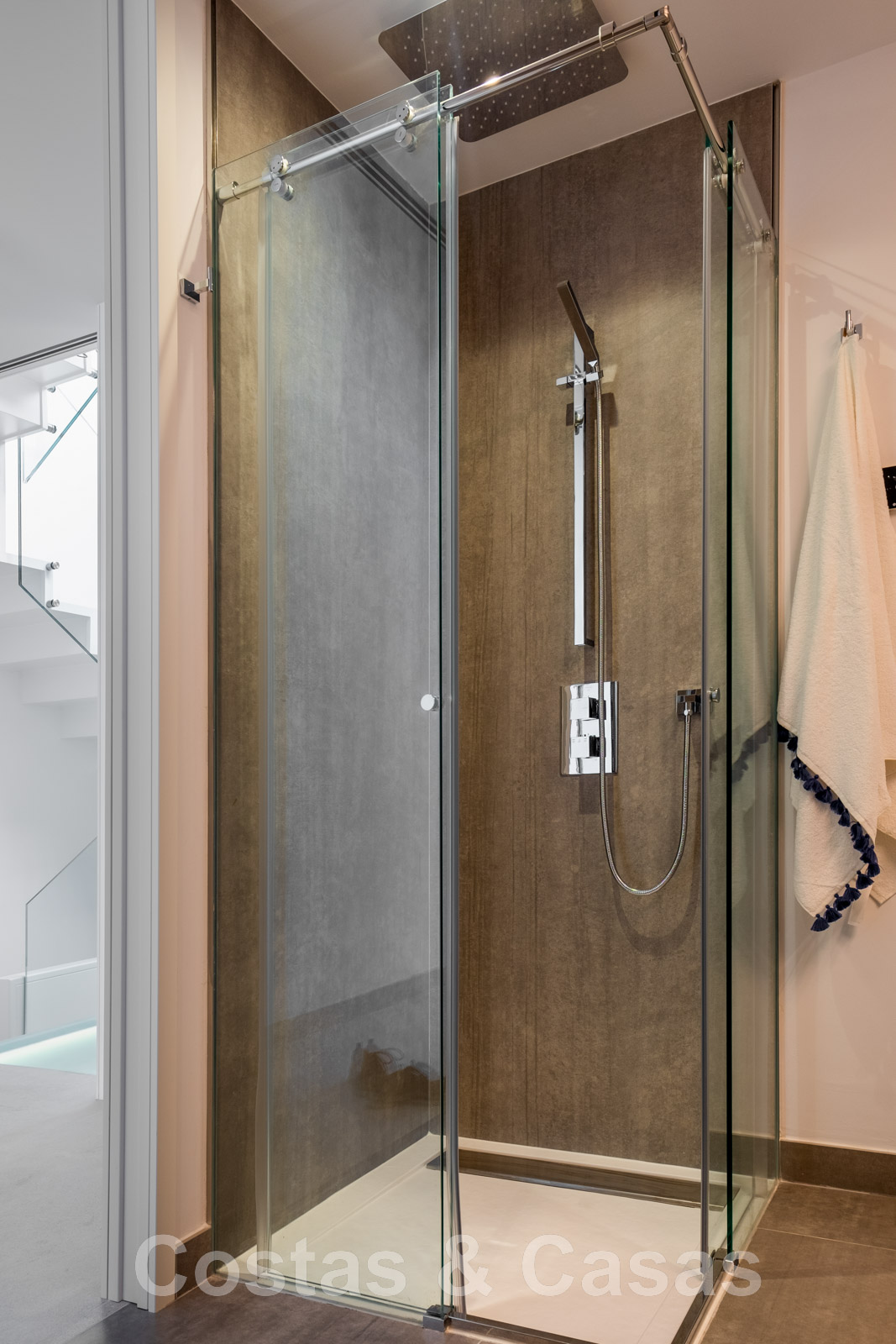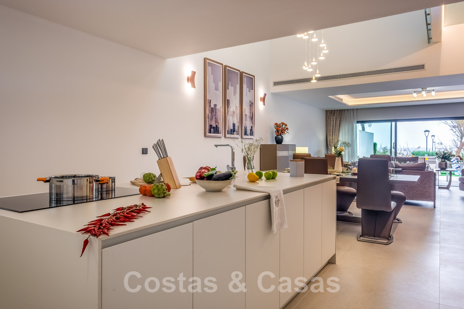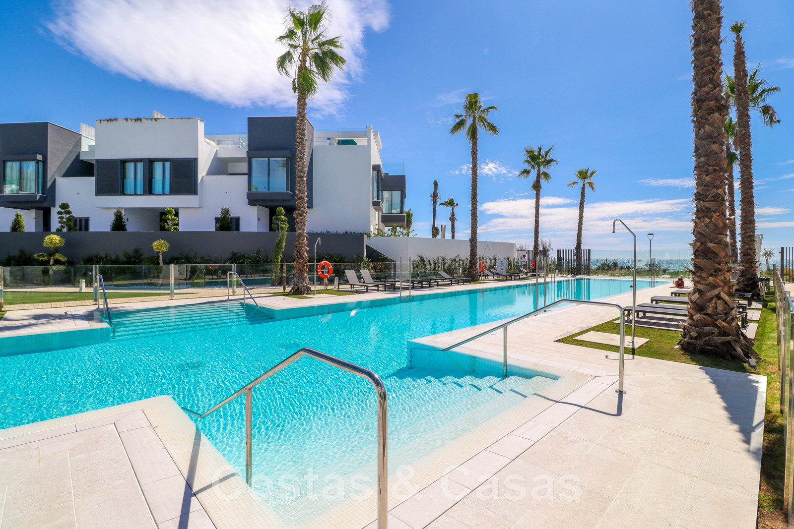 Instapklare, modernistisch hoekhuis met frontaal zeezicht te koop op enkele minuten lopen van Estepona centrum