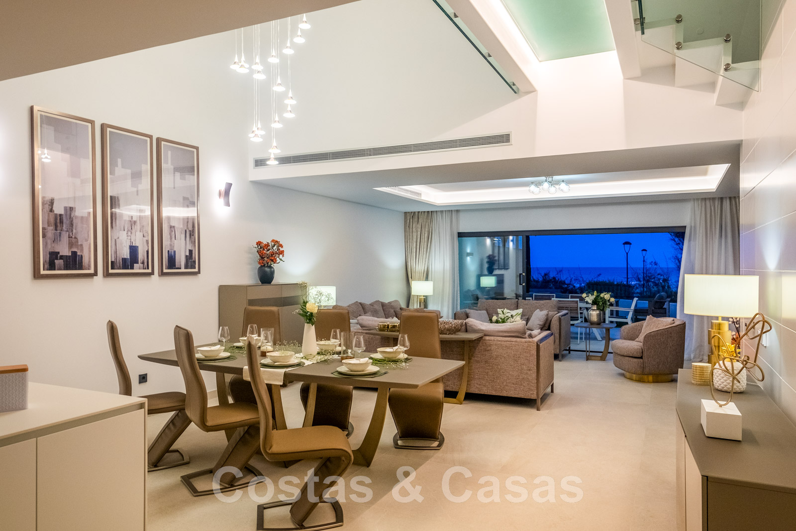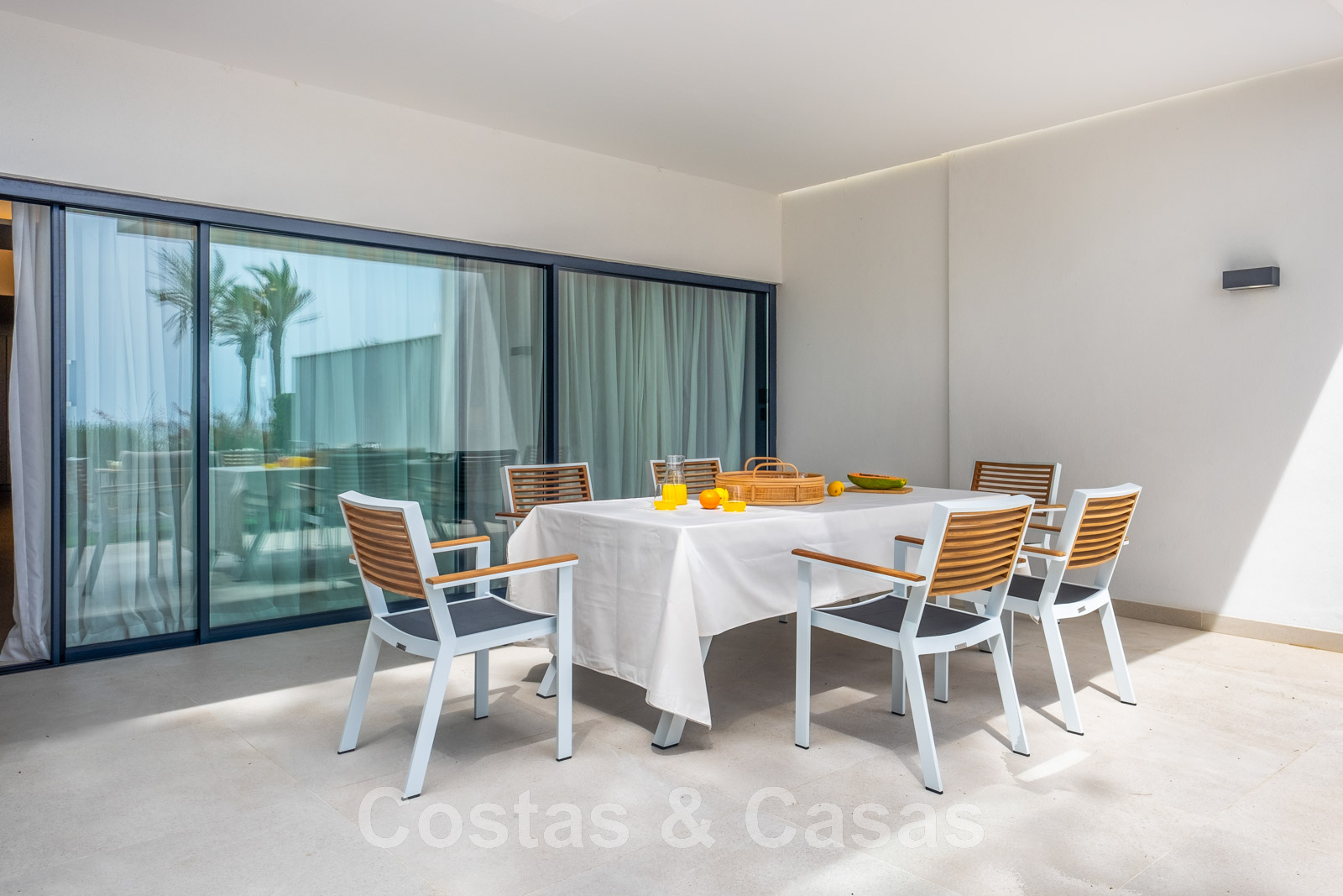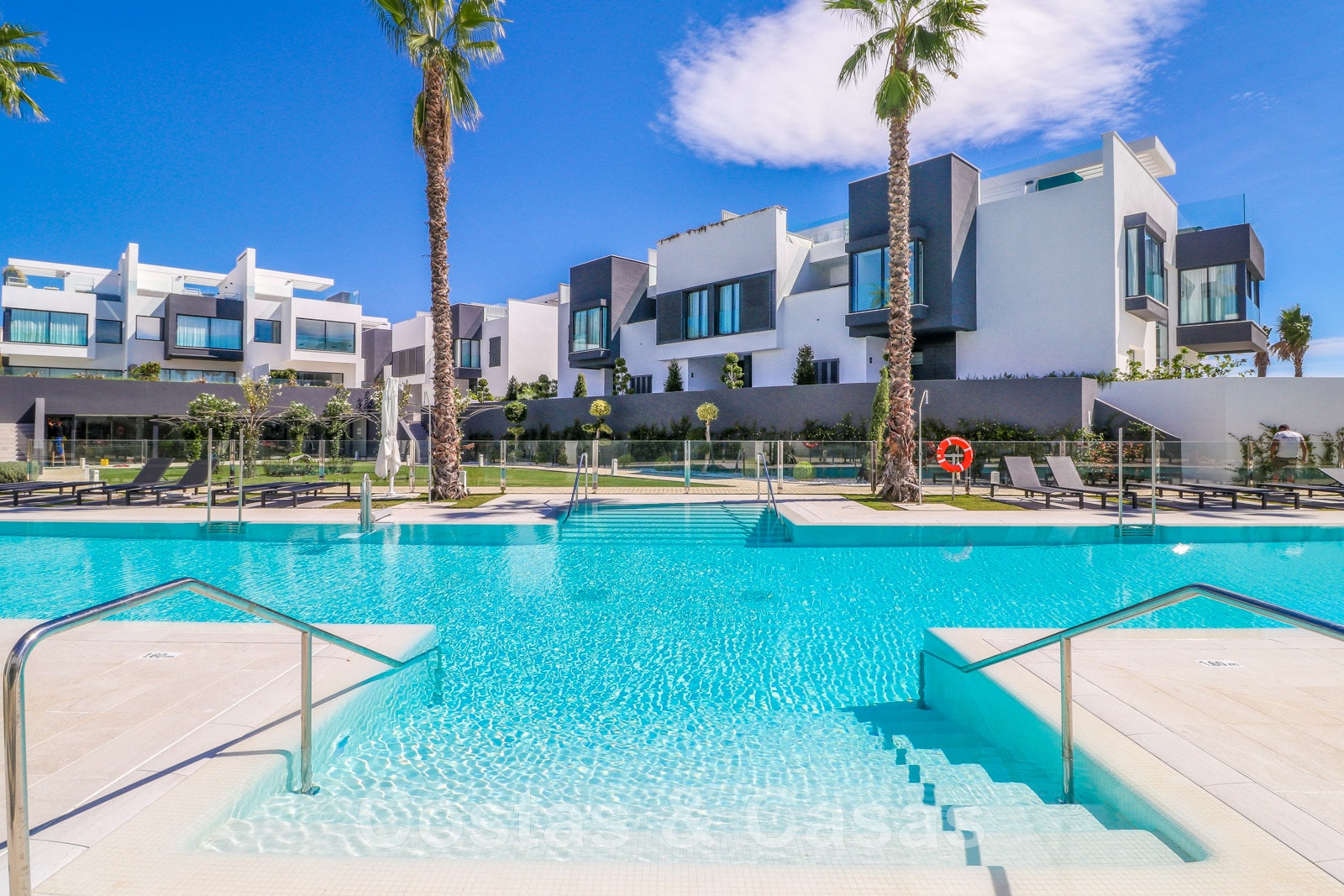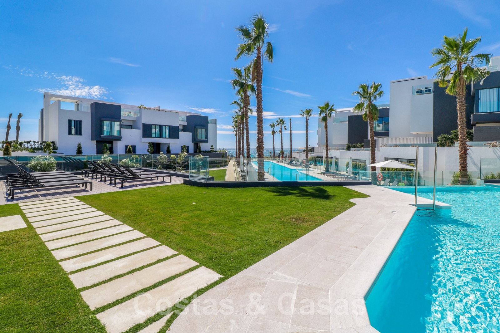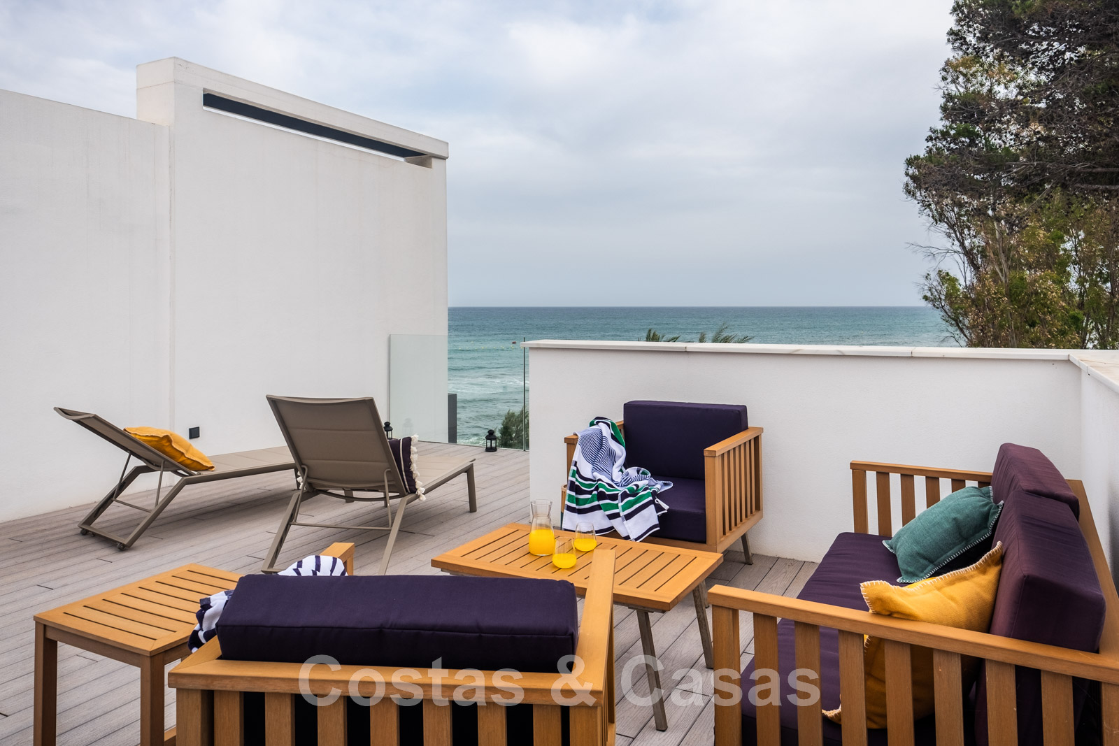 Instapklare, modernistisch hoekhuis met frontaal zeezicht te koop op enkele minuten lopen van Estepona centrum