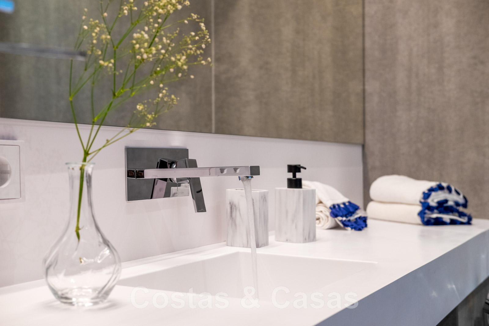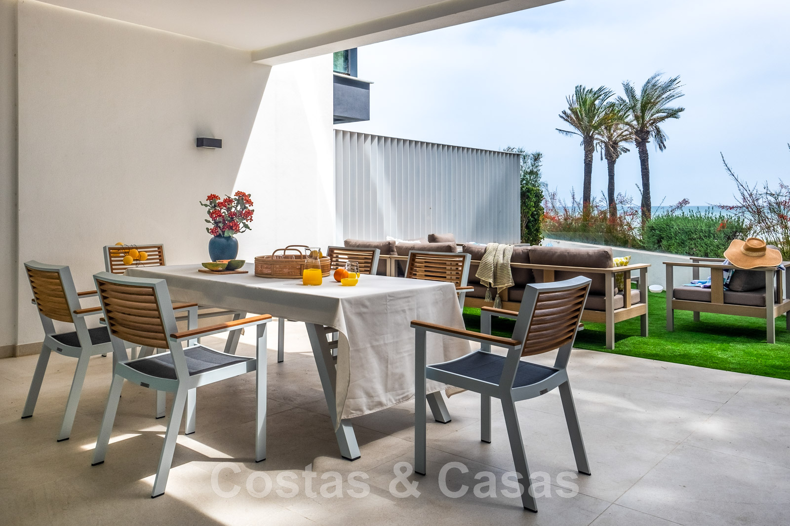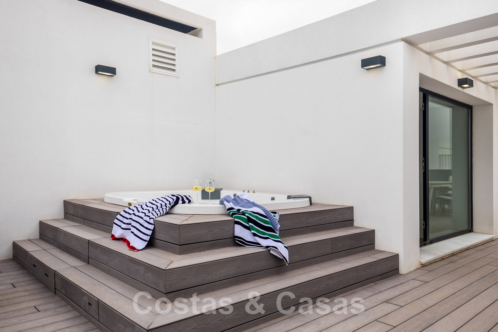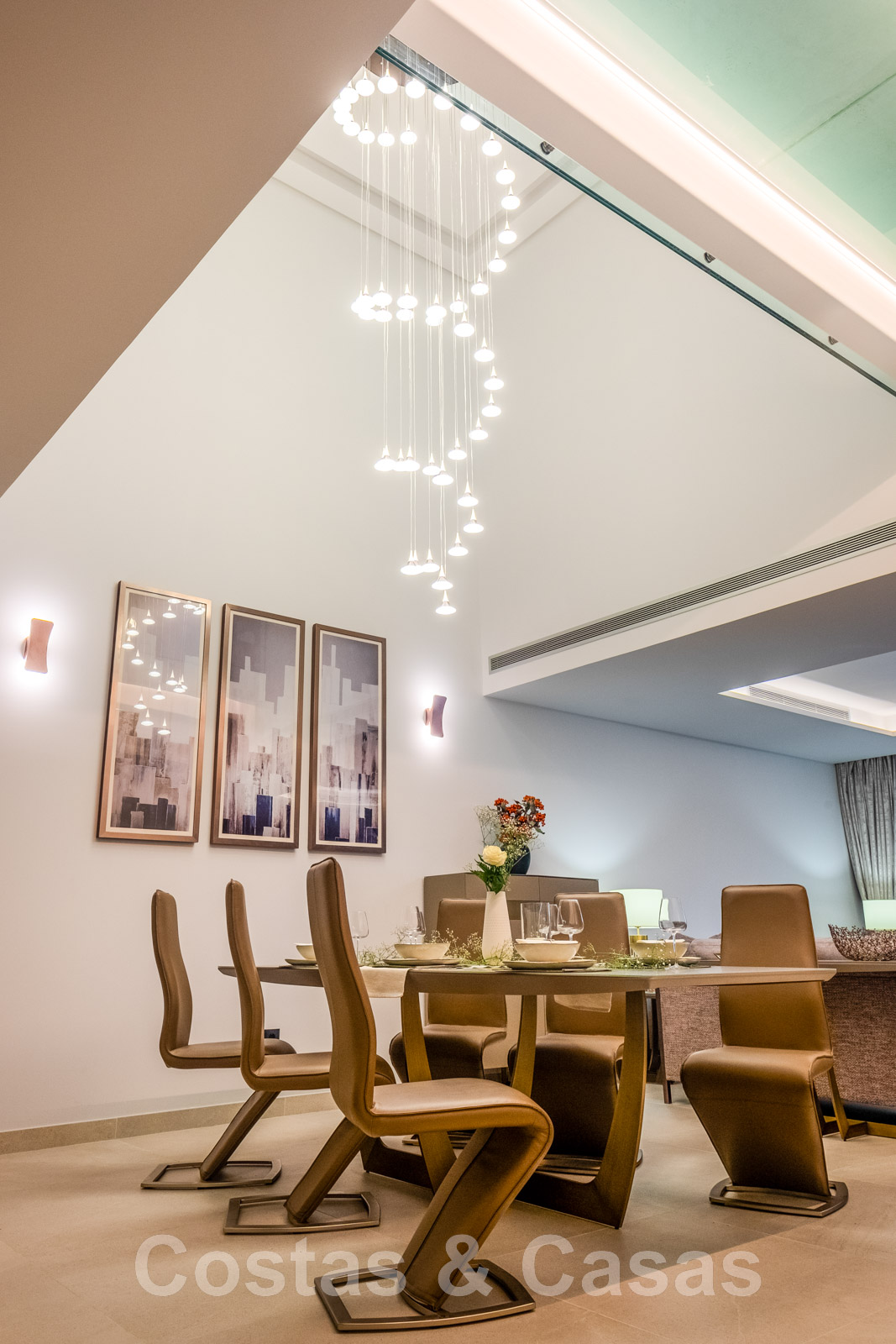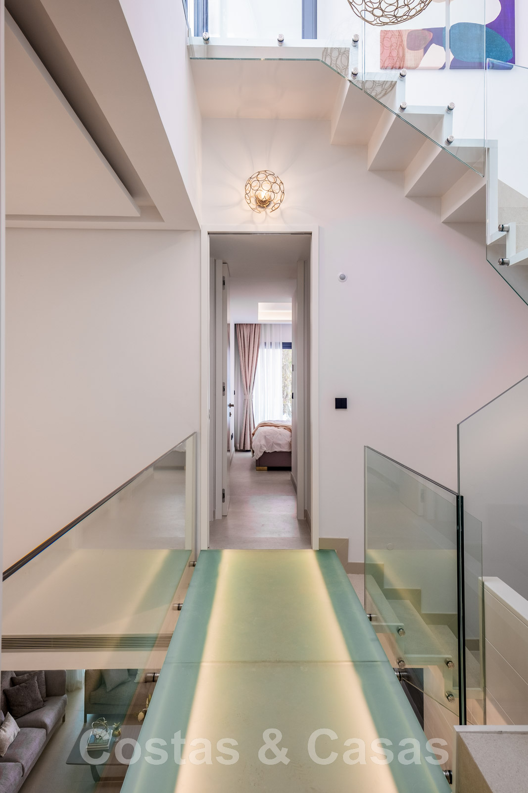 Instapklare, modernistisch hoekhuis met frontaal zeezicht te koop op enkele minuten lopen van Estepona centrum