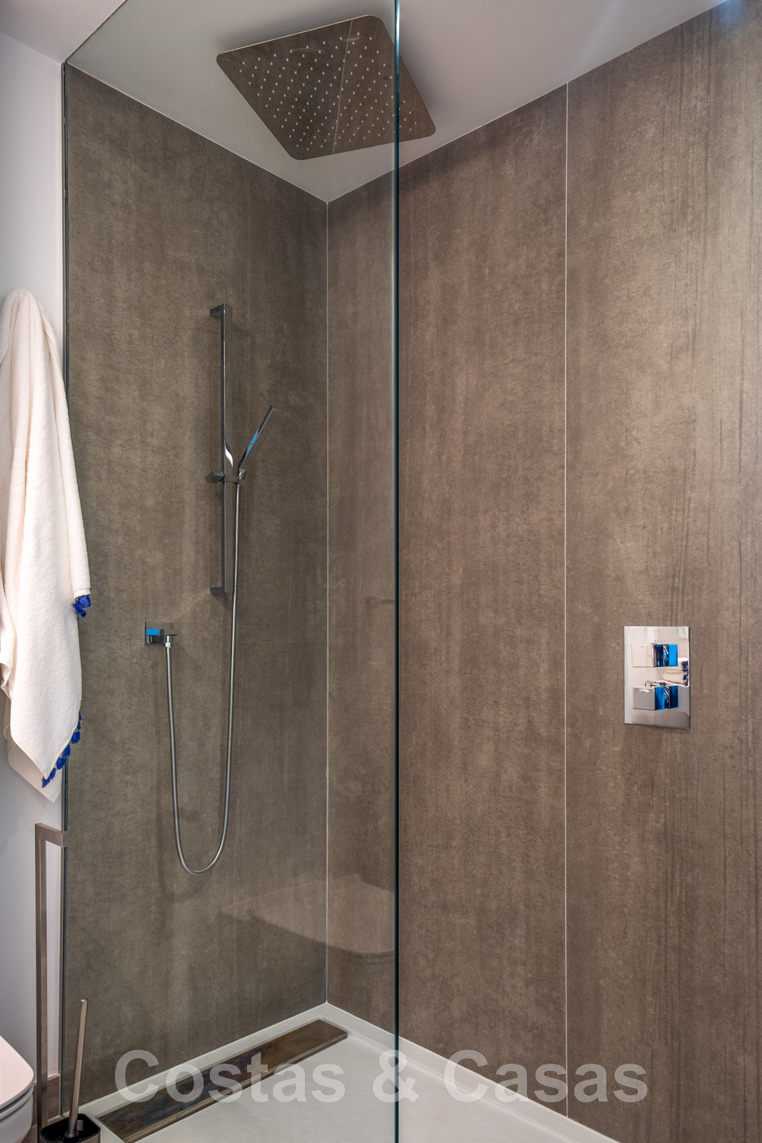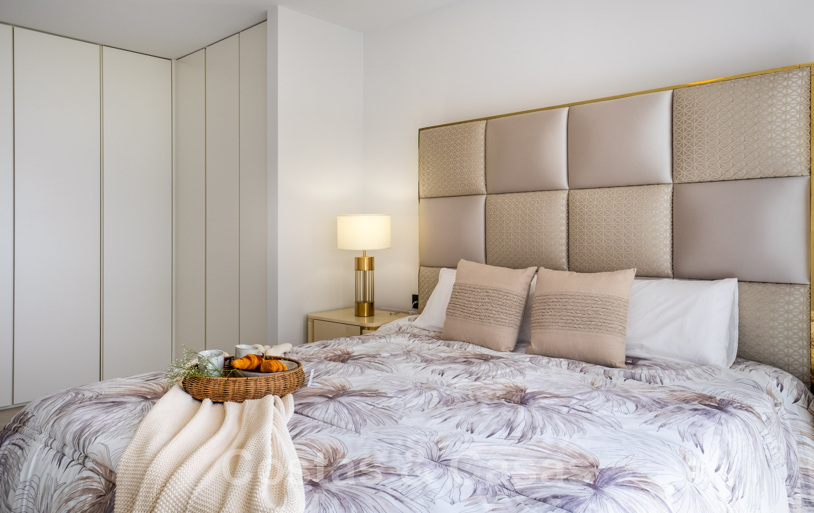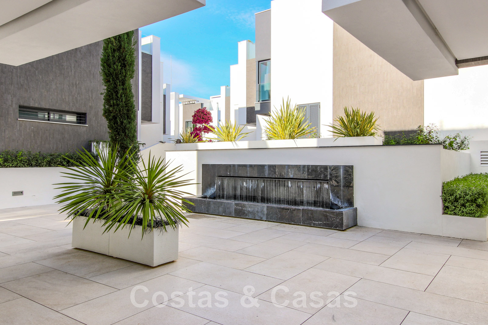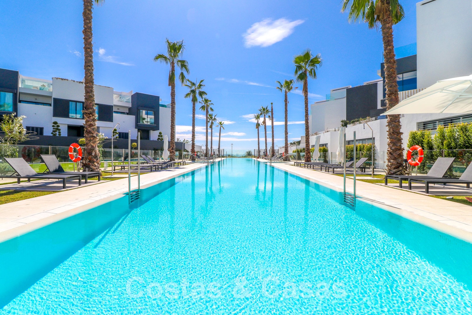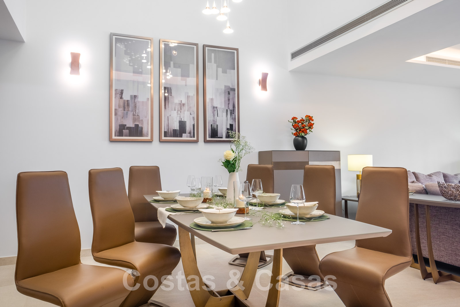 Instapklare, modernistisch hoekhuis met frontaal zeezicht te koop op enkele minuten lopen van Estepona centrum