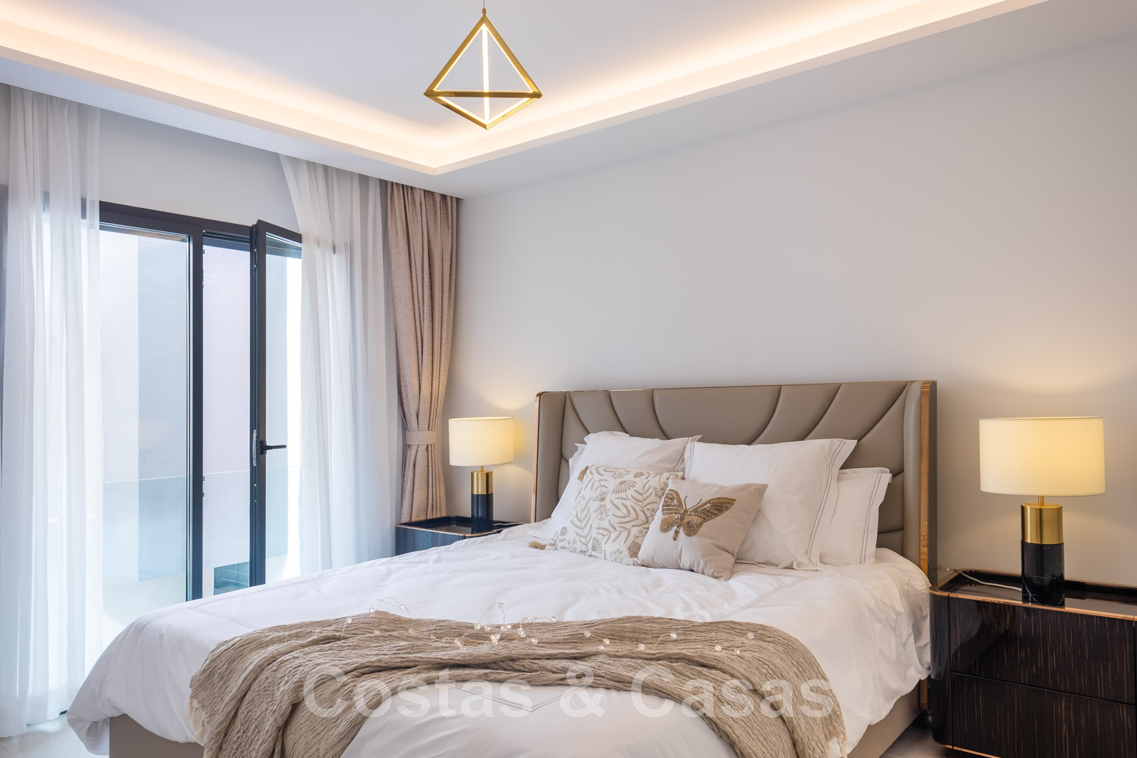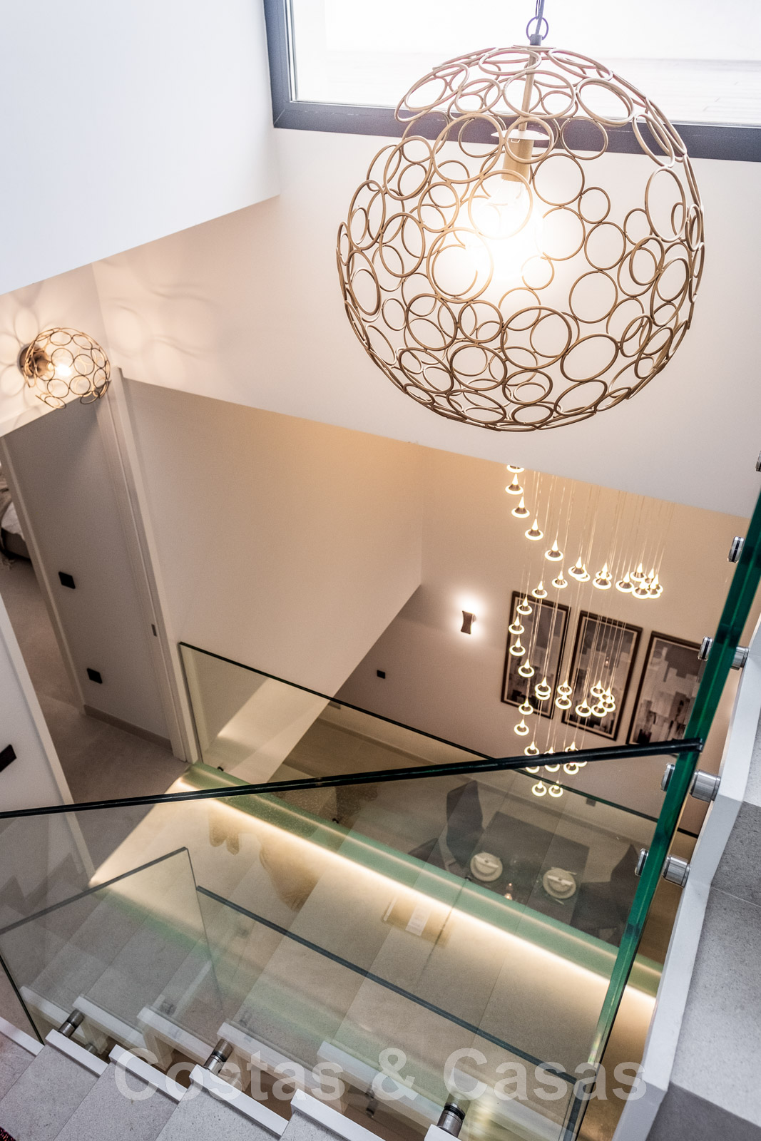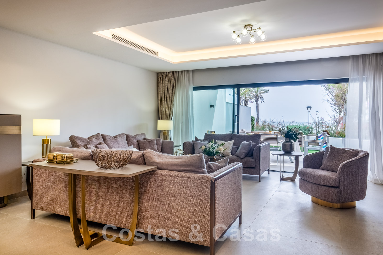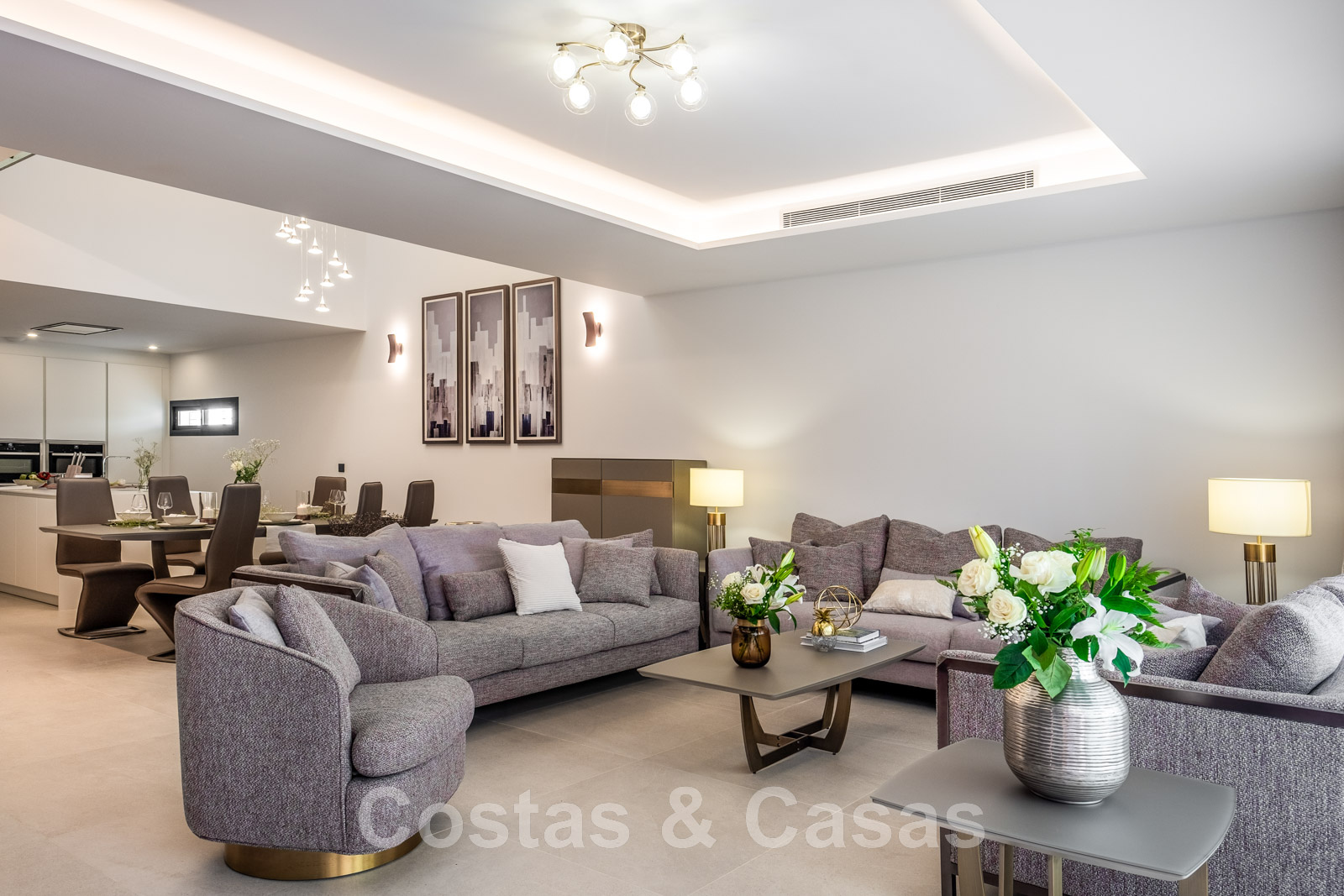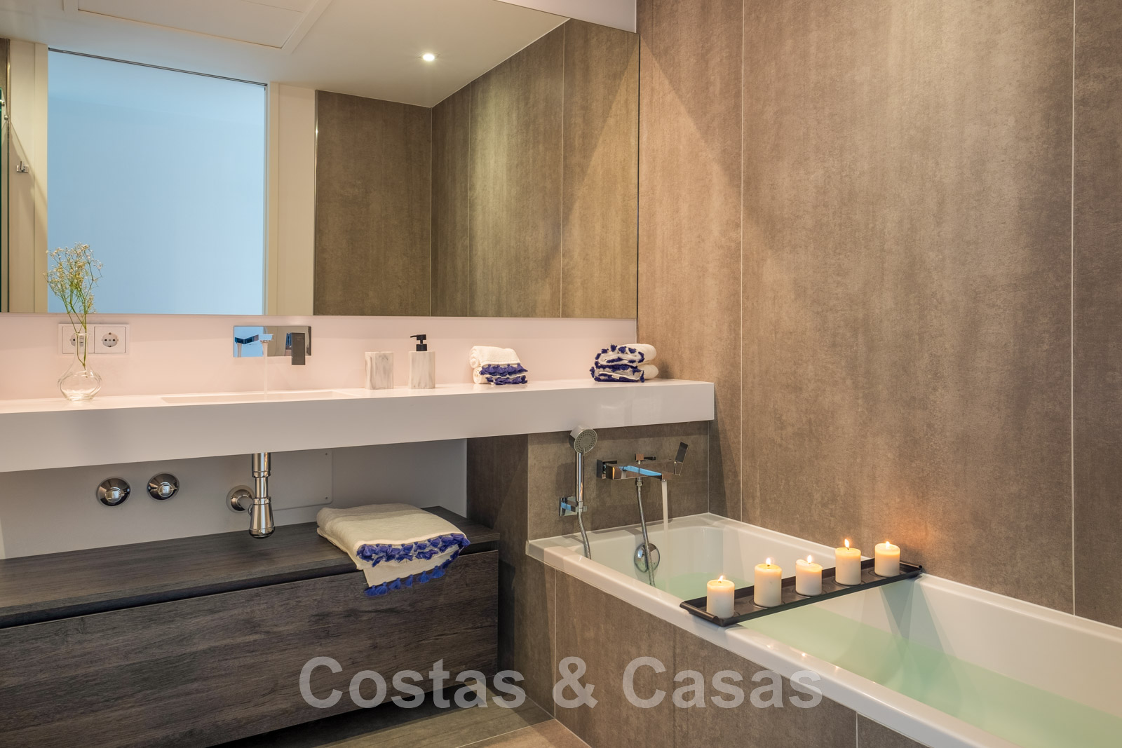 Instapklare, modernistisch hoekhuis met frontaal zeezicht te koop op enkele minuten lopen van Estepona centrum