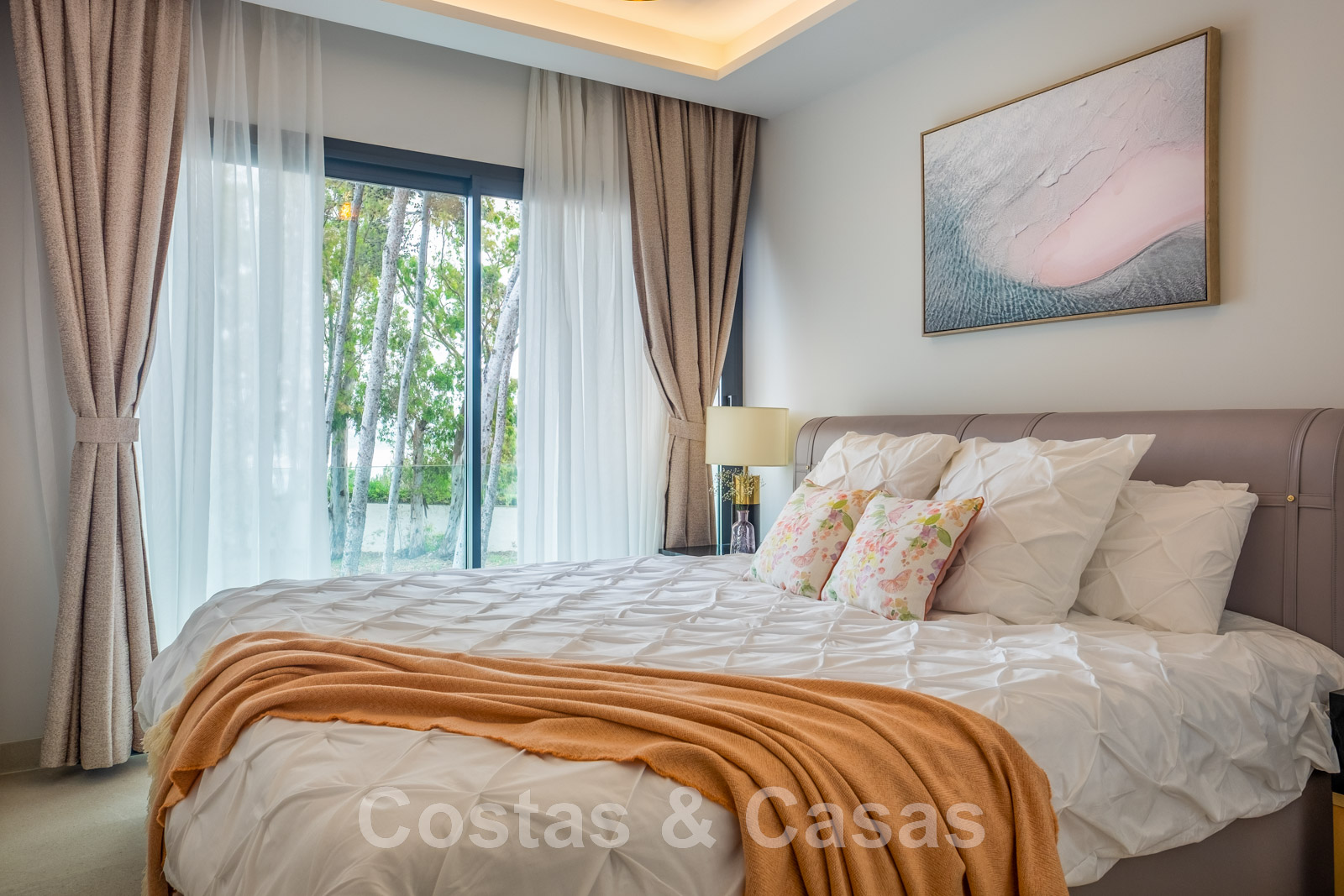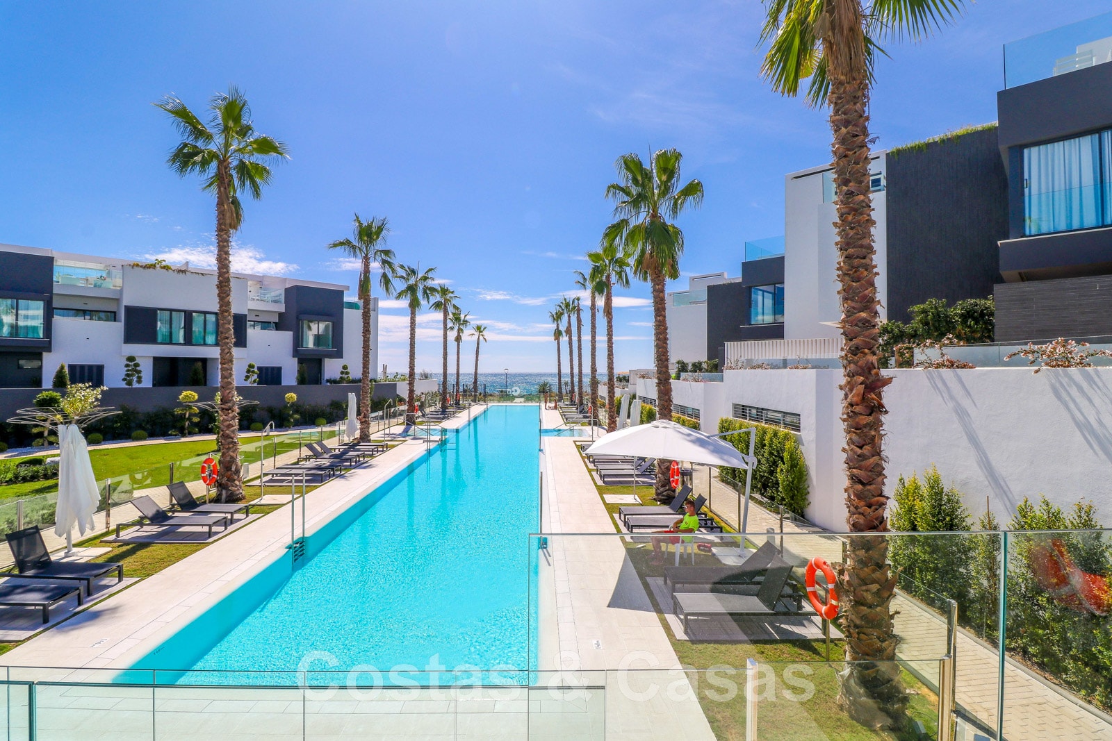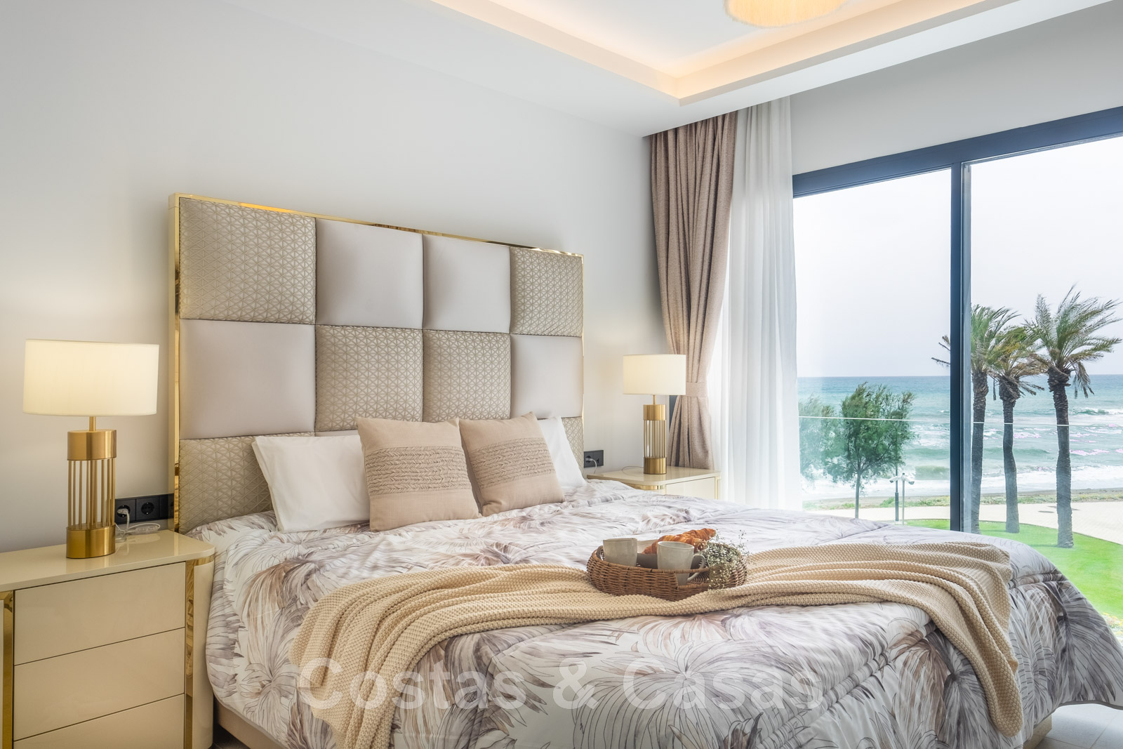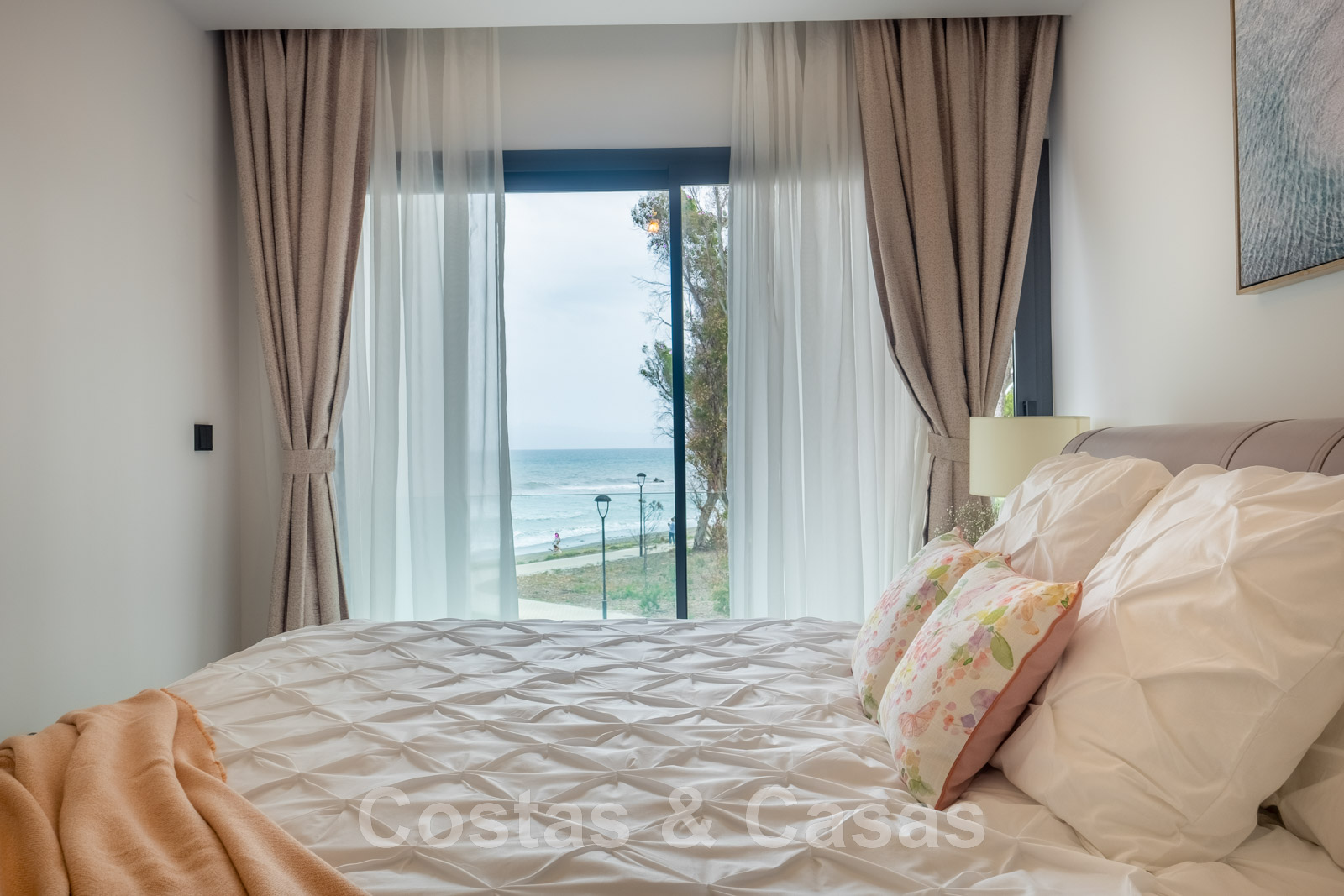 Instapklare, modernistisch hoekhuis met frontaal zeezicht te koop op enkele minuten lopen van Estepona centrum