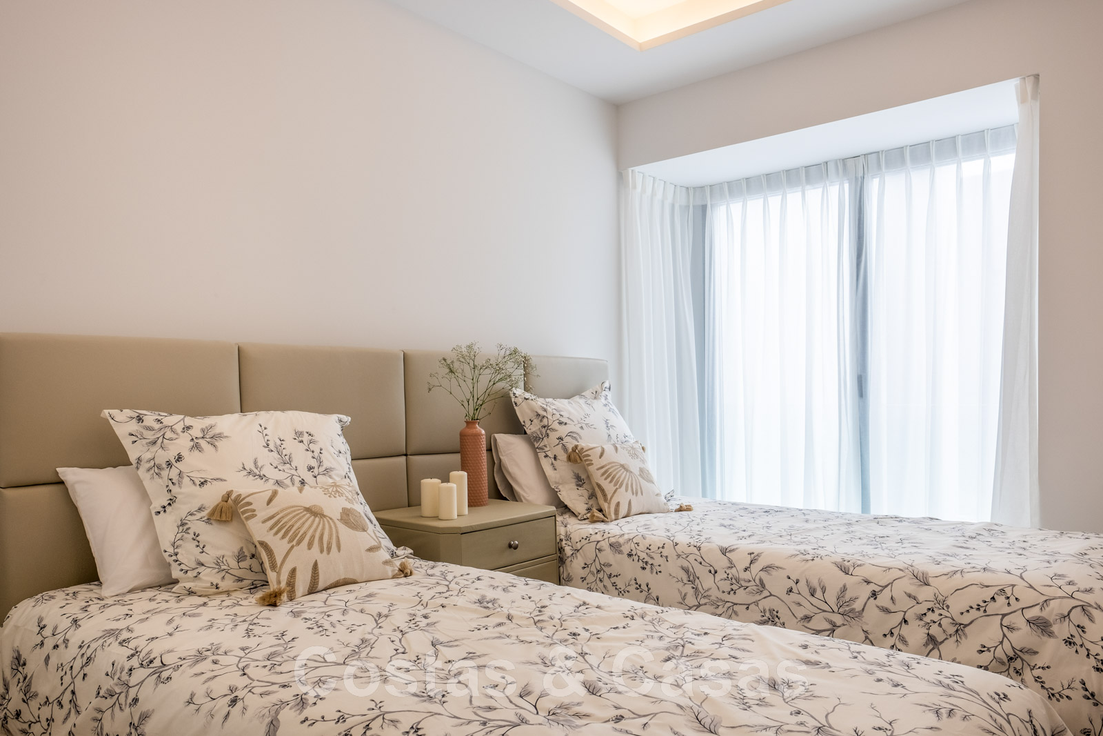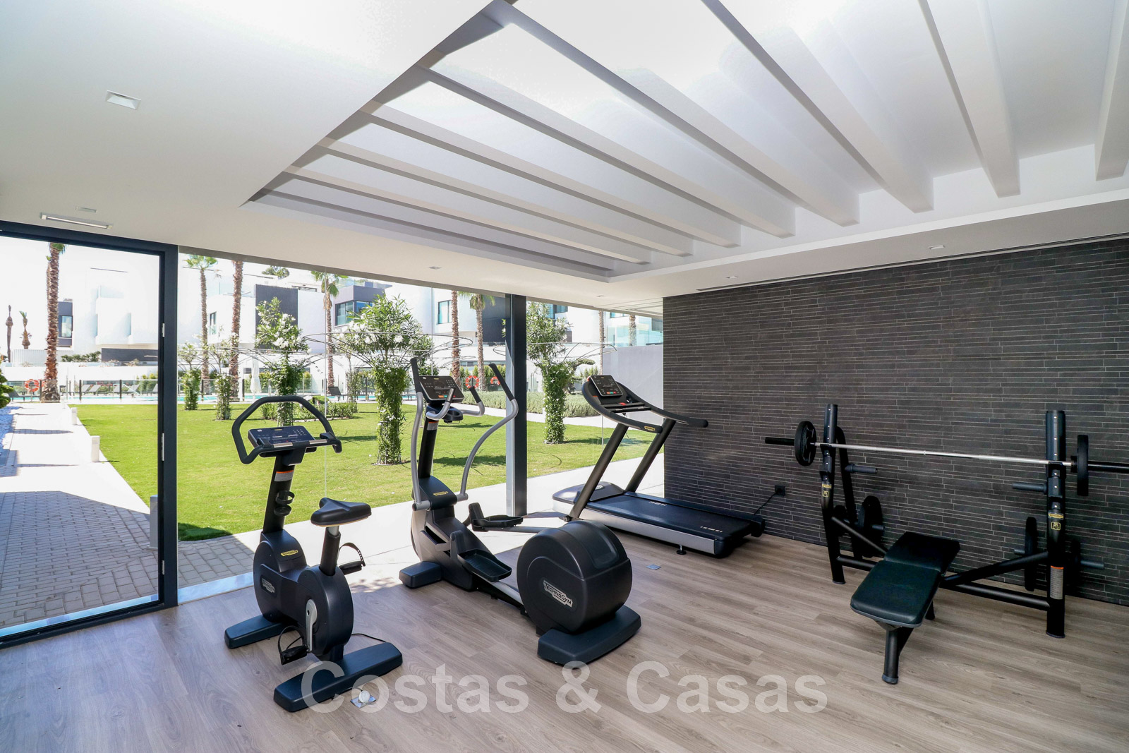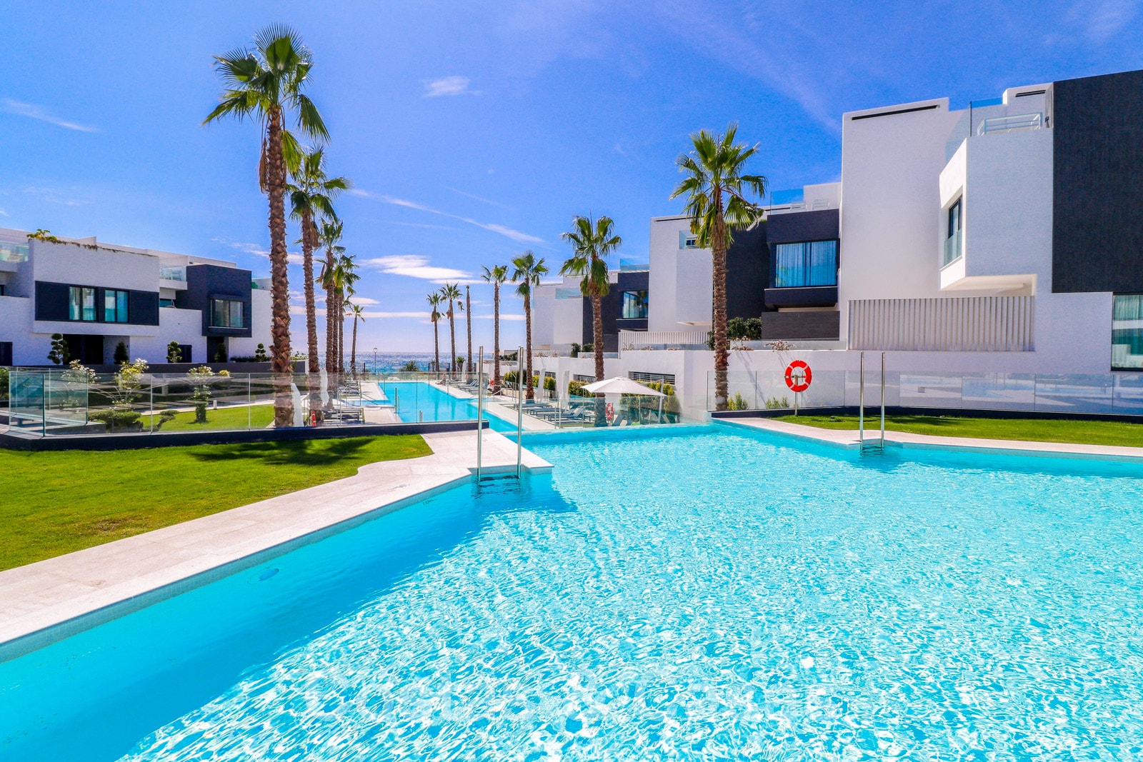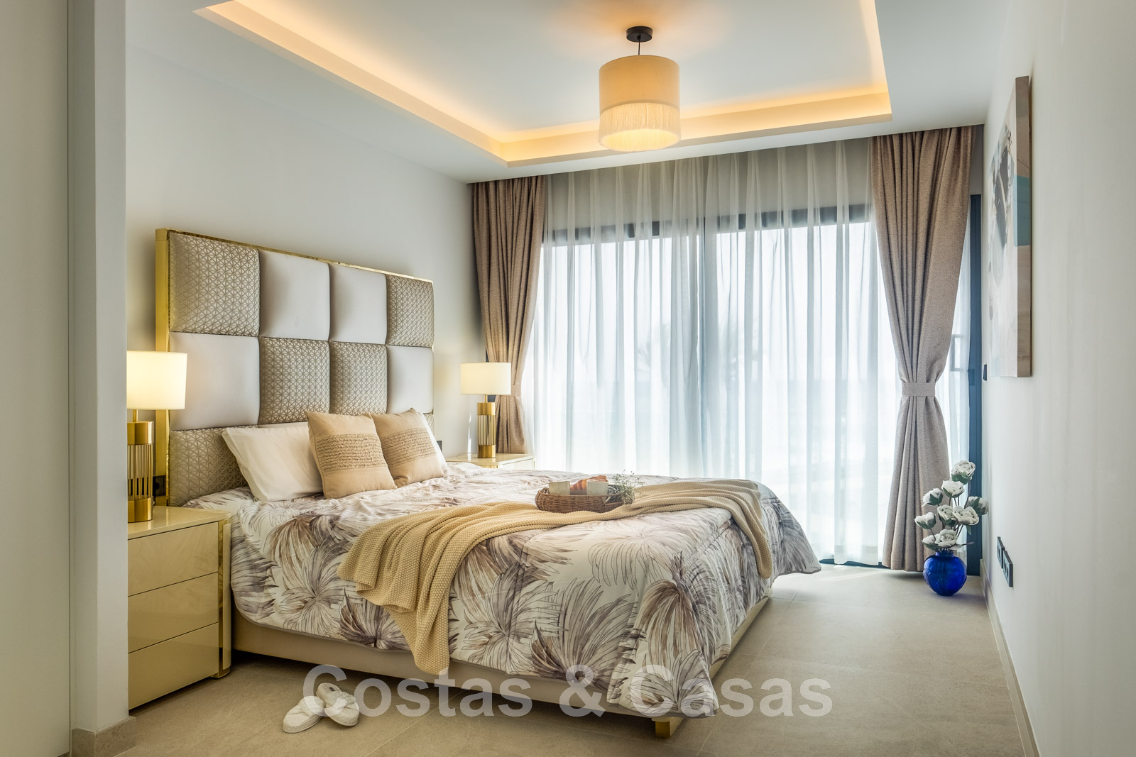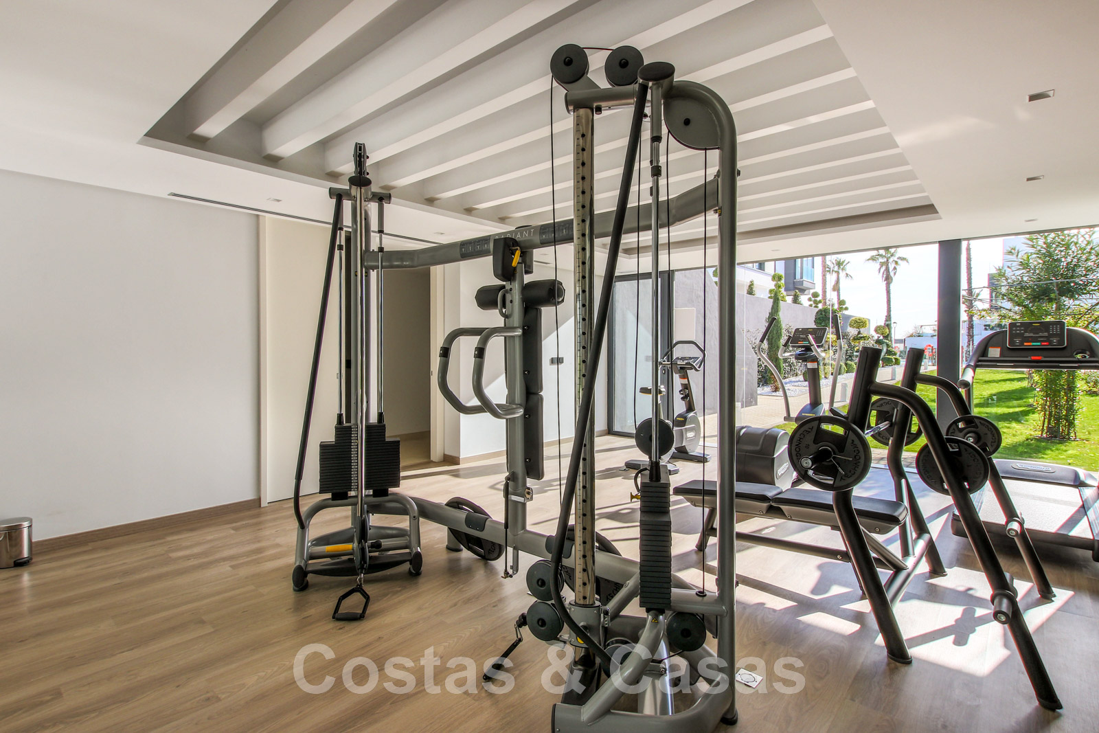 Instapklare, modernistisch hoekhuis met frontaal zeezicht te koop op enkele minuten lopen van Estepona centrum