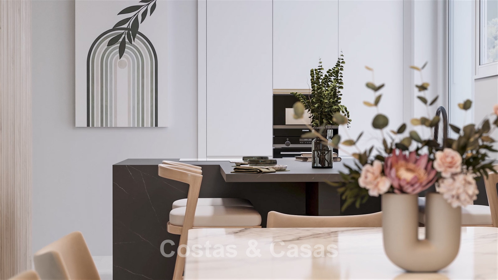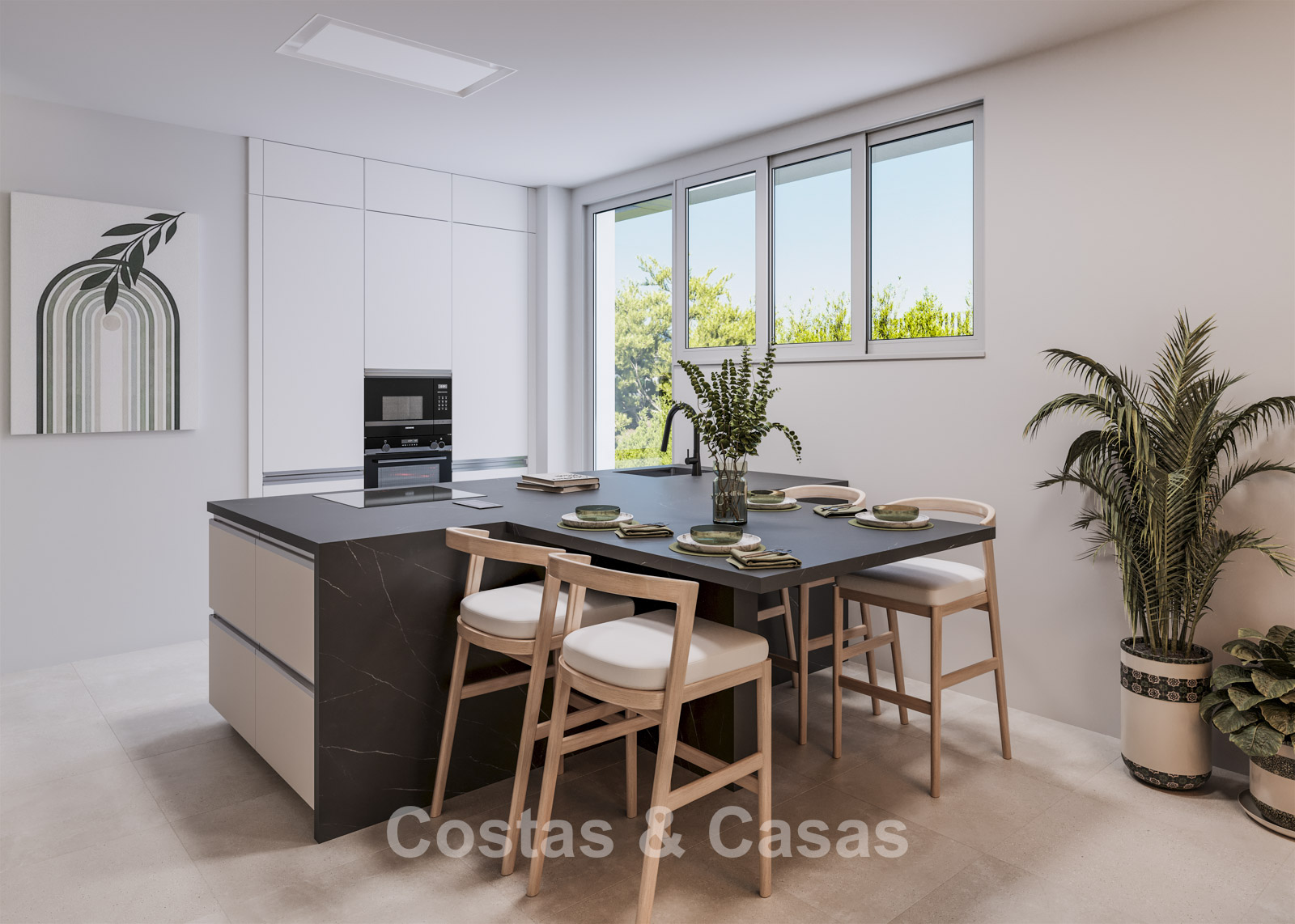 Open kwaliteitskeuken, uitgerust met Siemens toestoestellen en een centraal ziteiland.