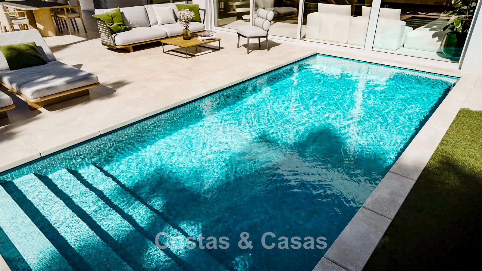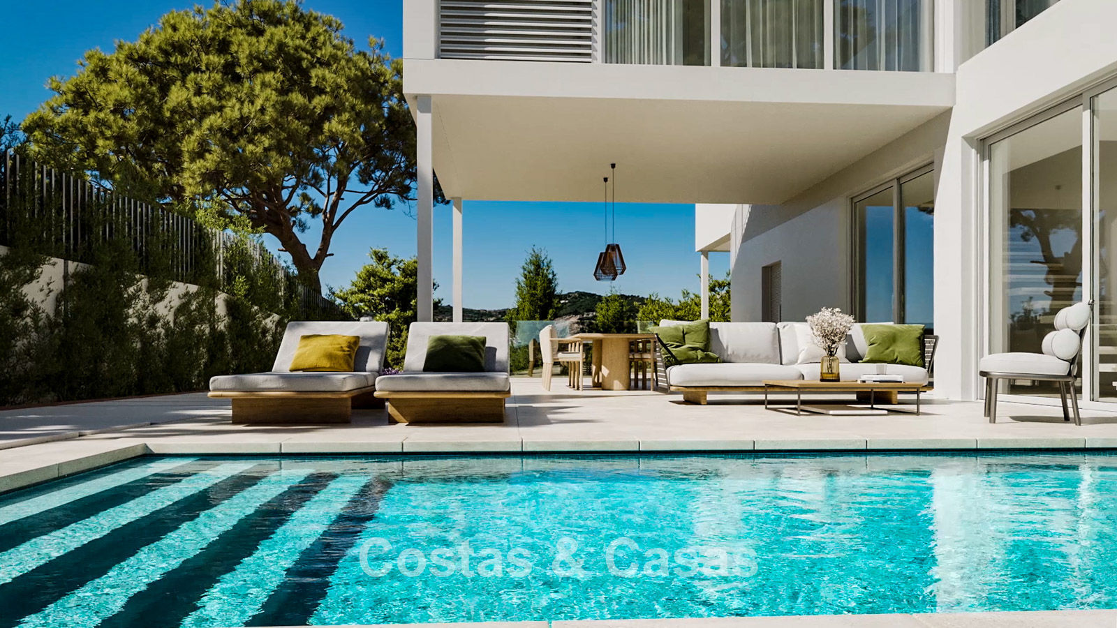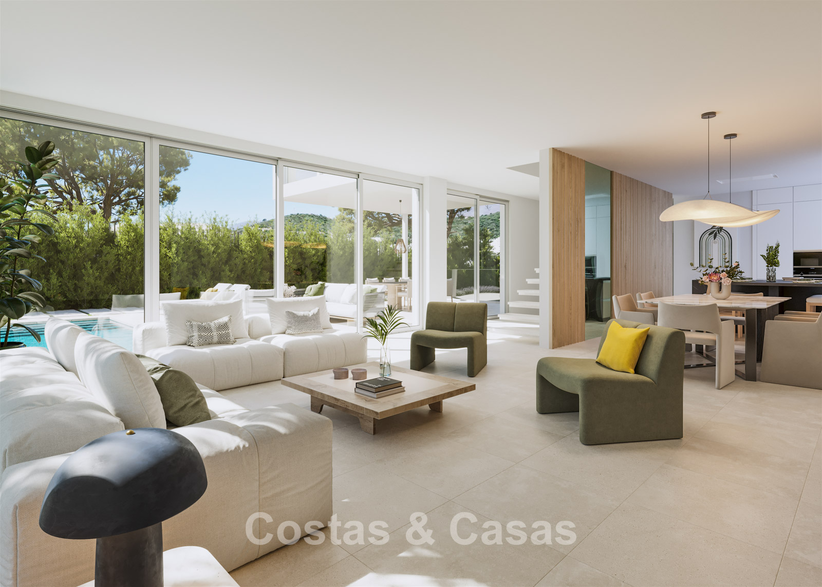 Dankzij de kamerhoge schuiframen geniet de villa van een uitzonderlijk lichtrijk interieur en een naadloze verbinding tussen binnen- en buitenruimtes.