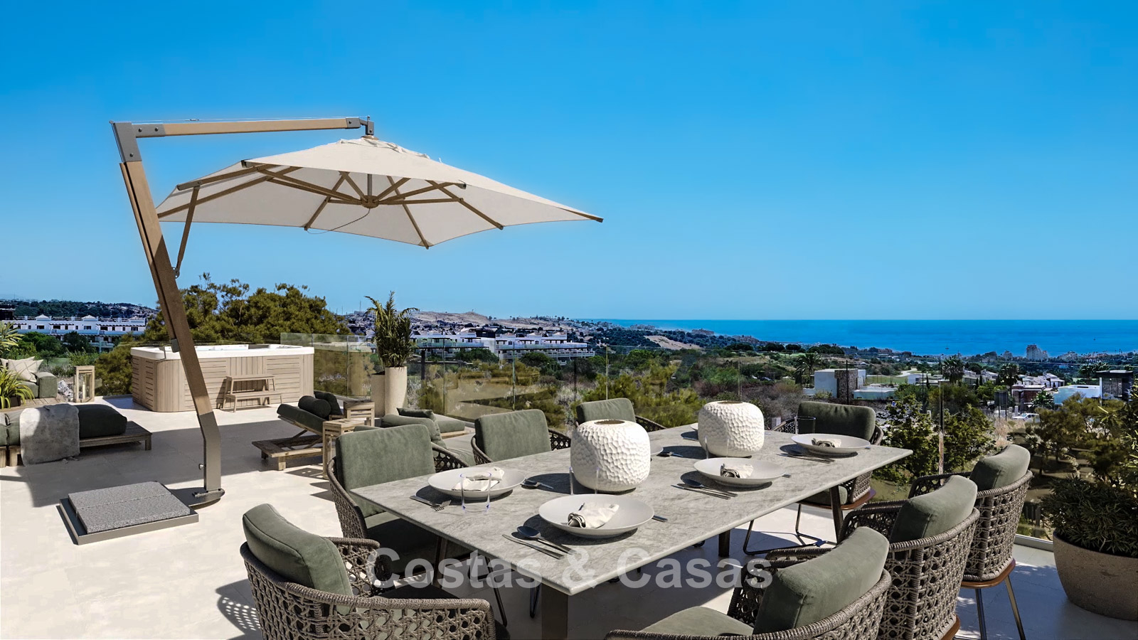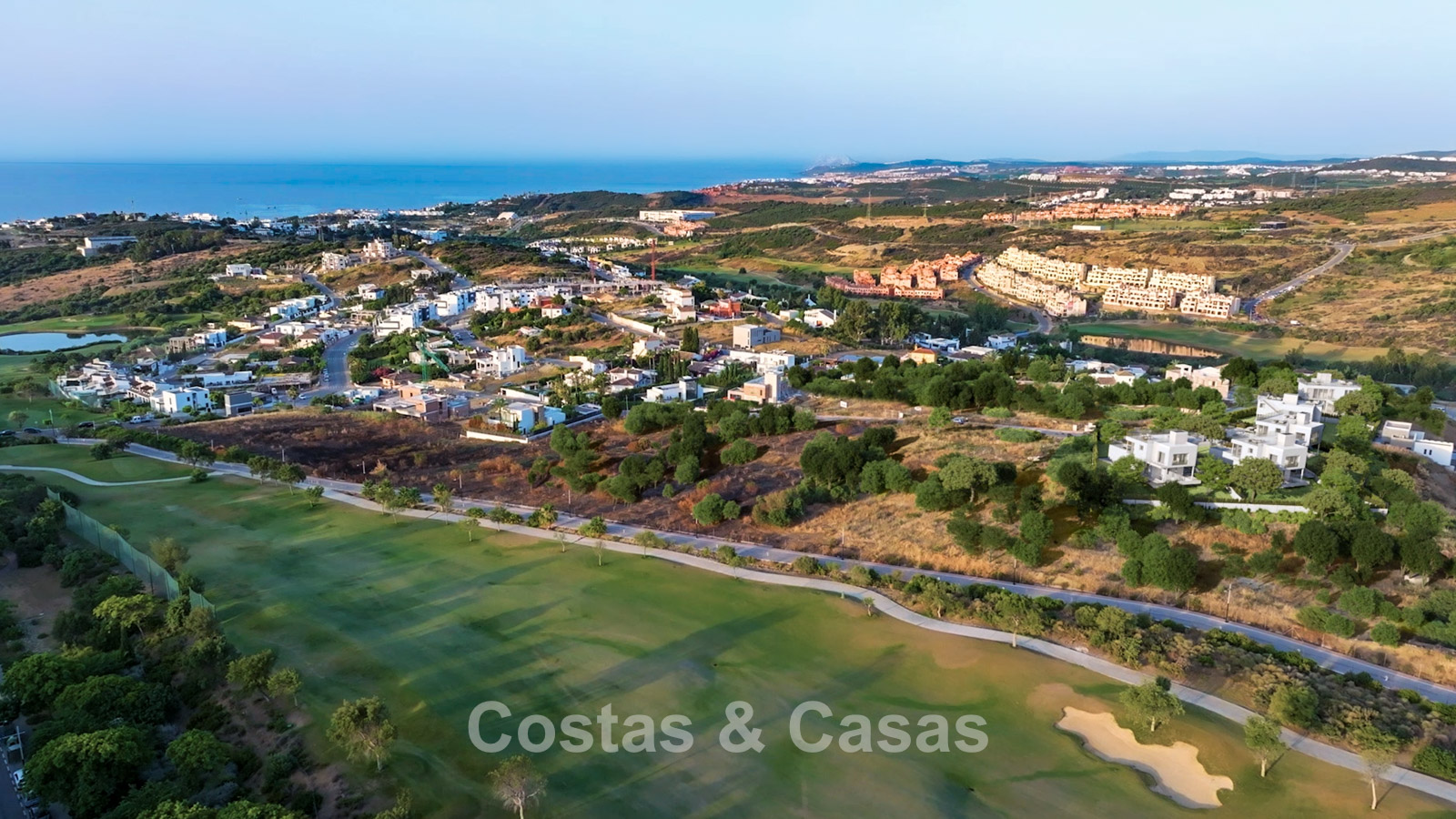Panoramisch uitzicht op de groene fairways, richting de Middellandse Zee.