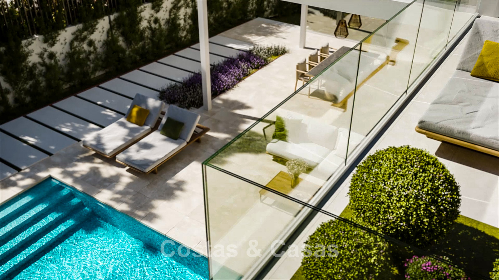 Glazen balustraden rondom het terras.