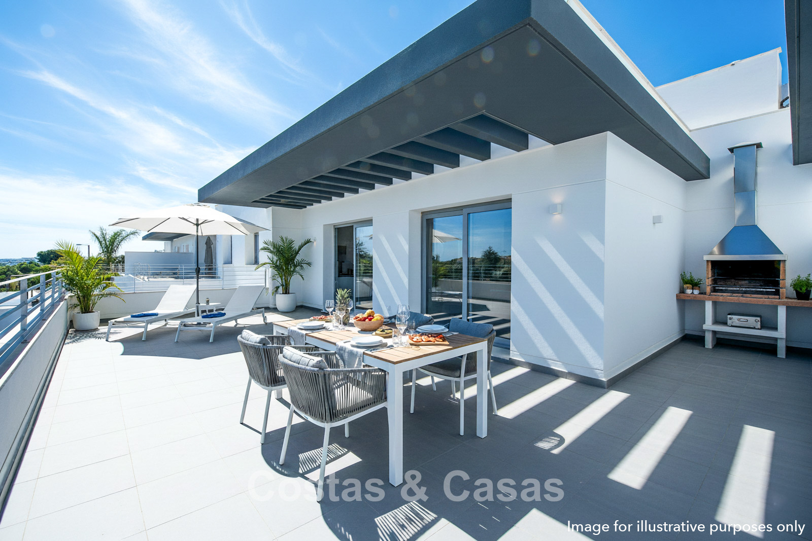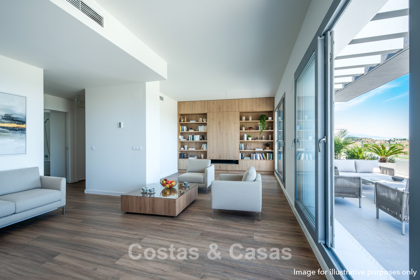 Instapklaar, gloednieuw, modern appartement te koop op bovenste verdieping in golfurbanisatie vlak bij Estepona stad