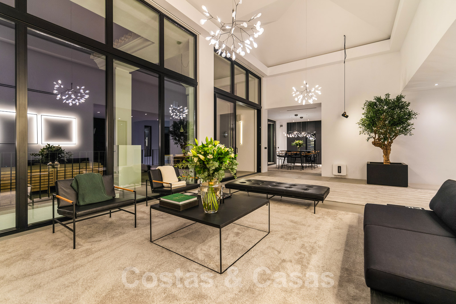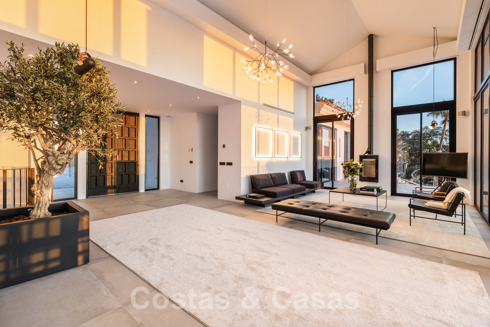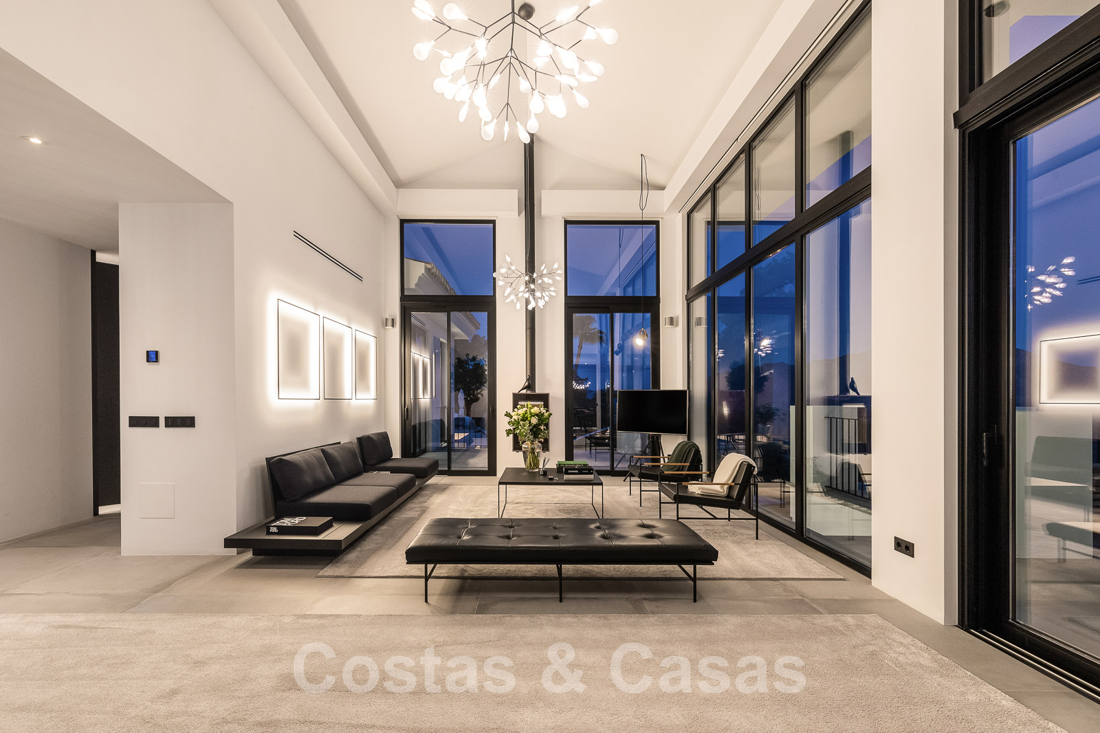 Bij het binnenkomen wandel je de royale leefruimte binnen met dubbelhoge plafonds, een ‘hangende’ vuurhaard en kamerhoge raamstructuren.