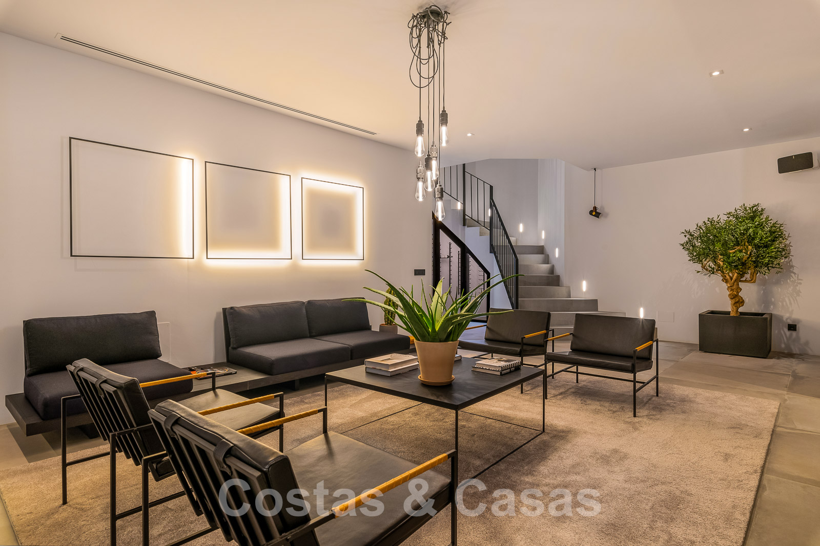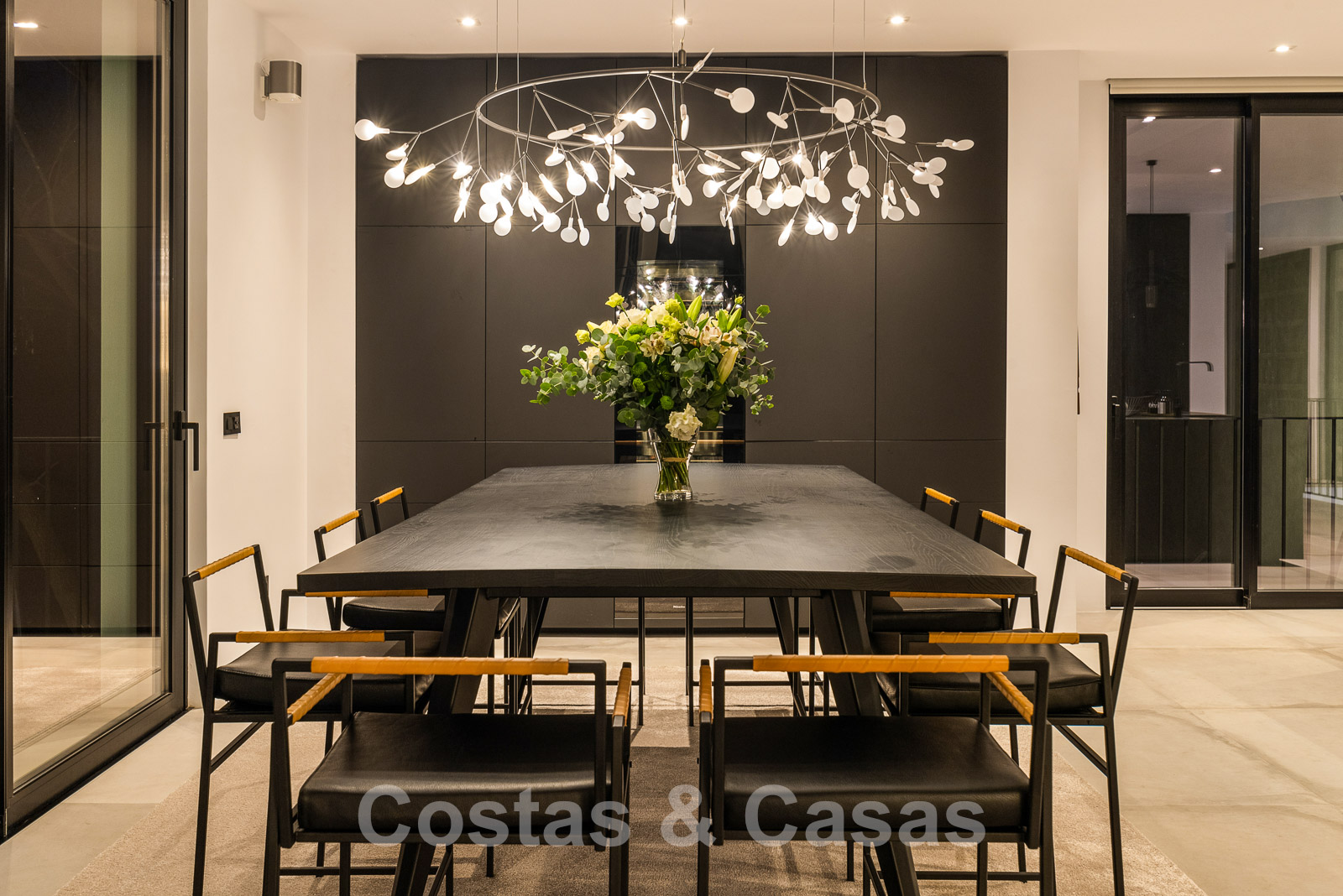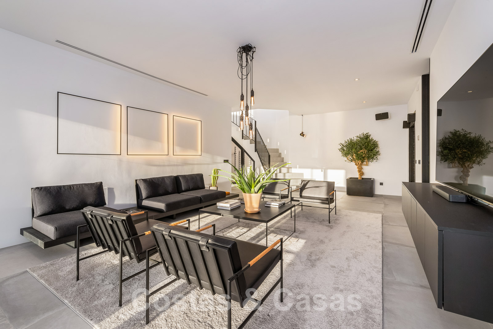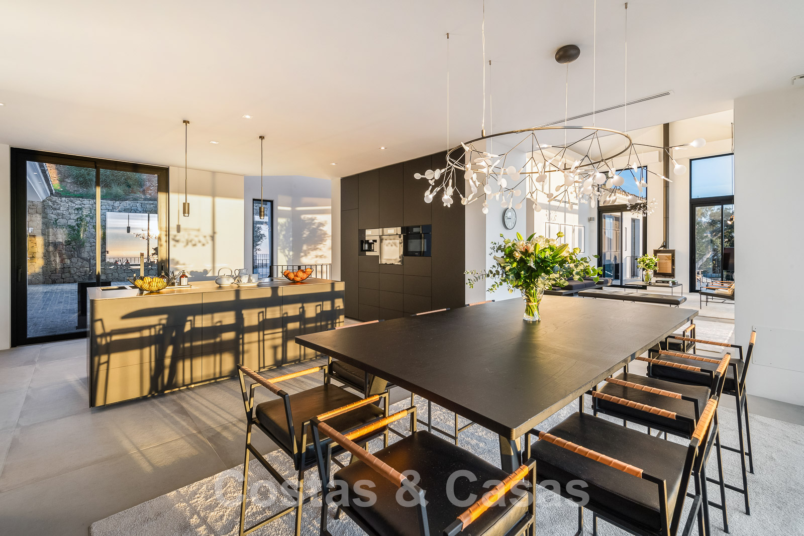 Bij het binnenkomen wandel je de royale leefruimte binnen met dubbelhoge plafonds, een ‘hangende’ vuurhaard en kamerhoge raamstructuren.