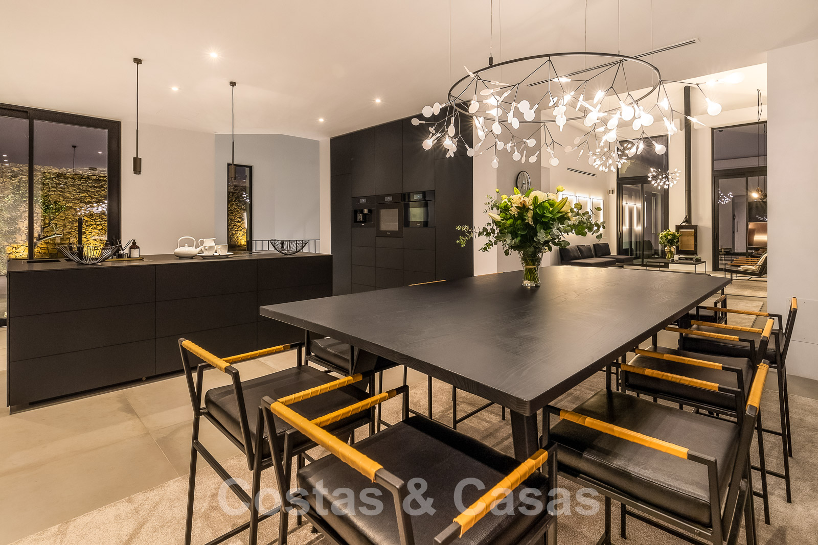 Aansluitend een open keuken, uitgerust met Miele toestellen en kookeiland, verder nog een wijnkast en eettafel.