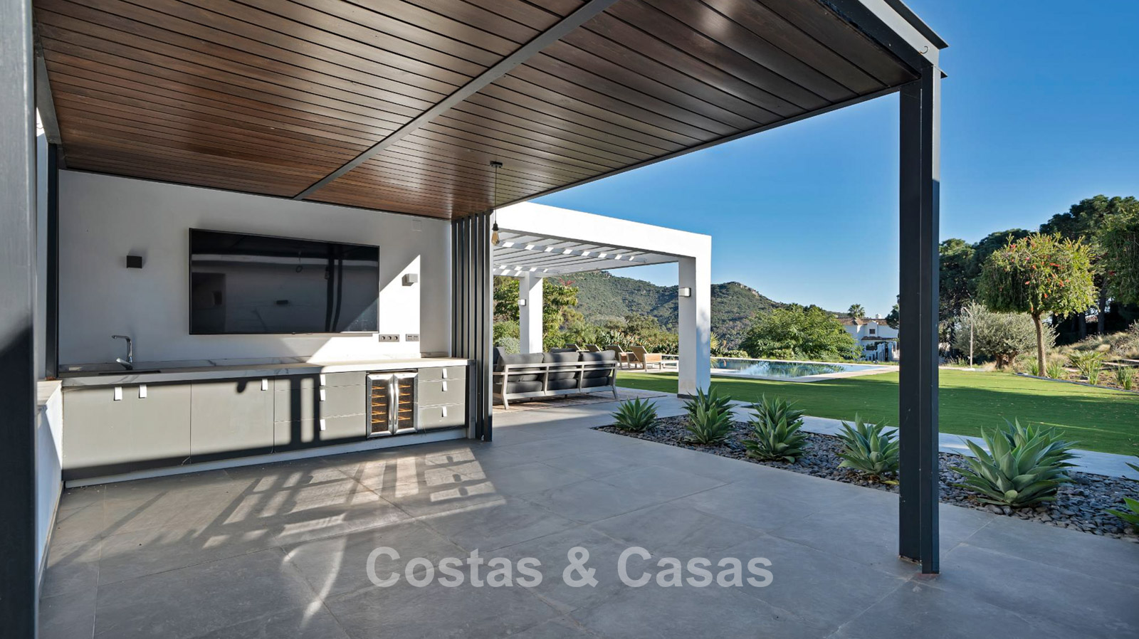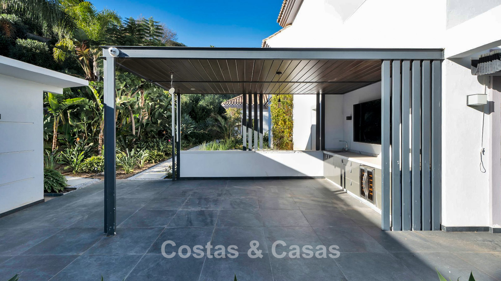 Een overdekte, functionele buitenkeuken biedt de perfecte setting om te genieten van culinaire momenten met vrienden en familie.