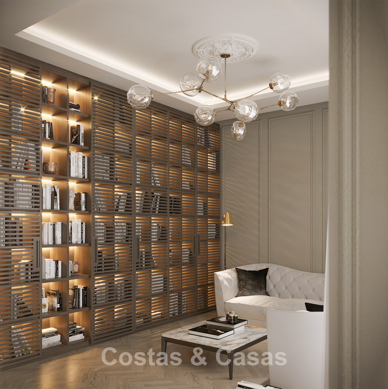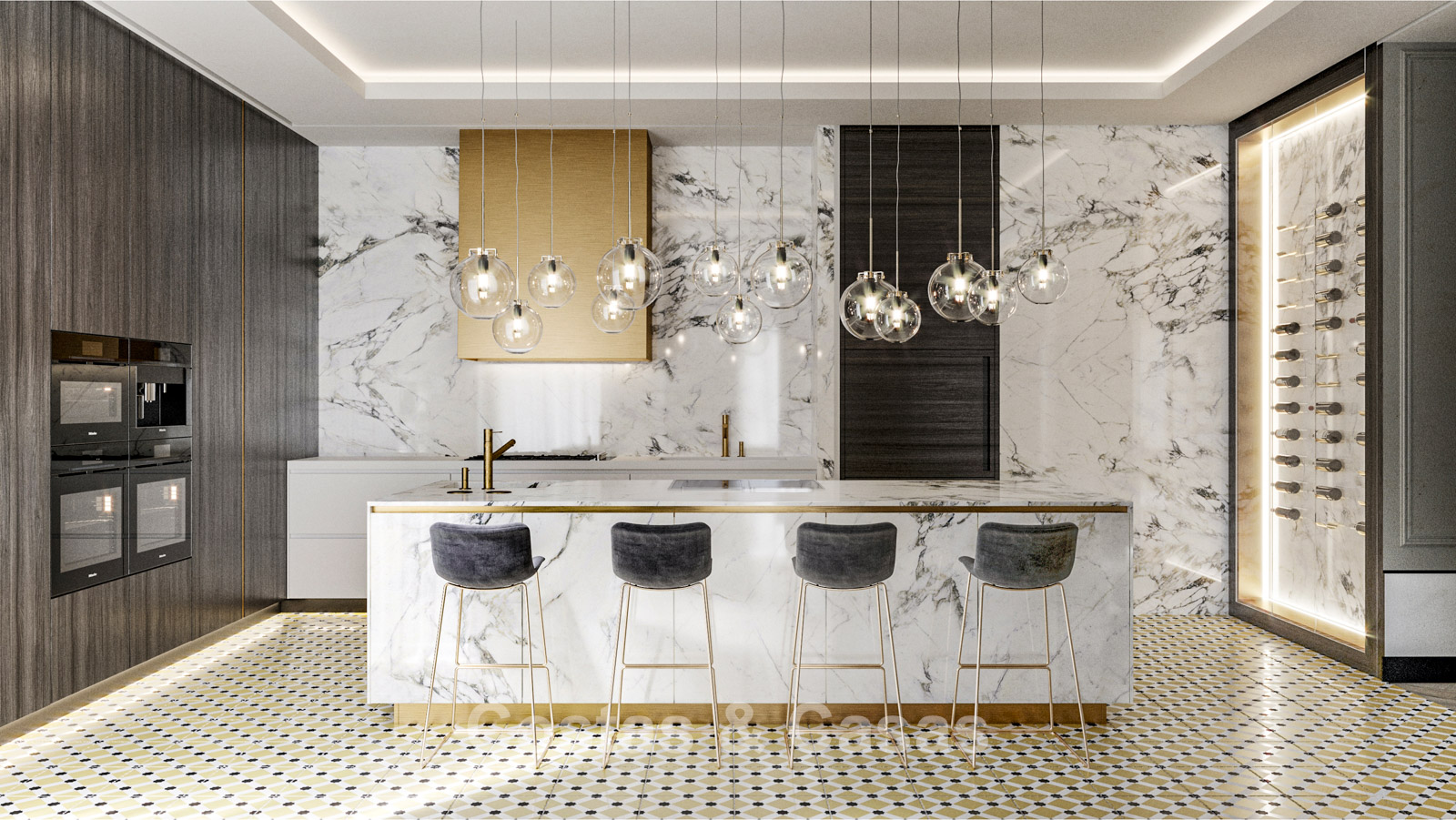 De op maat gemaakte keuken is uitgerust met kasten van vloer tot plafond, een trendy wijnwand die zowel functioneel als decoratief is, en een stijlvol marmeren kookeiland met geïntegreerde ontbijtbar.