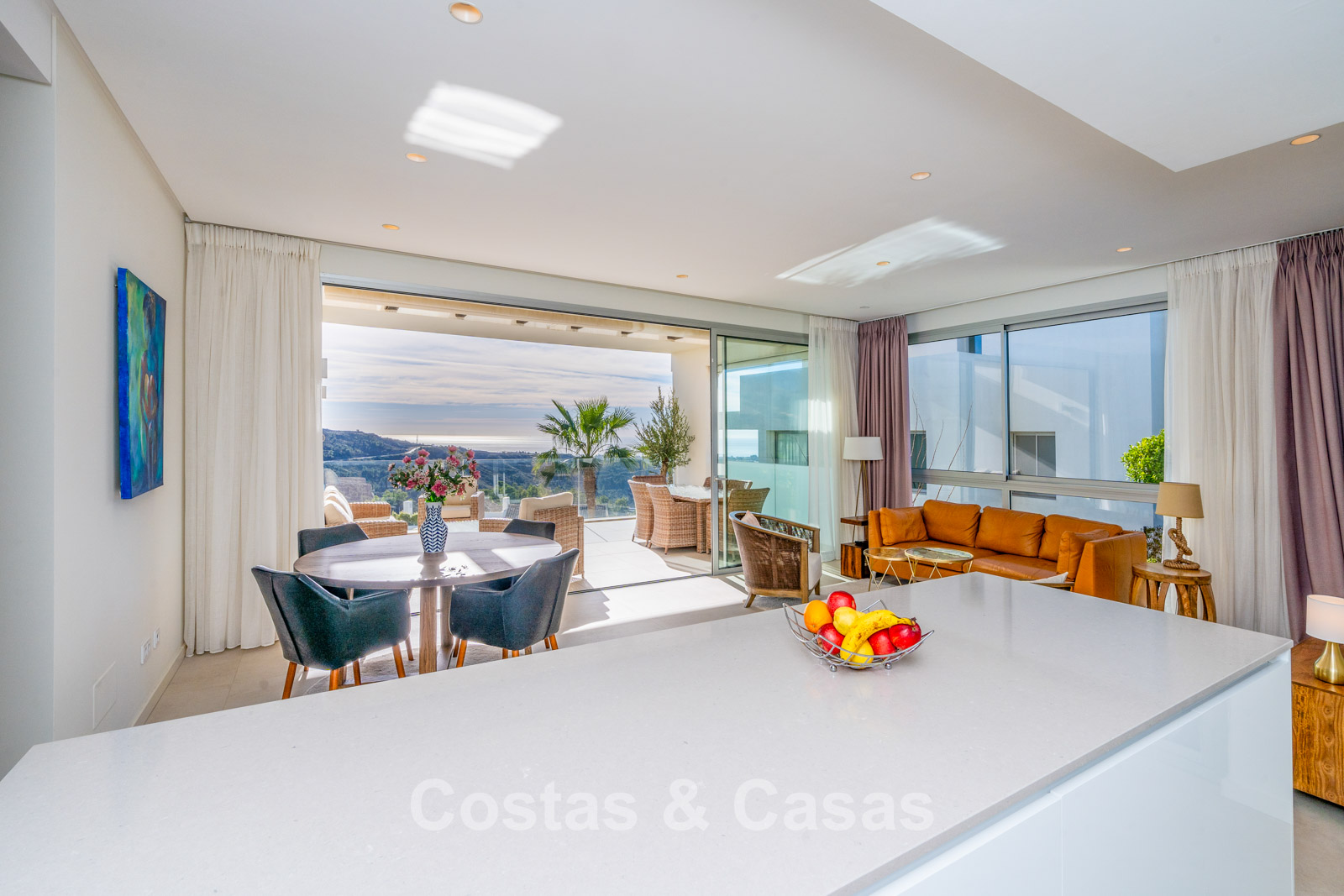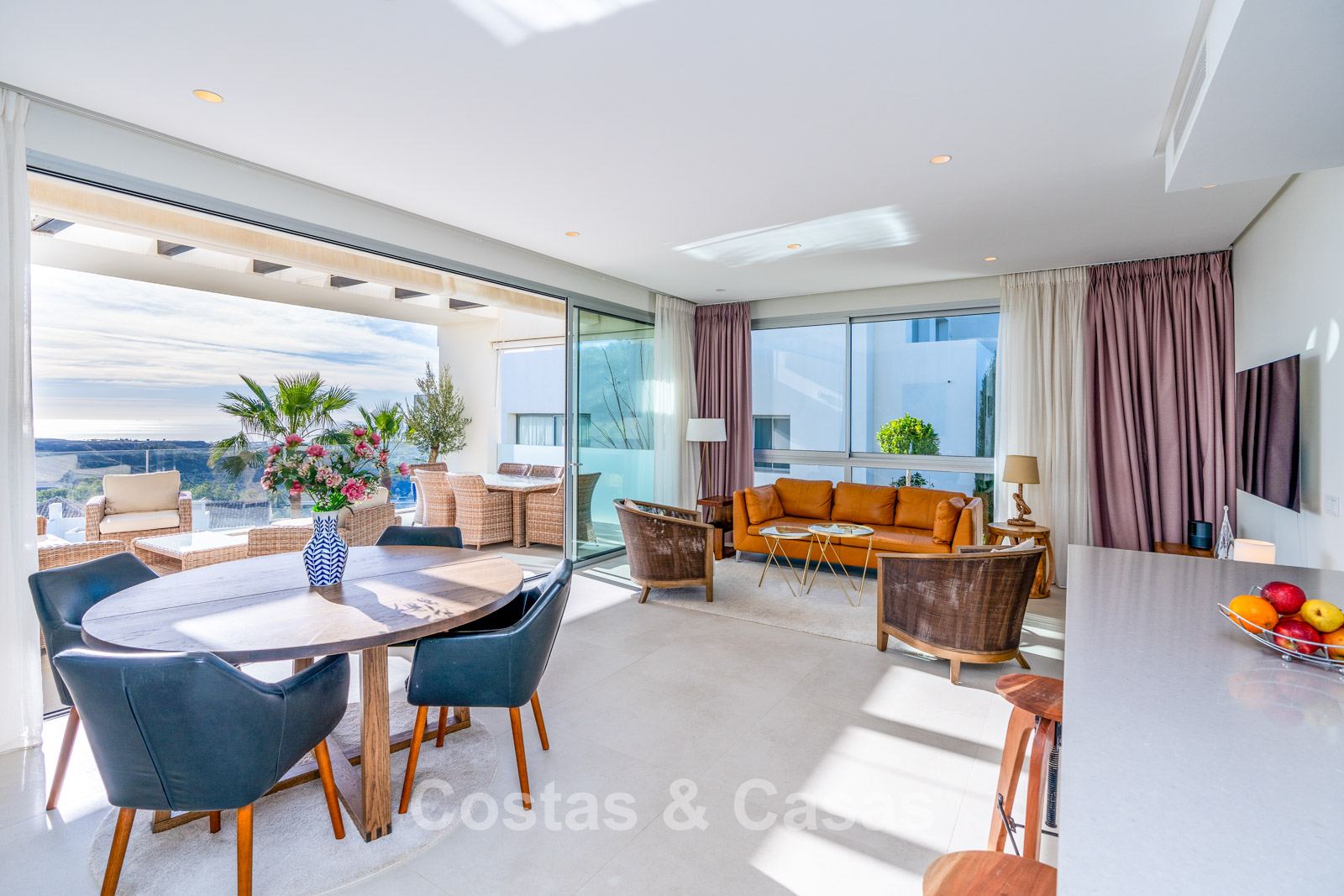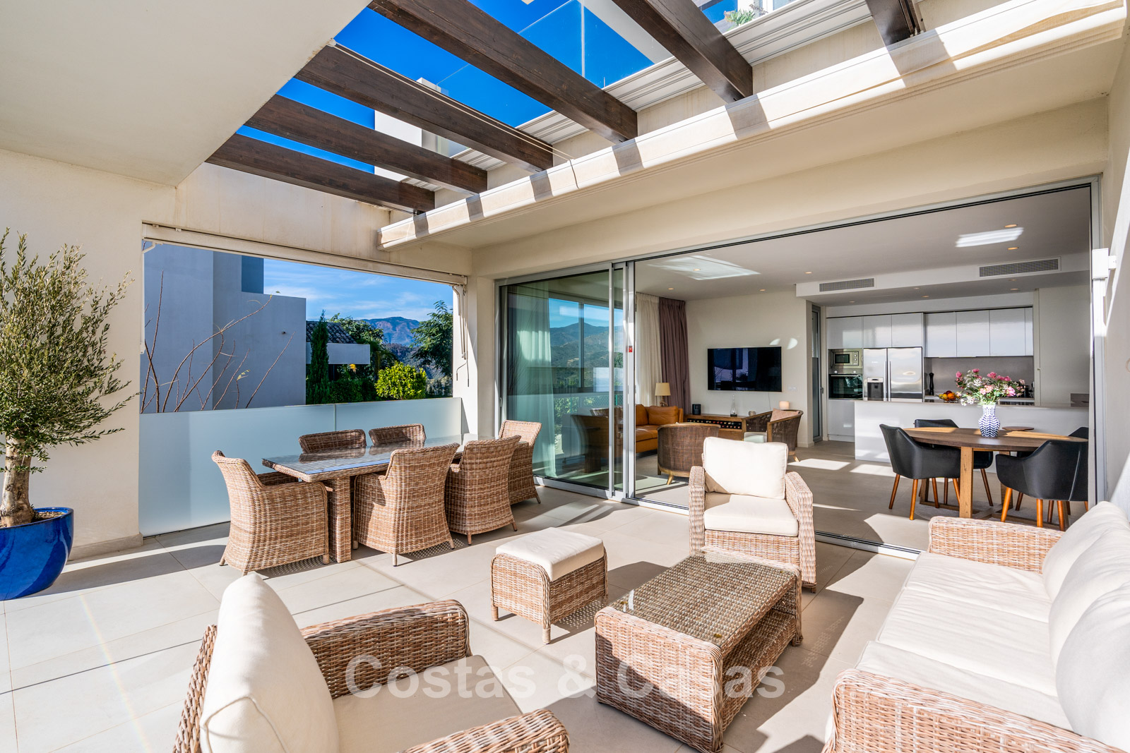 De naadloze overgang naar de drie royale terrassen biedt de ultieme setting voor ontspannen ontbijt in de zon of sfeervolle diners bij een ondergaande zon.