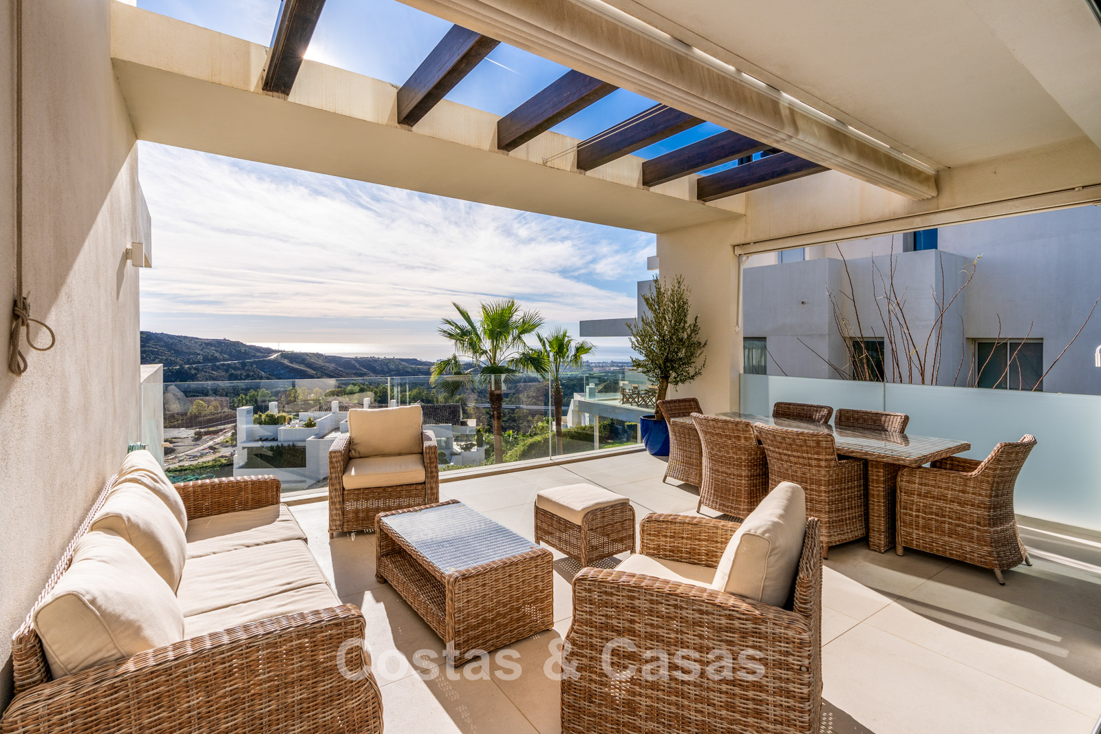 Glazen balustraden rondom het terras.