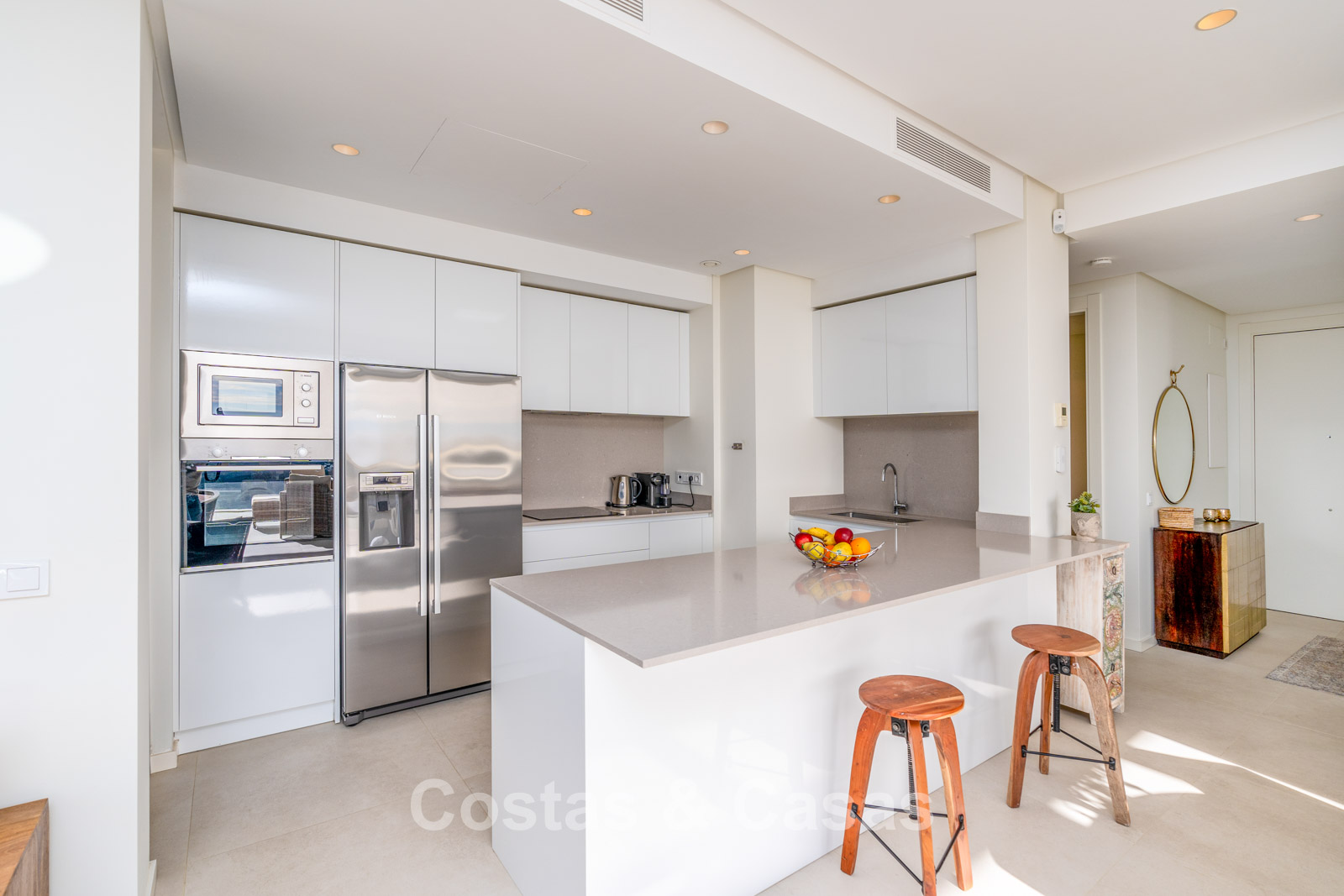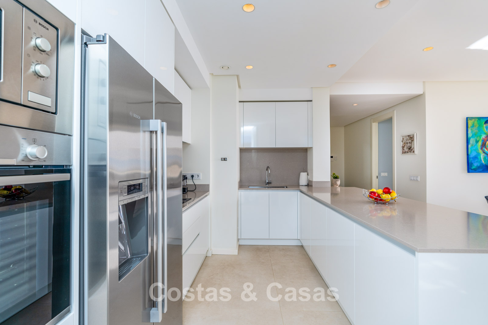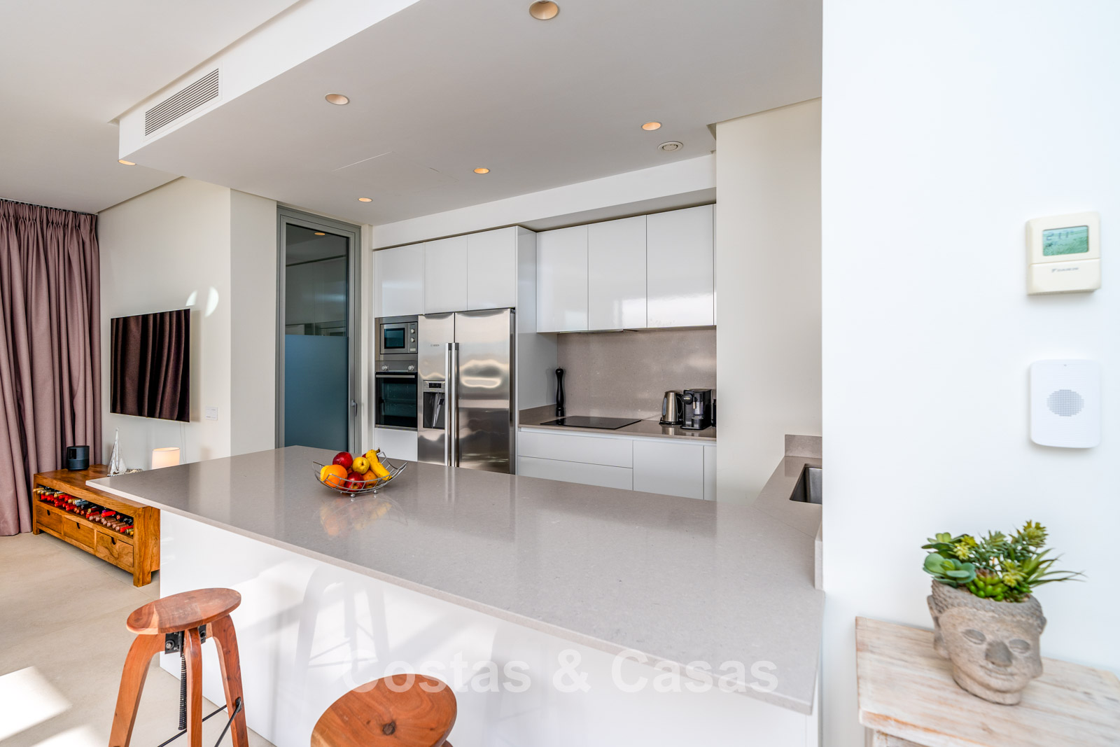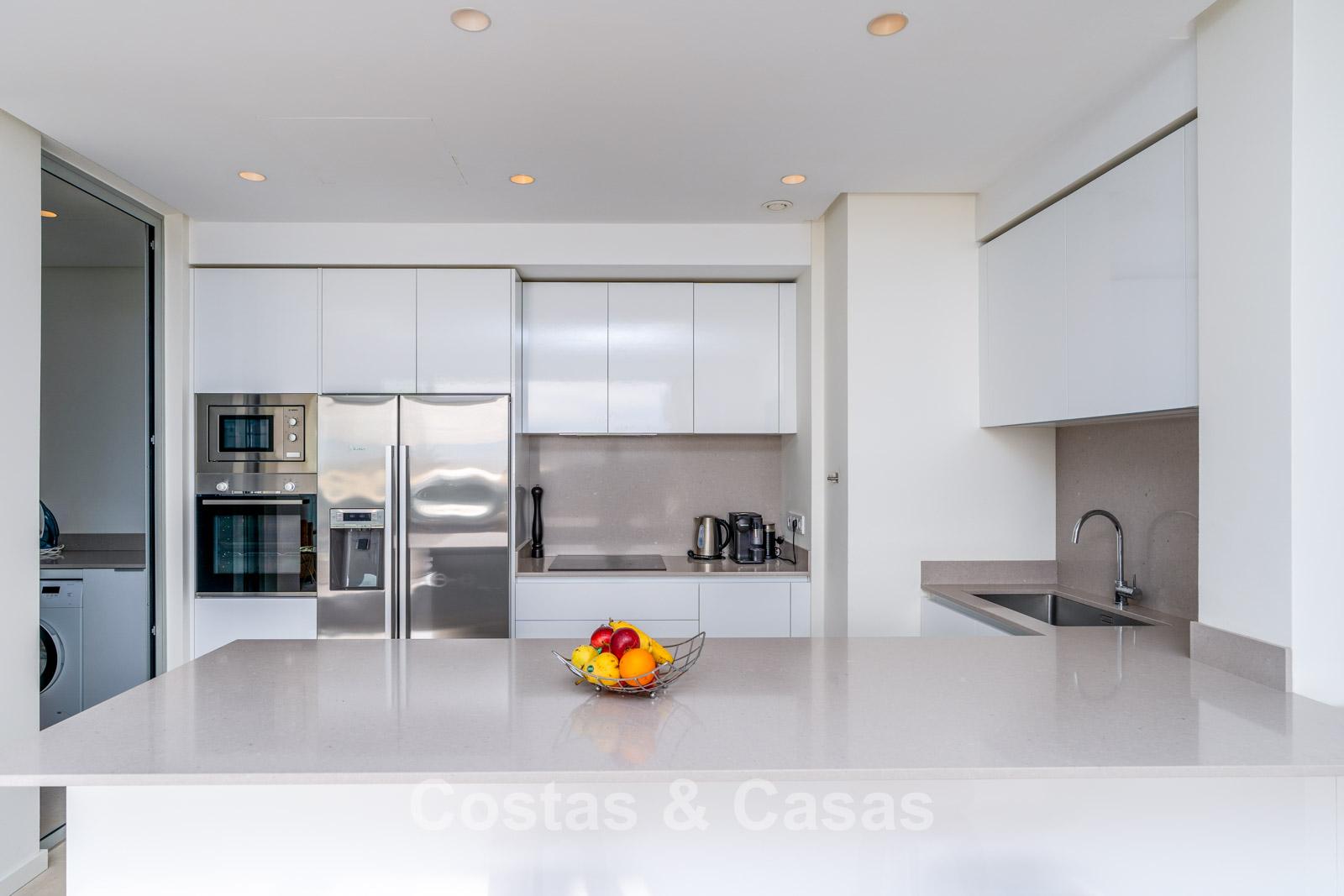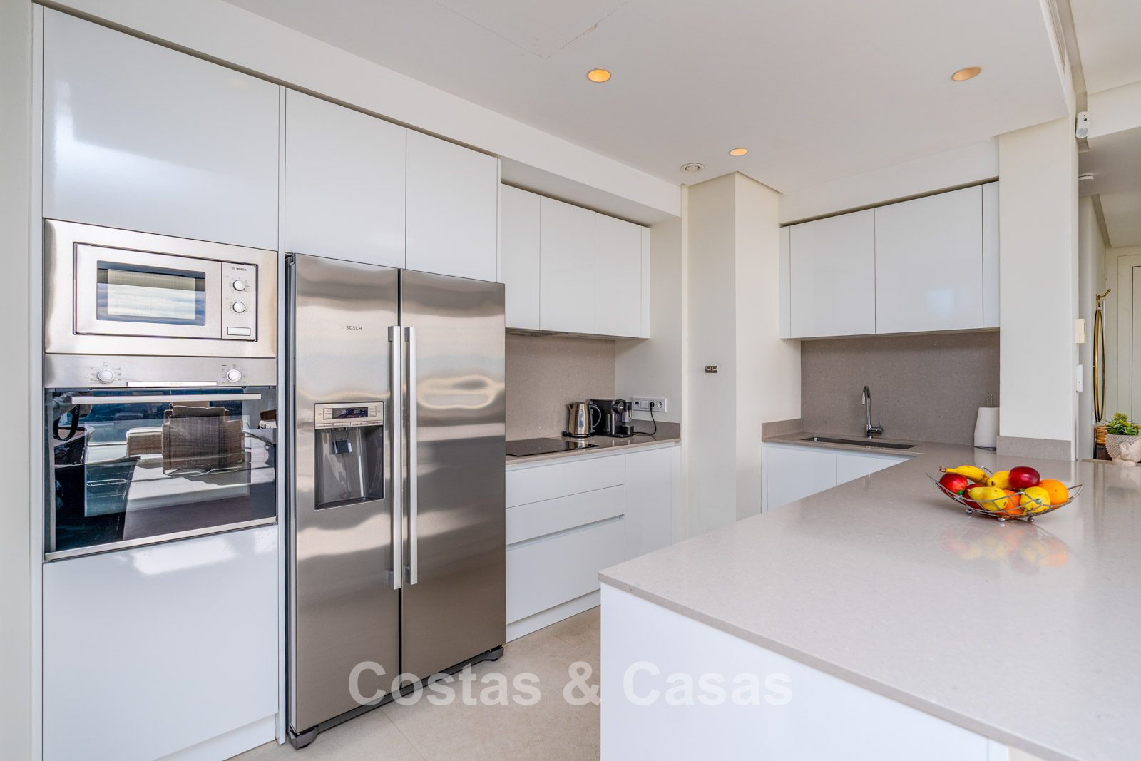 Een open moderne keuken wordt volledig uitgerust met toptoestellen en een kookeiland met ontbijtbar.