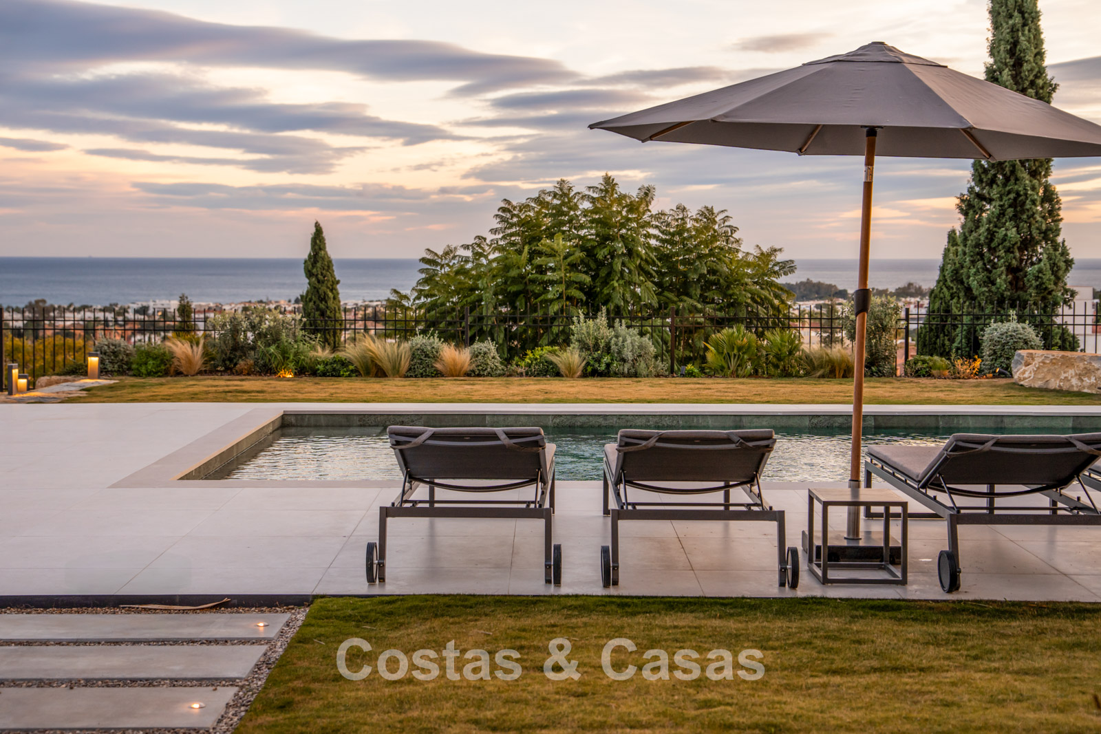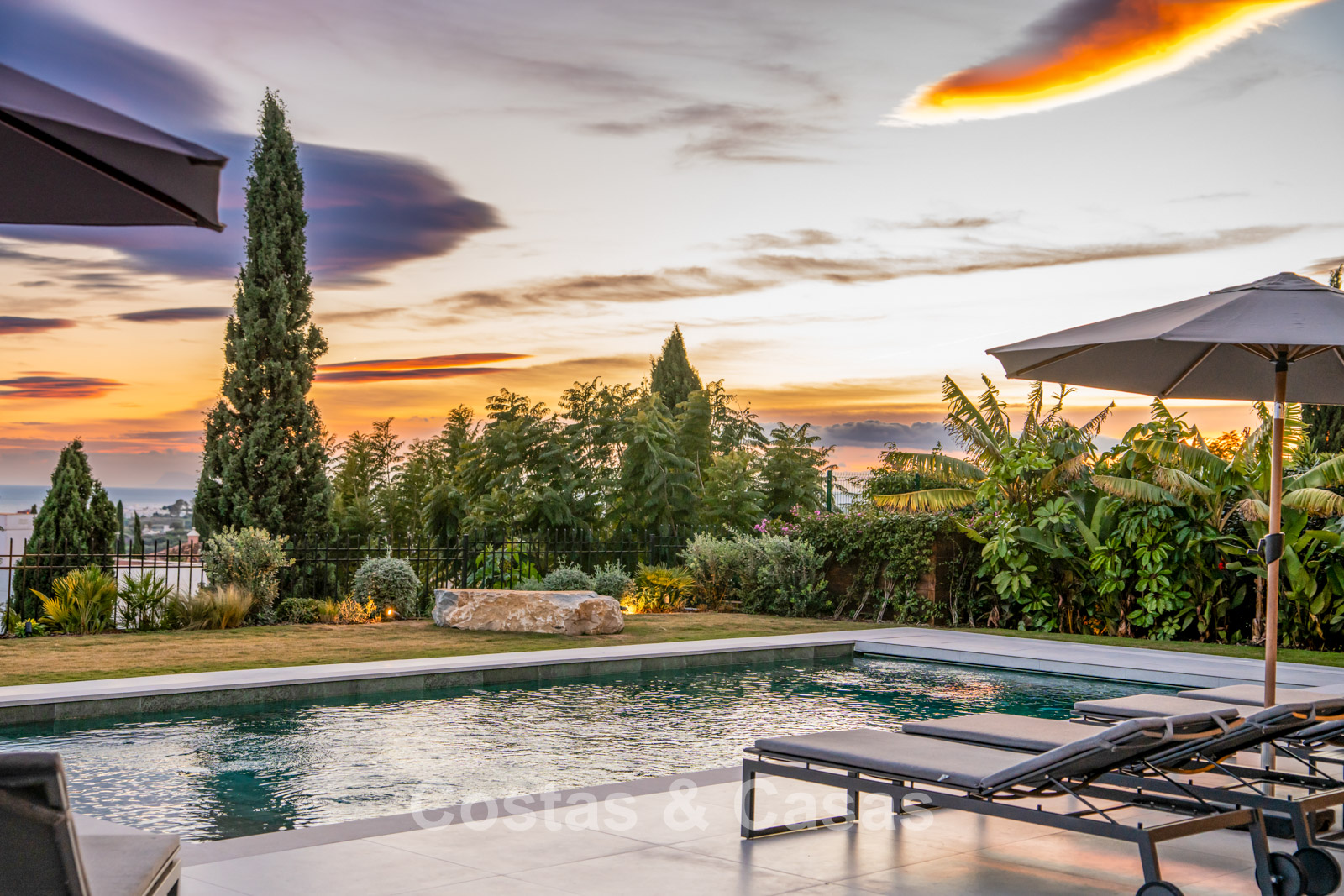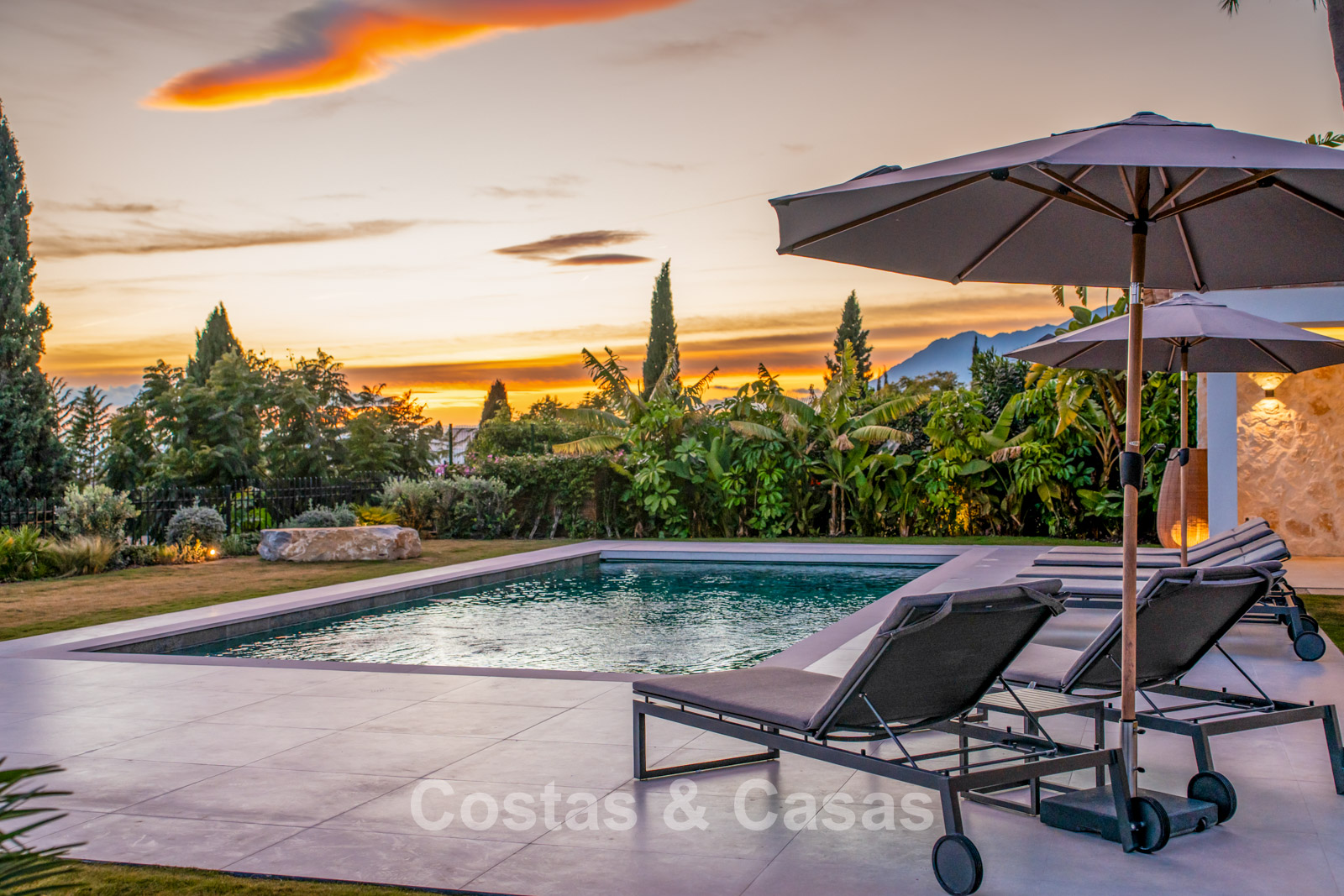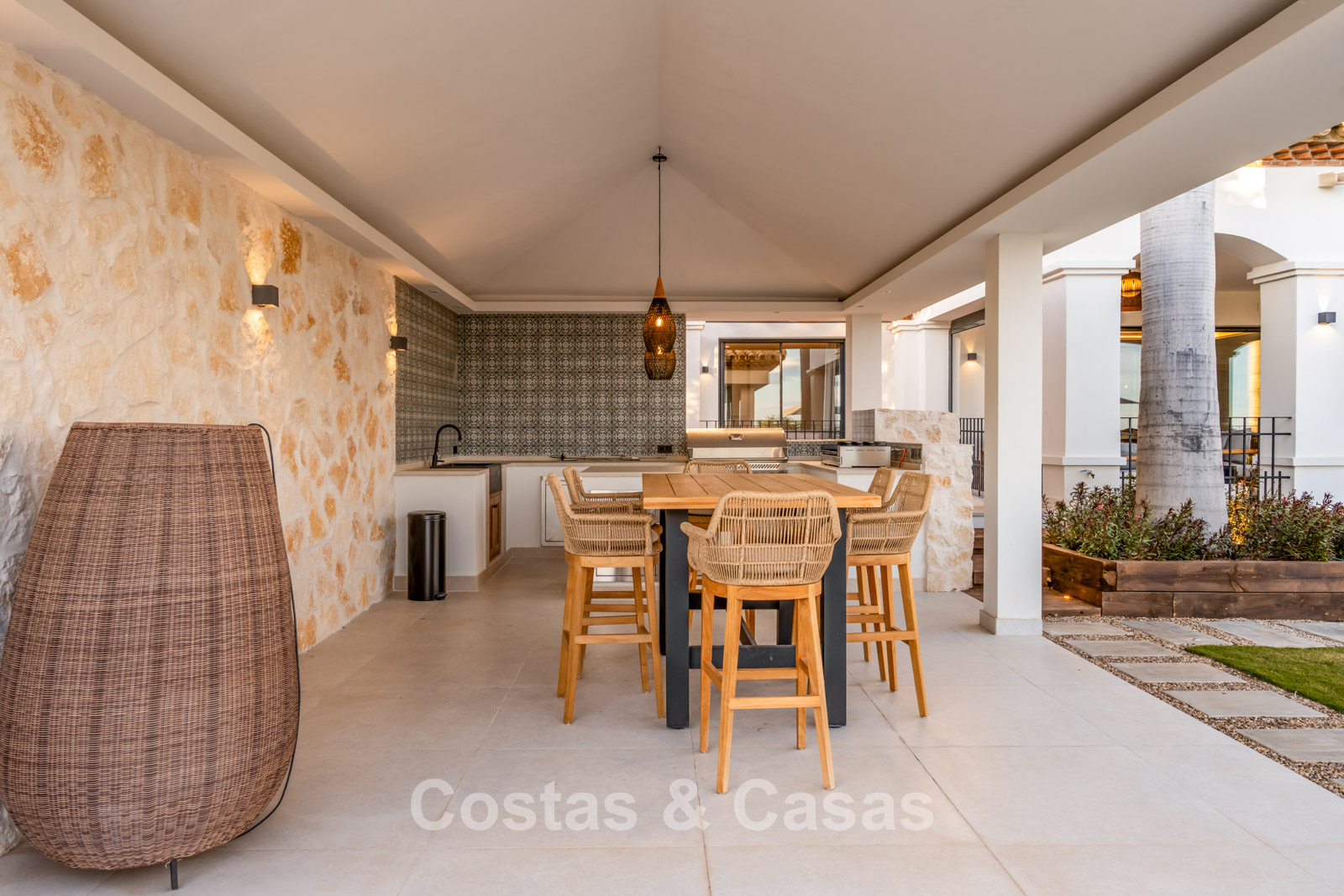 De tuin vormt een mediterraan paradijs met weelderige tropische beplanting, elegante chill-out zones en een vuurpit.