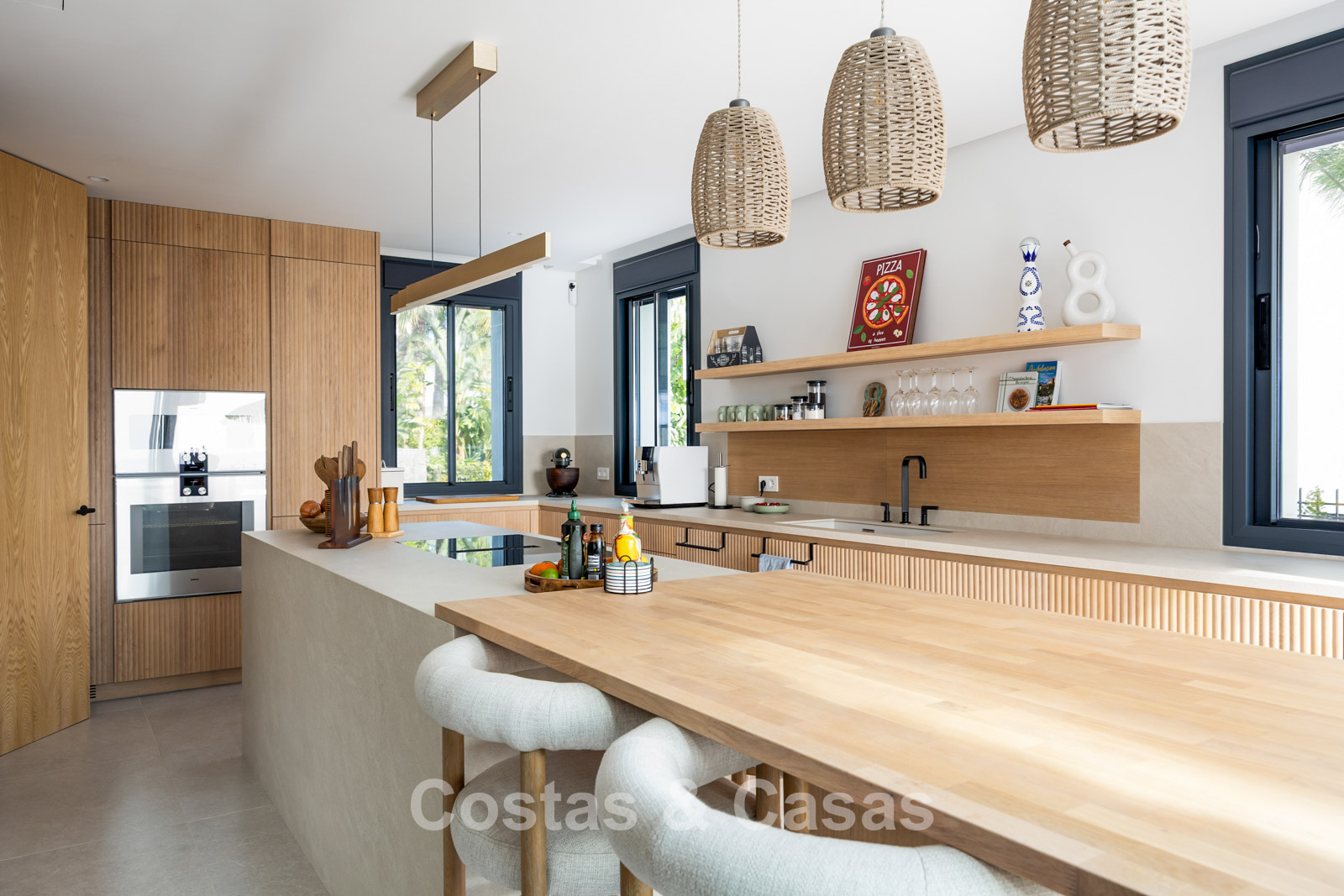 Functionele designkeuken op maat, uitgerust met hoogwaardige Gaggenau toestellen en een eiland met een ontbijtbar.