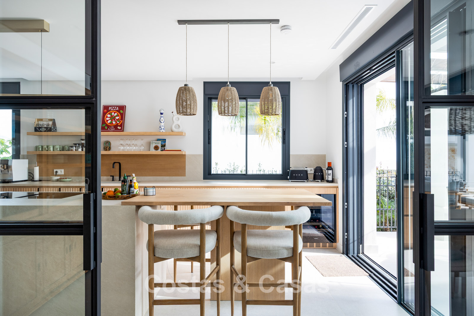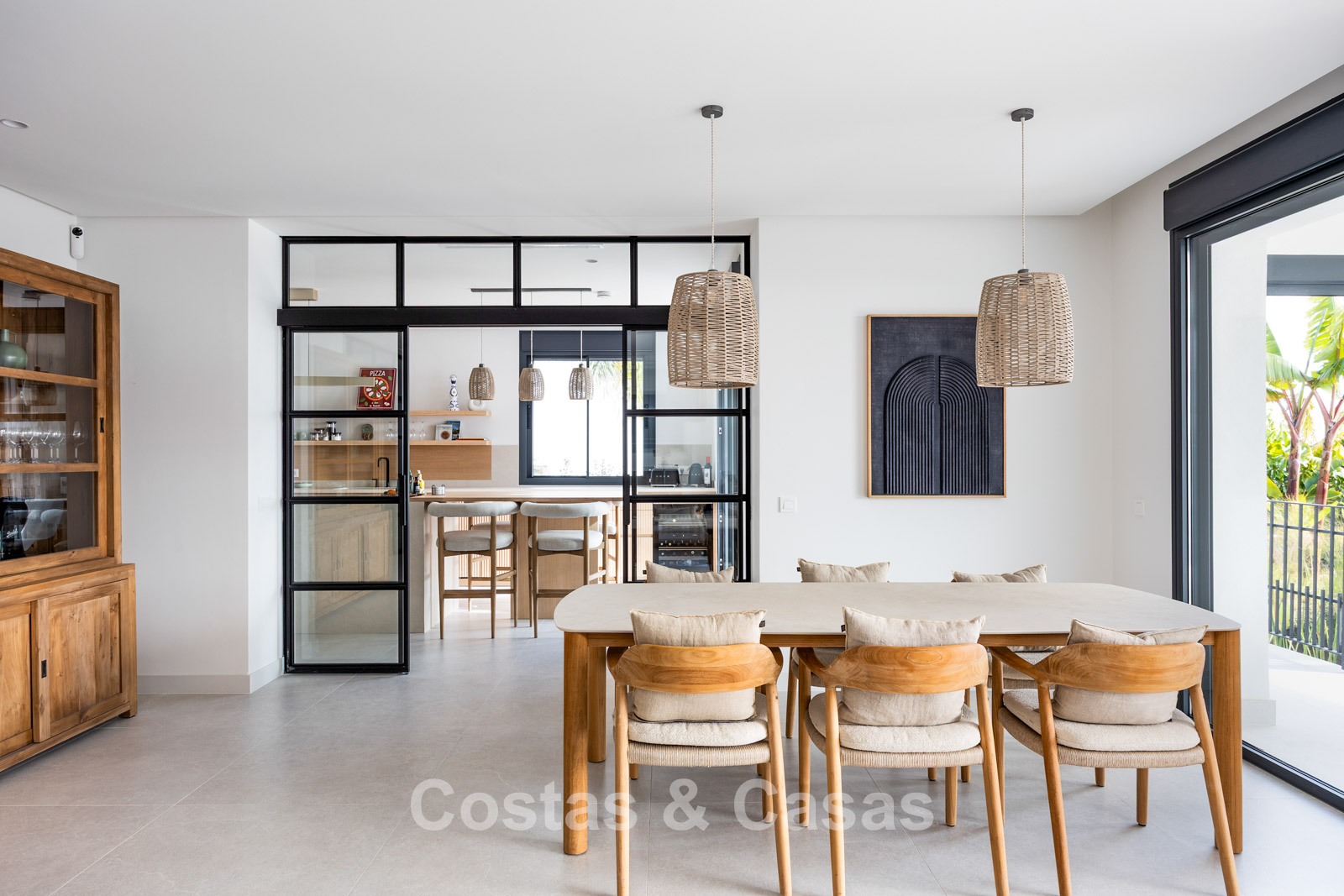 De hoge schuiframen met verzonken profielen zorgen voor een naadloze overgang naar buiten en laten overvloedig daglicht binnen, wat bijdraagt aan een lichtrijk en open interieur.