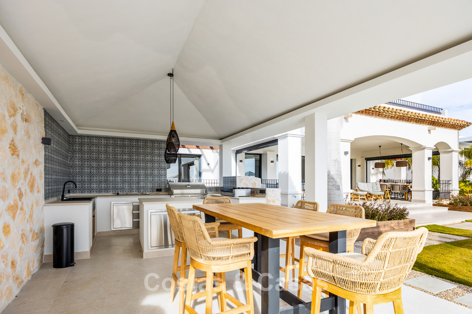 De stijlvolle buitenkeuken met hoogwaardige Napoleon-grill biedt het perfecte kader voor lange, gezellige diners in de buitenlucht.