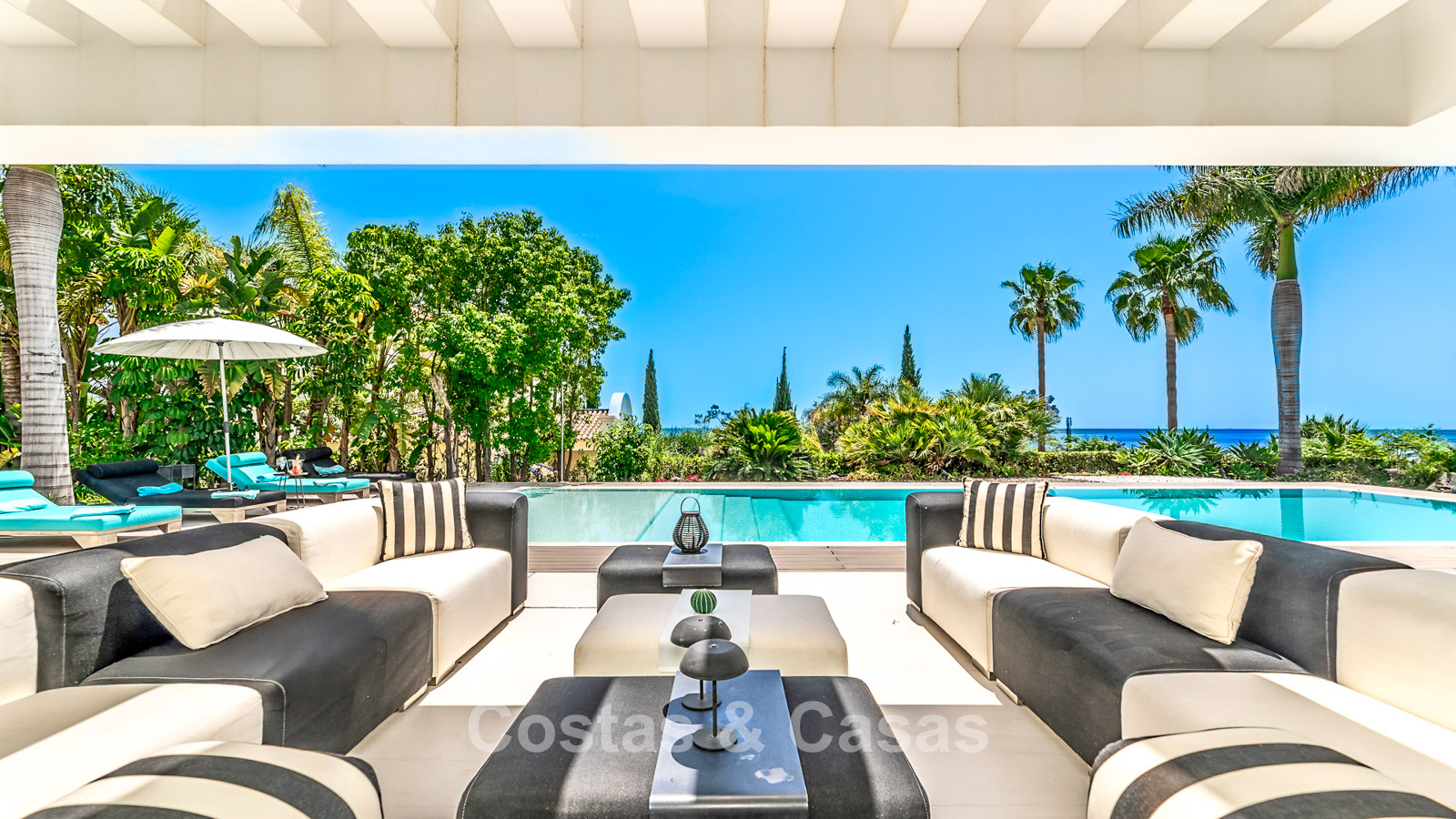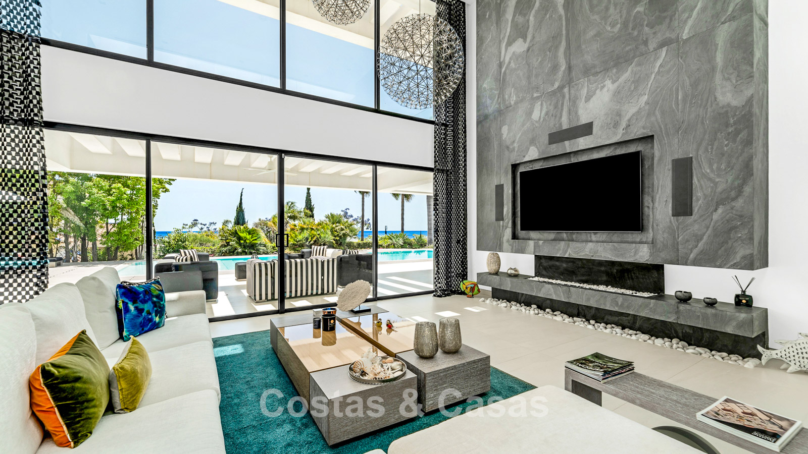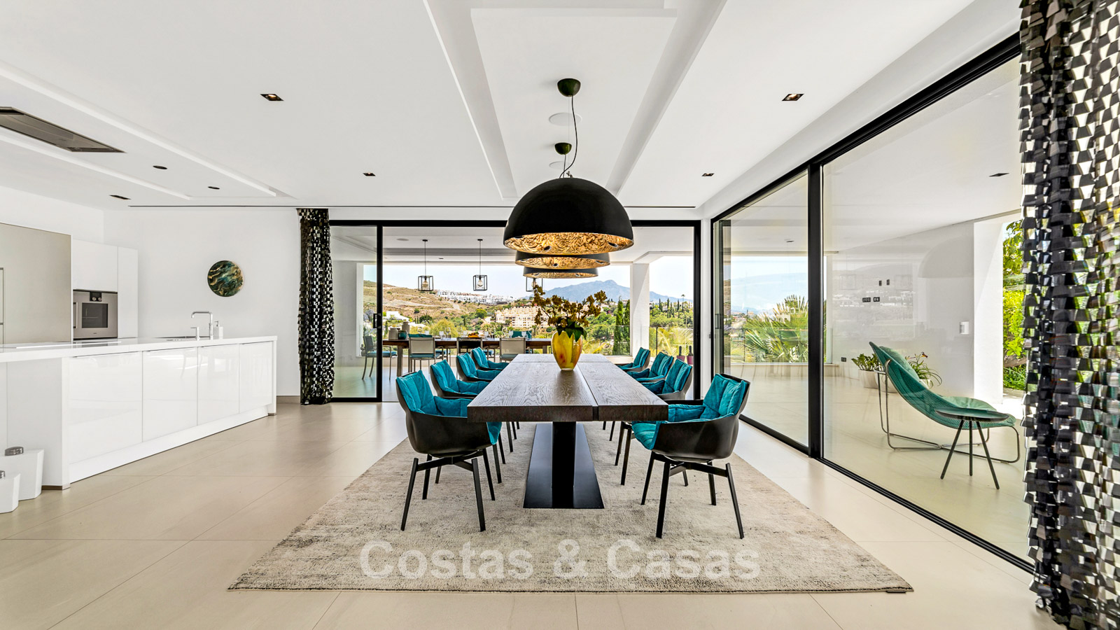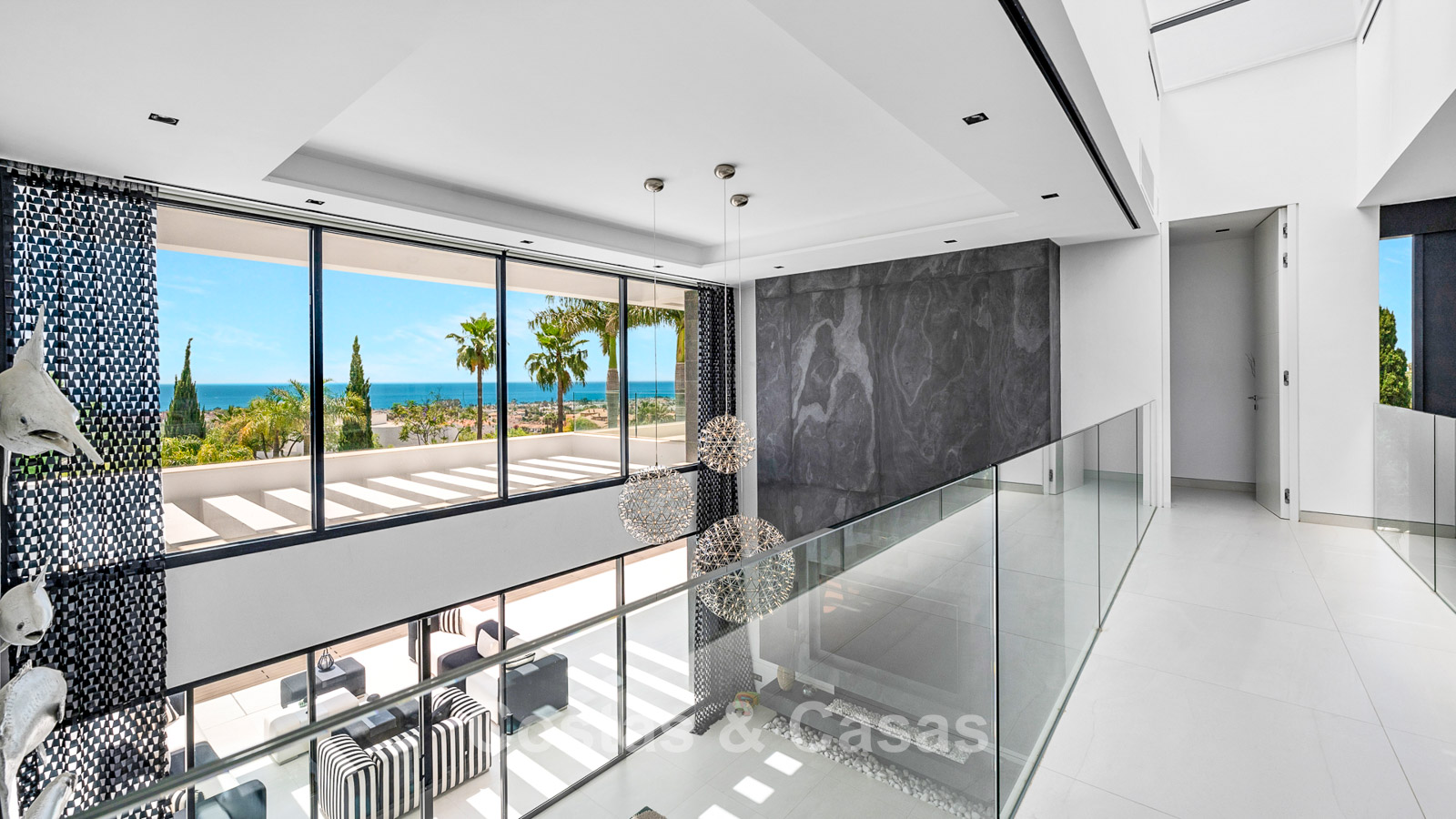 De kamerhoge vloer-tot-plafond ramen creëren een ongekend gevoel van ruimte en bieden een naadloze overgang naar de zonovergoten terrassen.