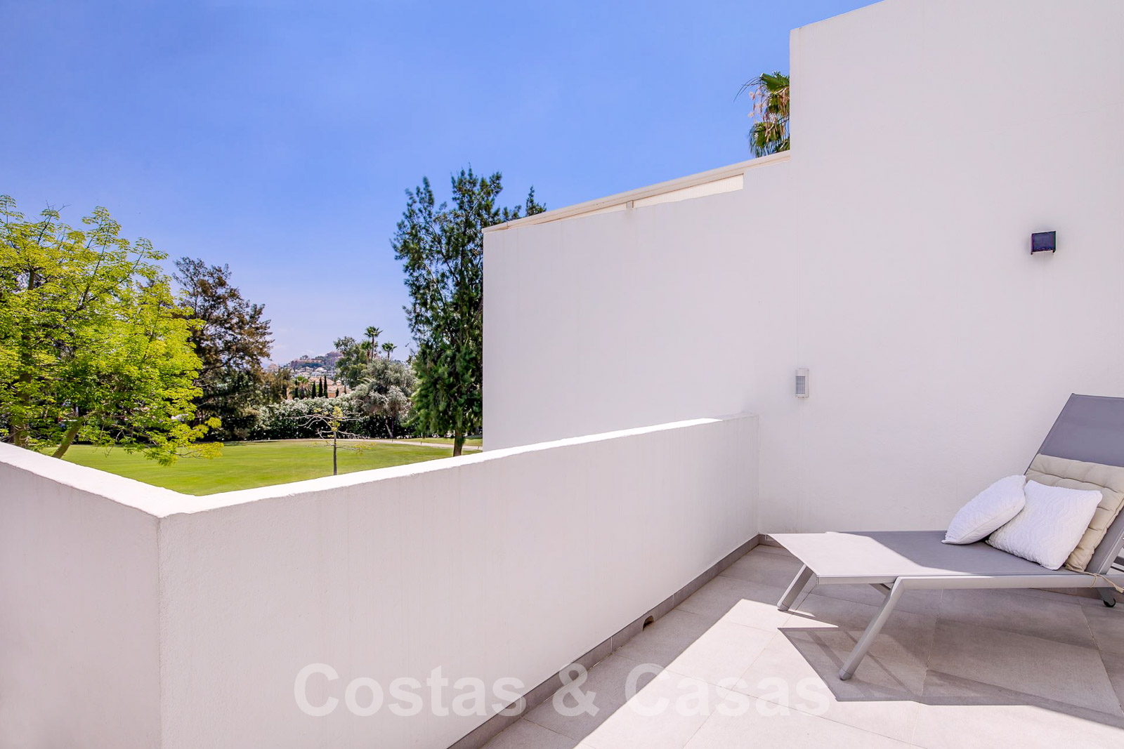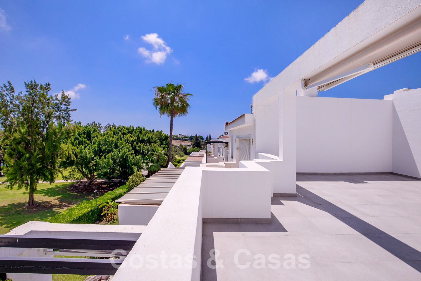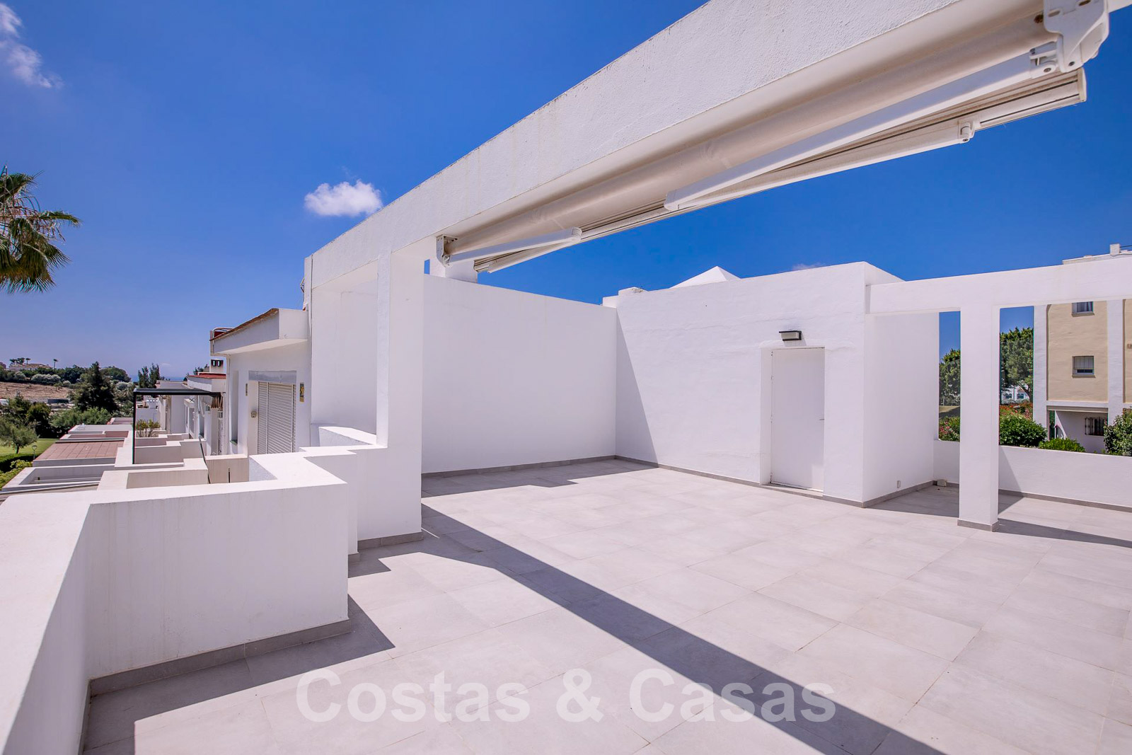 Een uitgestrekt dakterras kan worden ingericht met loungevoorzieningen en biedt 360° panoramisch uitzicht op de golfvallei en de La Concha berg.