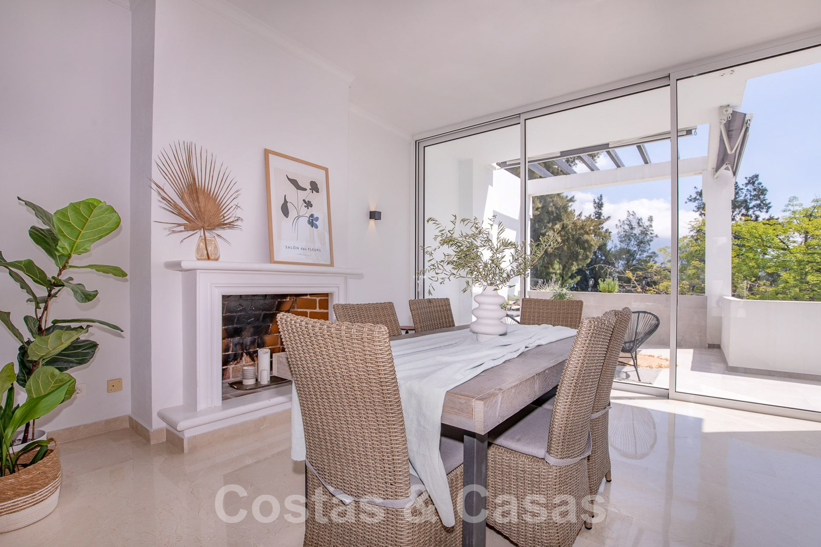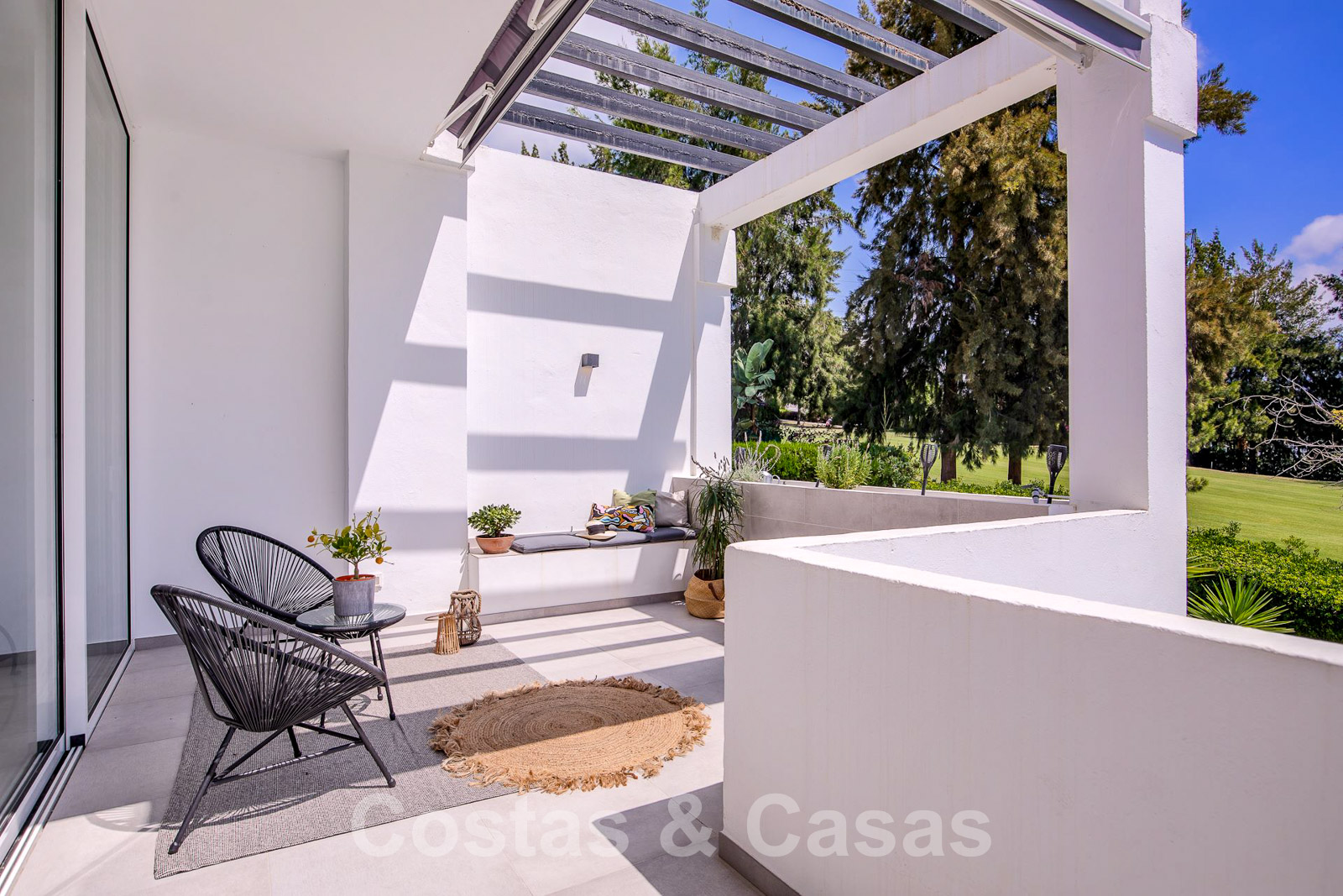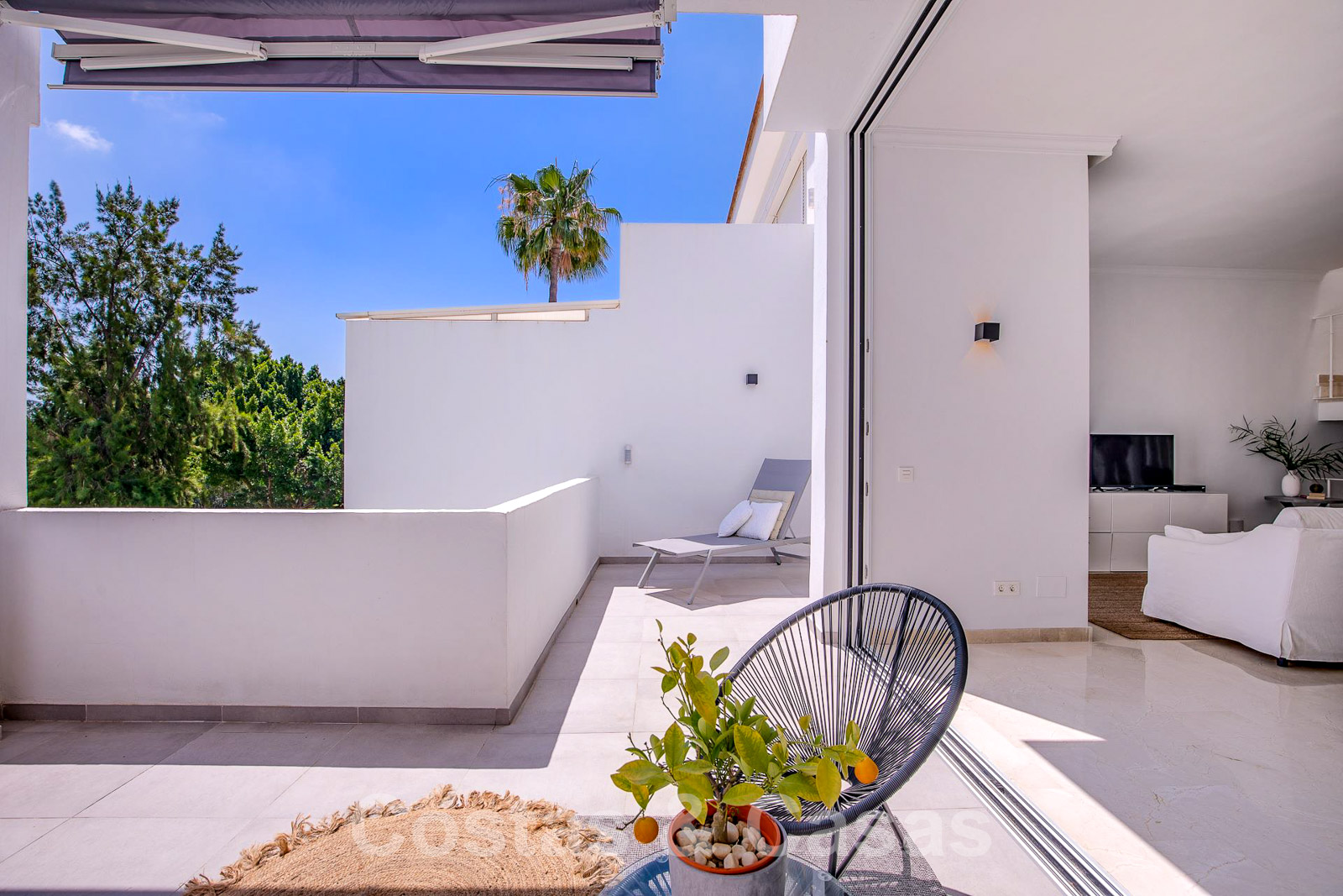 Een uitgestrekt dakterras kan worden ingericht met loungevoorzieningen en biedt 360° panoramisch uitzicht op de golfvallei en de La Concha berg.