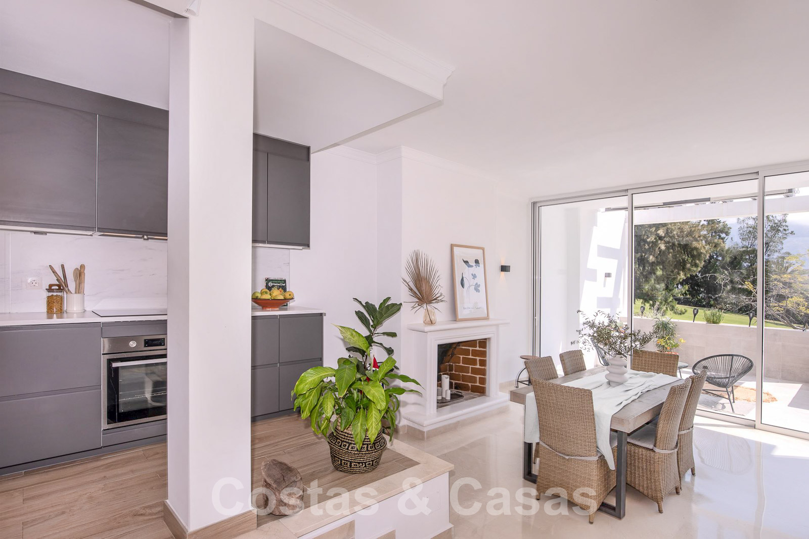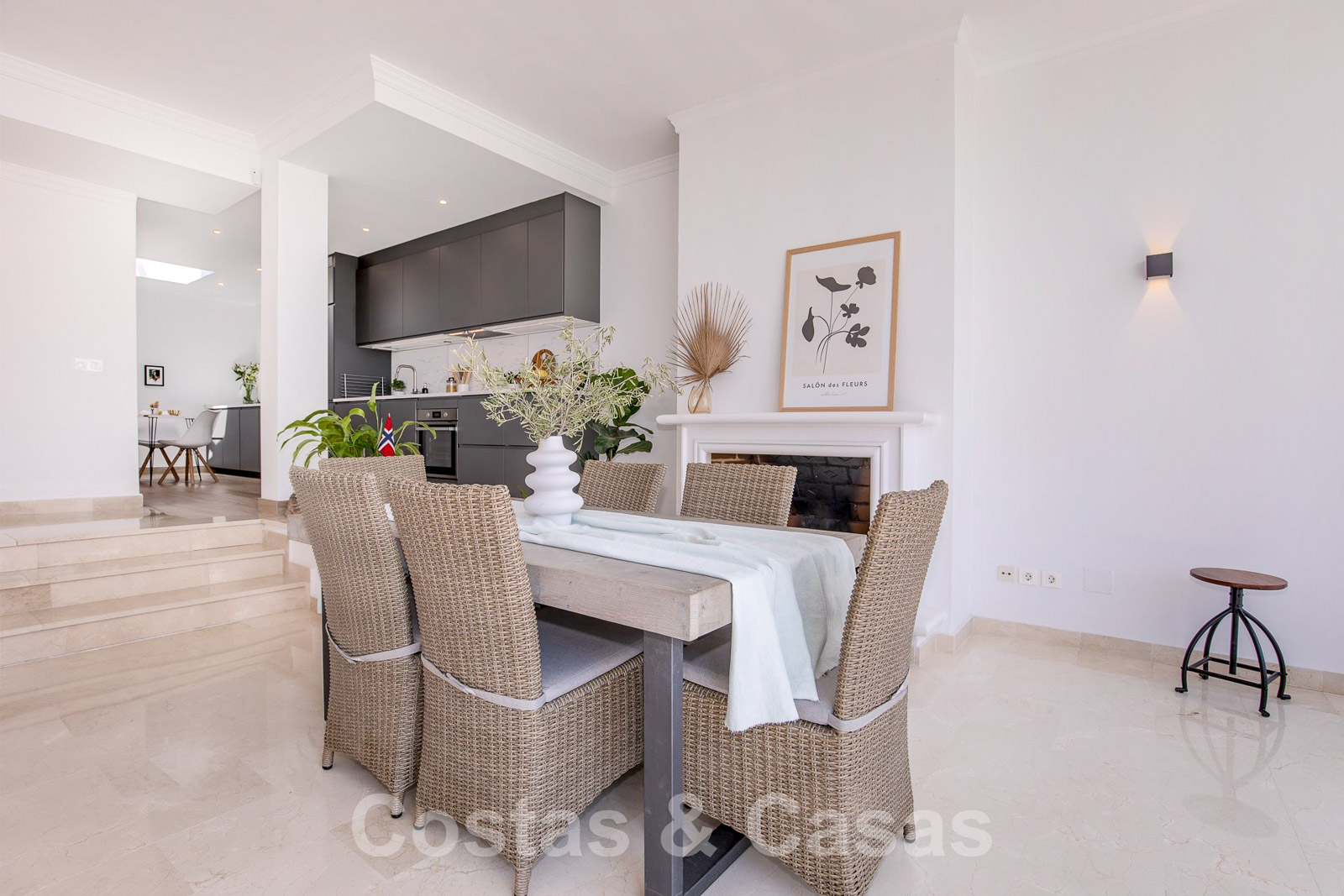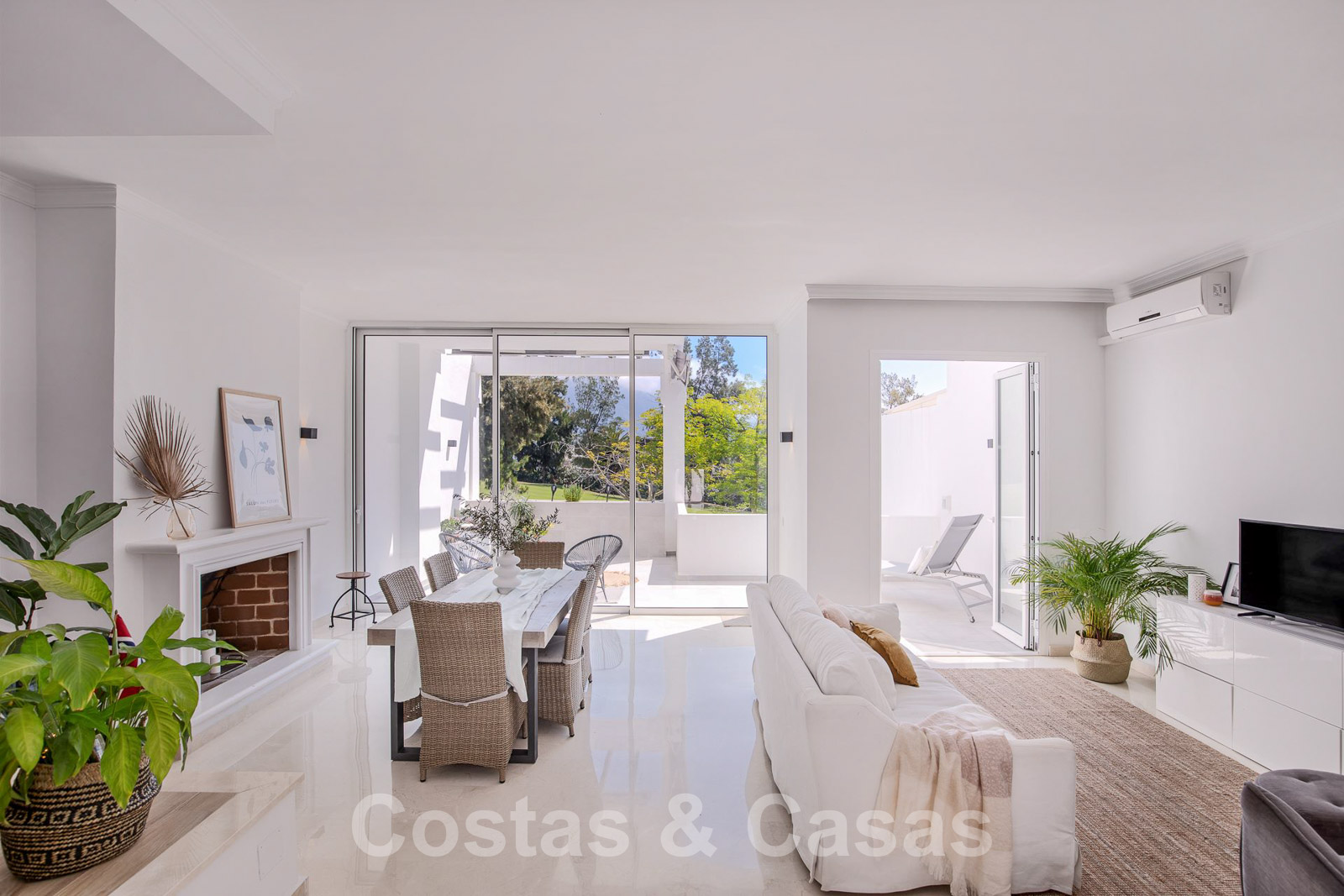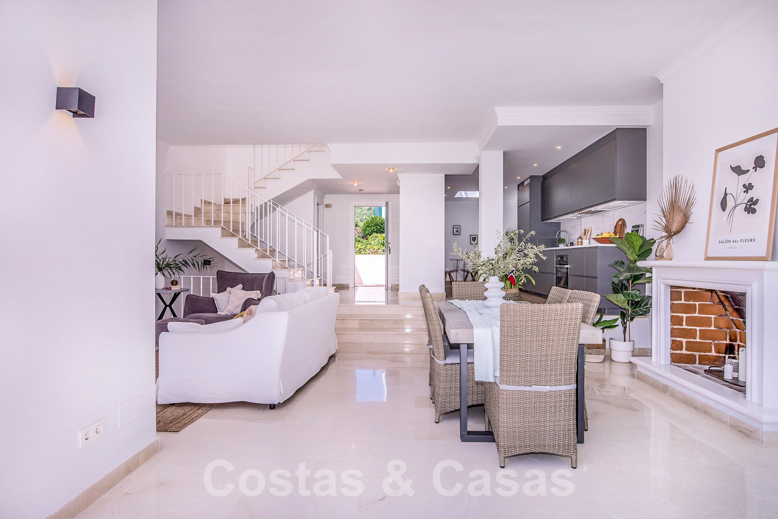 Open-plan leefruimte met salon en geïntegreerde eetruimte.