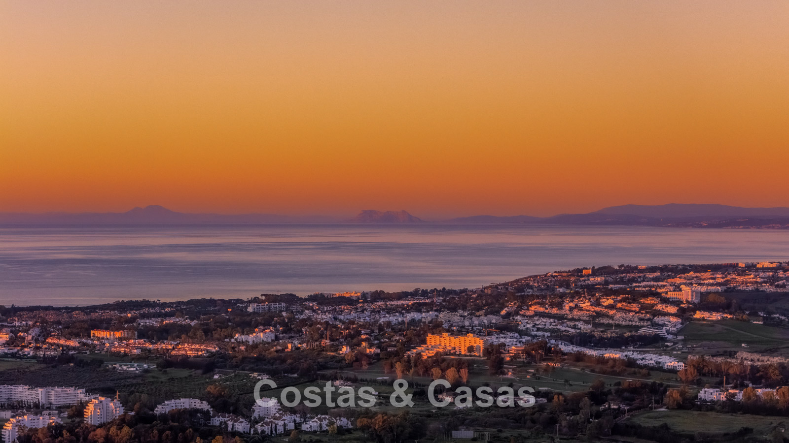 Magnifiek uitzicht over de groene landschappen, met de Middellandse Zee en de Straat van Gibraltar aan de horizon.