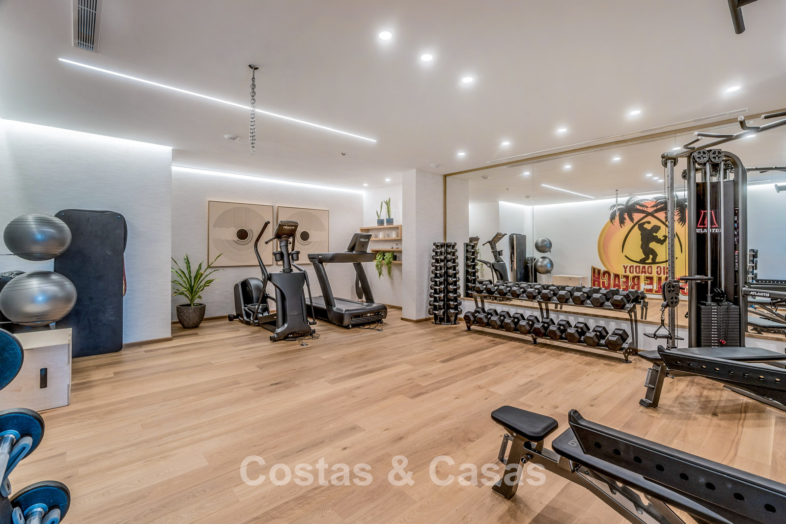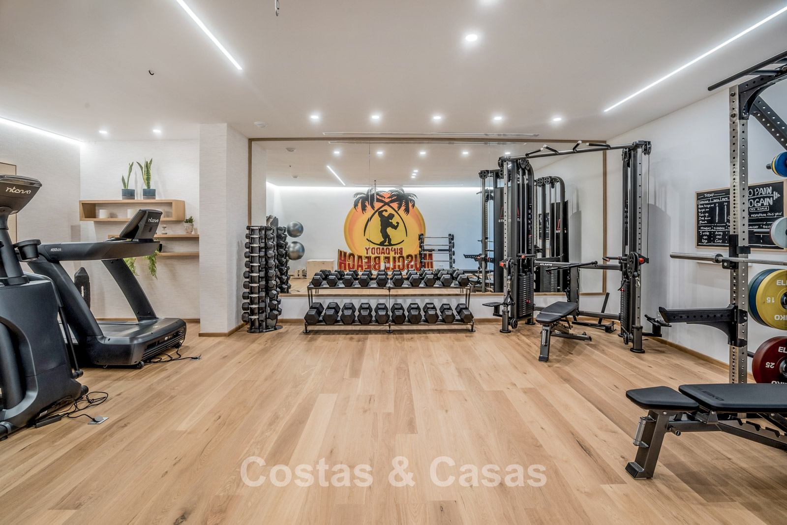 Een volledig uitgeruste gym met aangrenzend een massageruimte.
