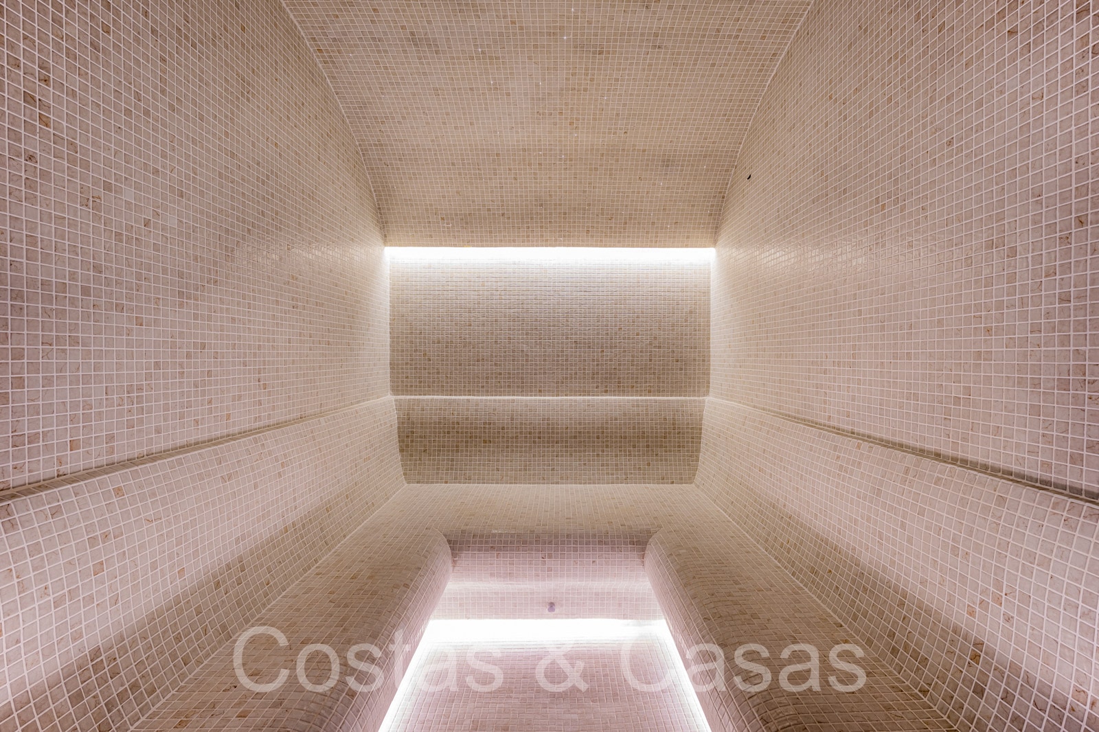 Extra voorzieningen waaronder een uitgeruste fitnessruimte, home cinema en een ontspannende spa met een hammam en sauna.