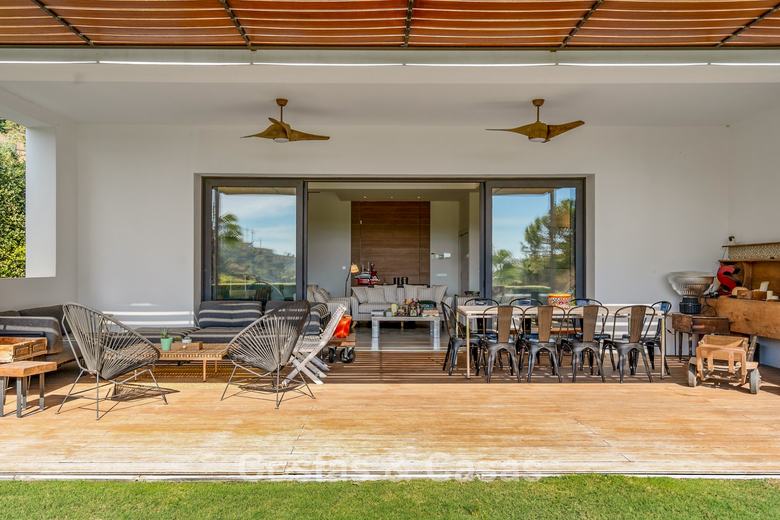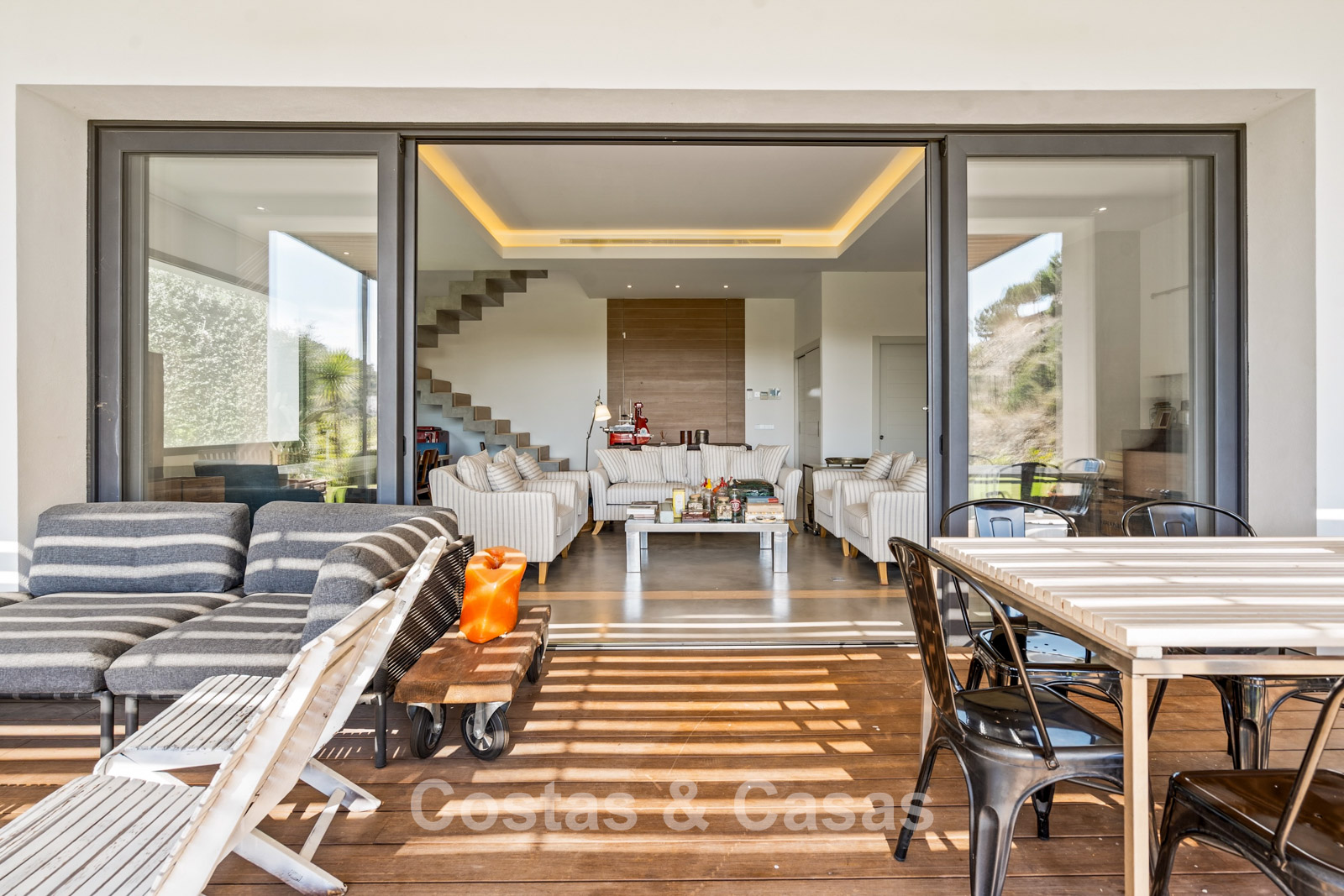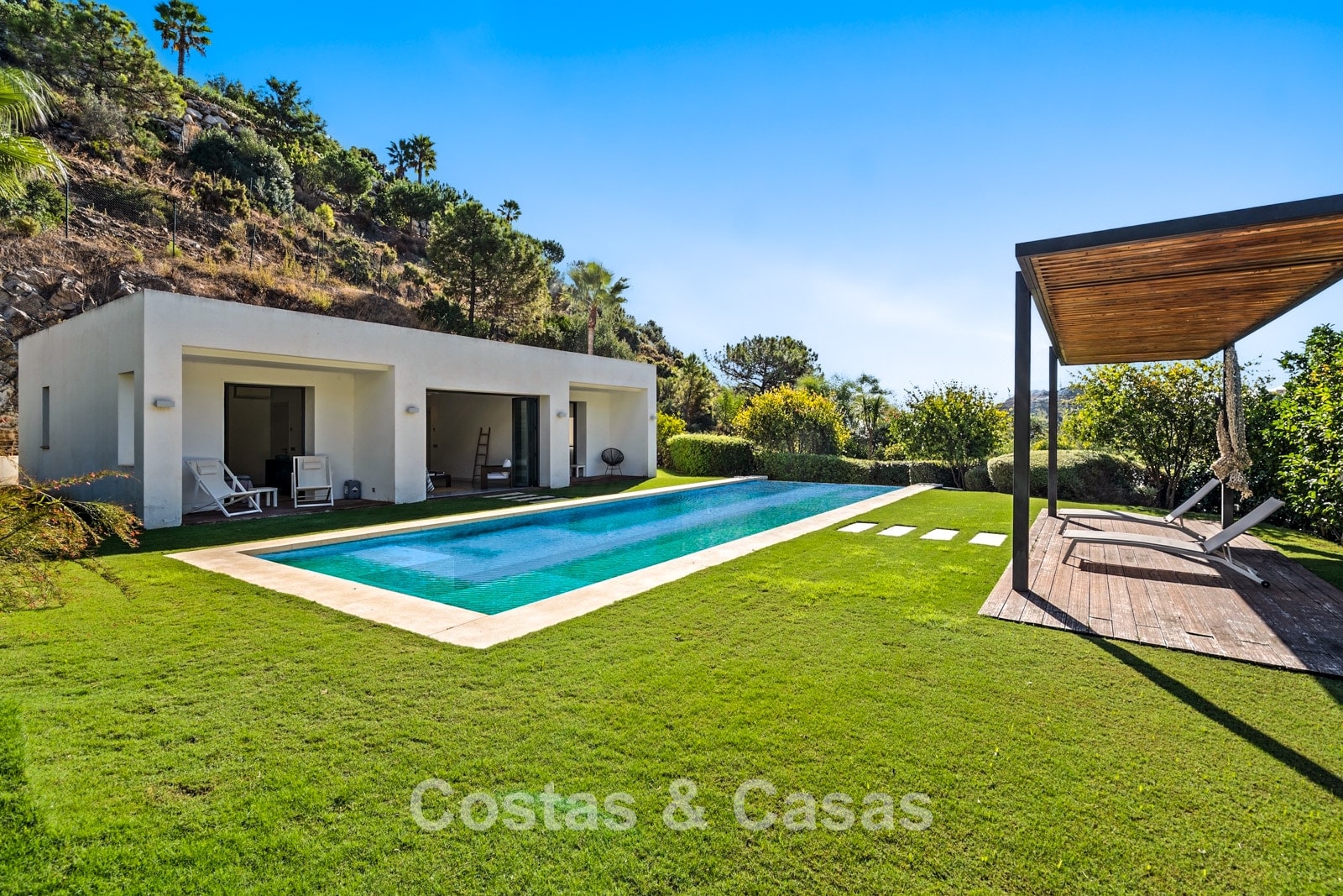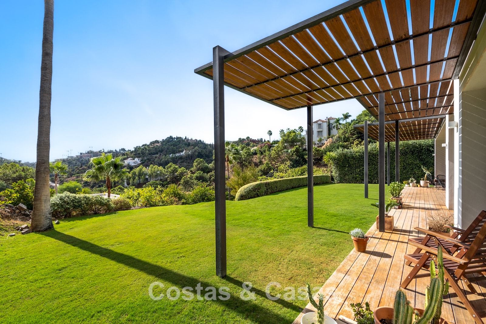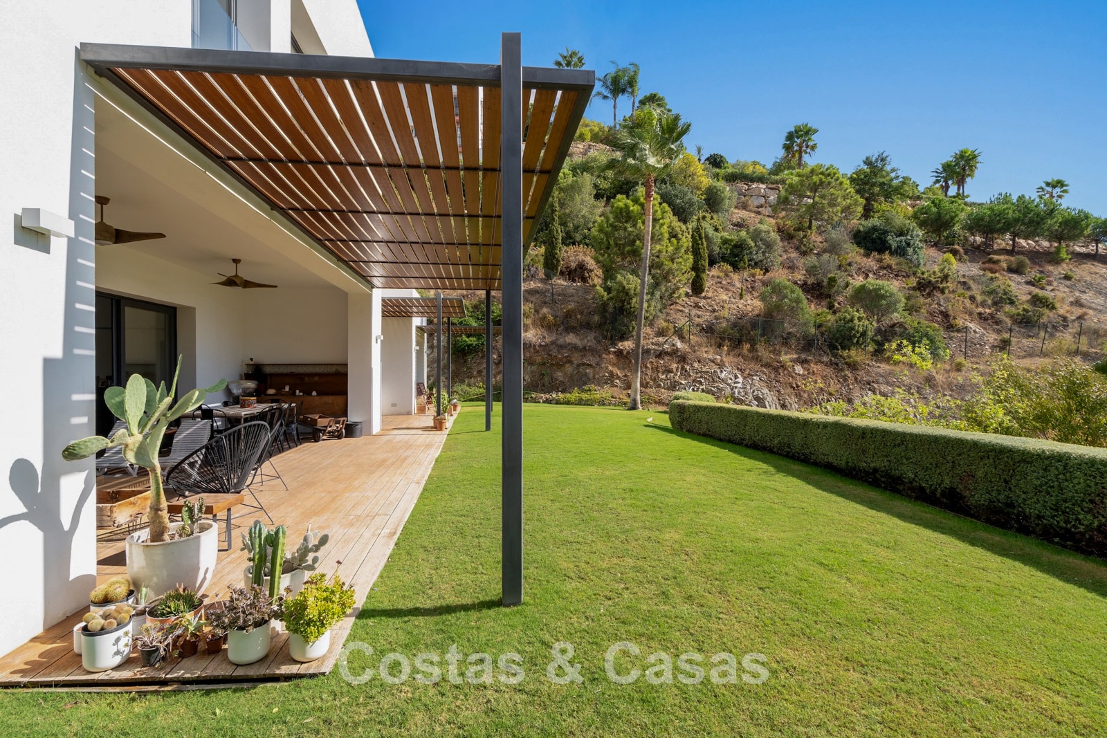 Er zijn ruime terrassen voorzien van moderne houten pergola’s voor schaduwrijke diners.