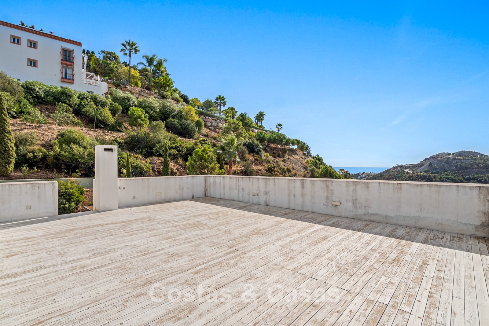 Uitzicht op de weelderige omgeving met het heuvellandschap en de Middellandse Zee in de verte.