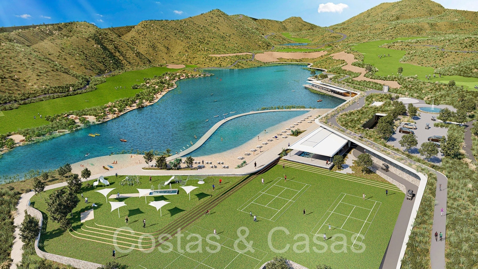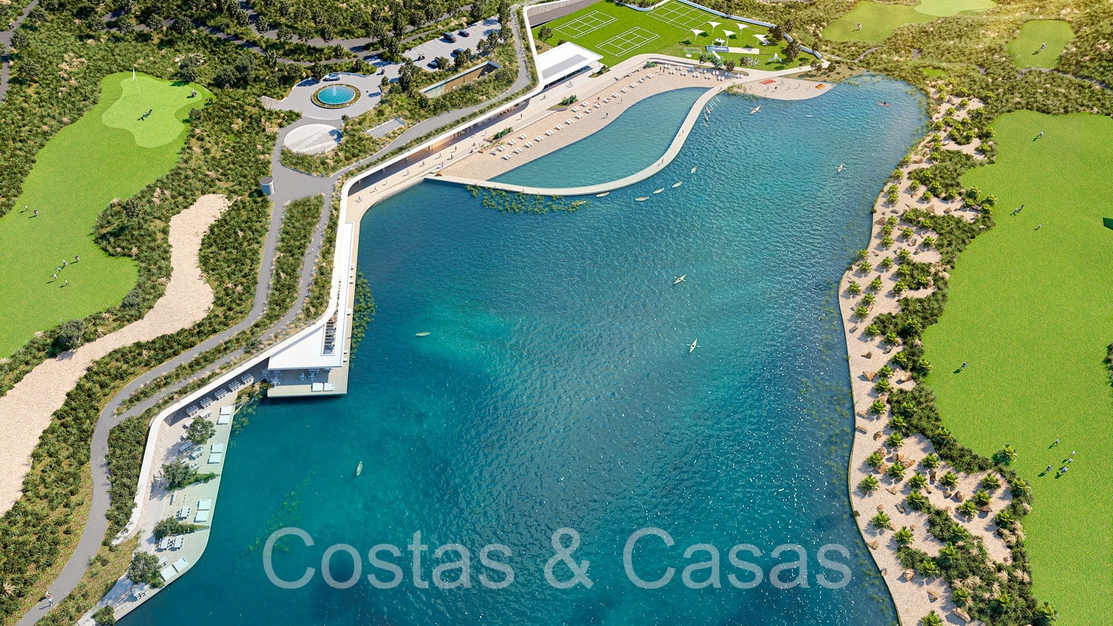 • In een natuur-domein met alle voorzieningen, golfbaan en meer met een eiland en een kunstmatig strand.
