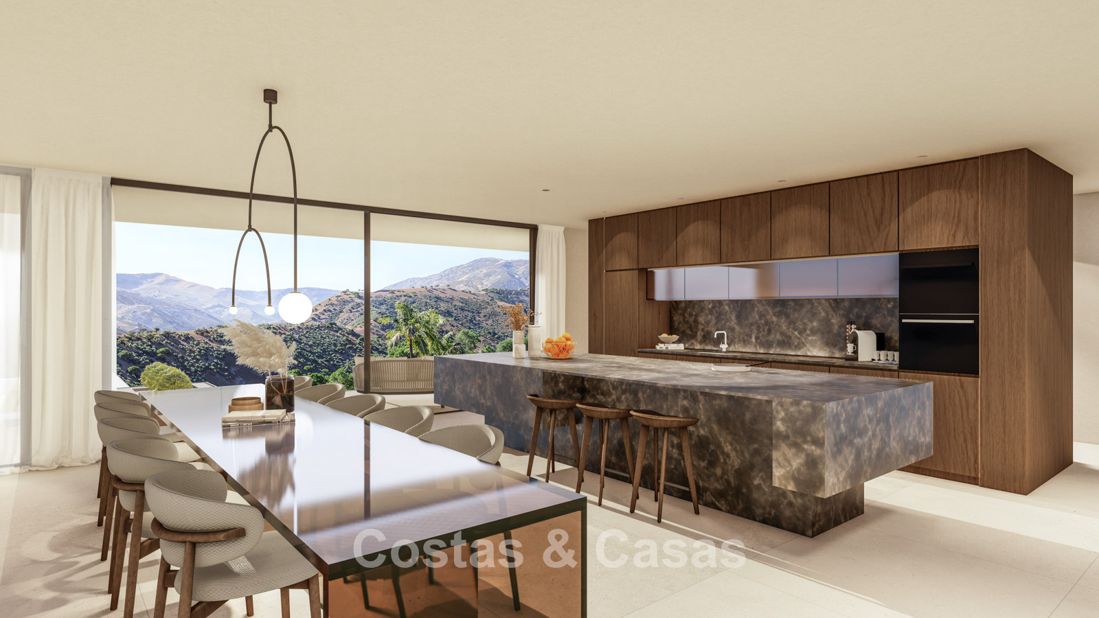 De ramen van vloer tot plafond vullen de open interieurs met natuurlijk licht terwijl ze een panoramisch uitzicht op de zee en het berglandschap bieden.