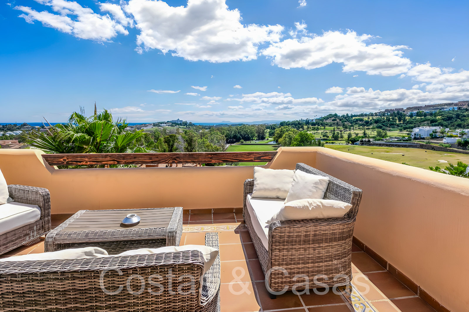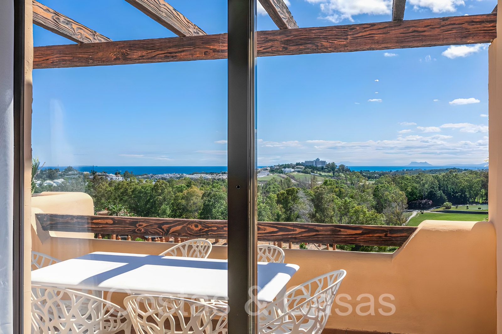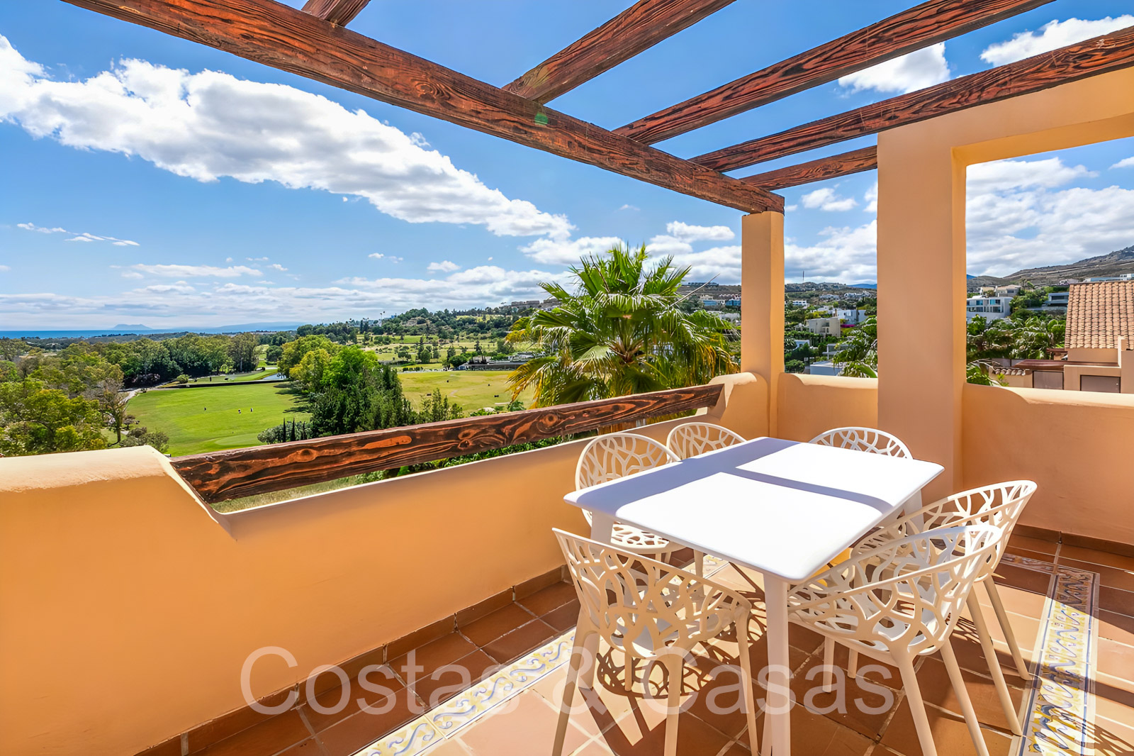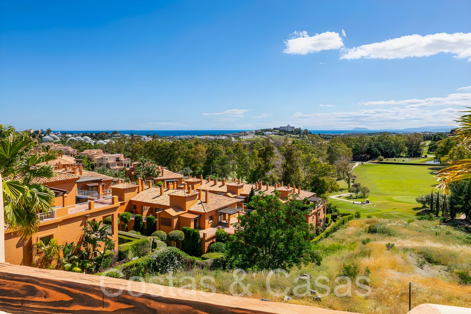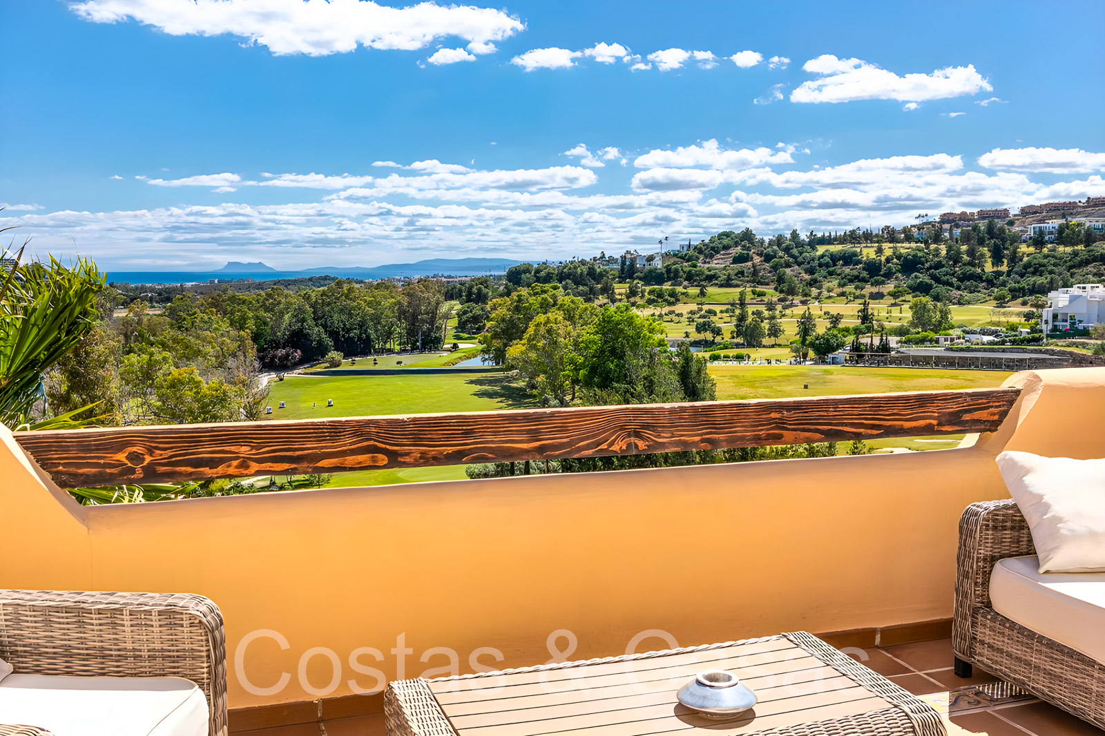 Zonnige terrassen waar je geniet van een schitterend uitzicht op de golfbaan, het berglandschap, Gibraltar en de Middellandse Zee.
