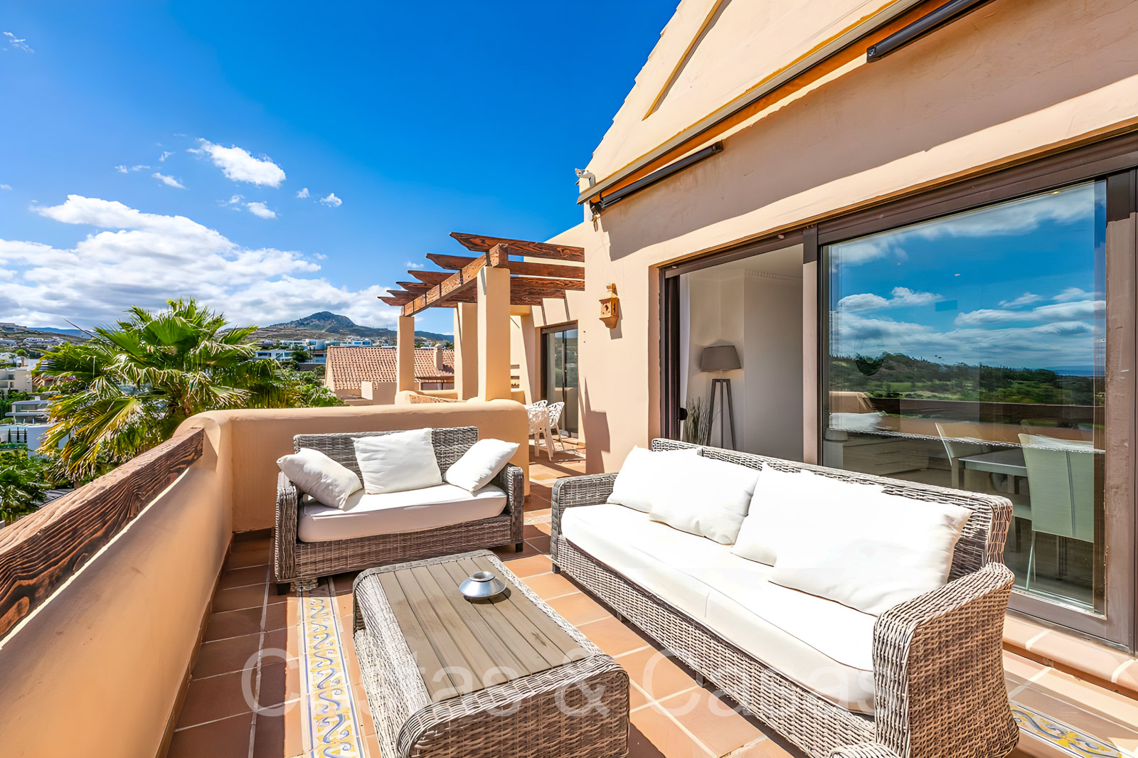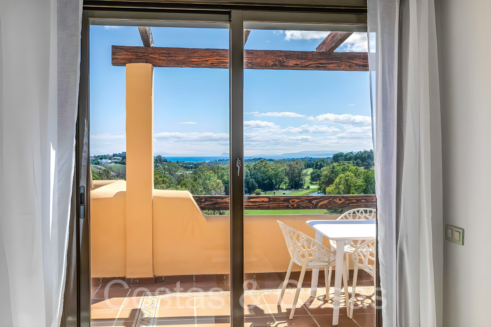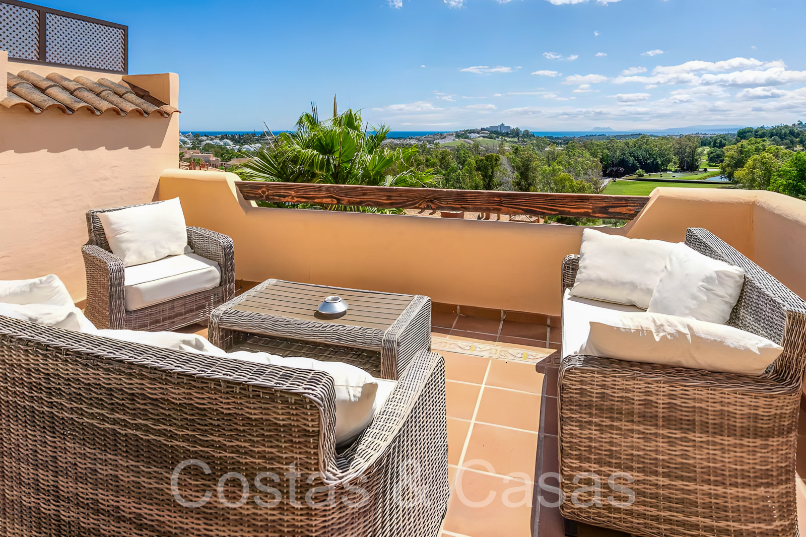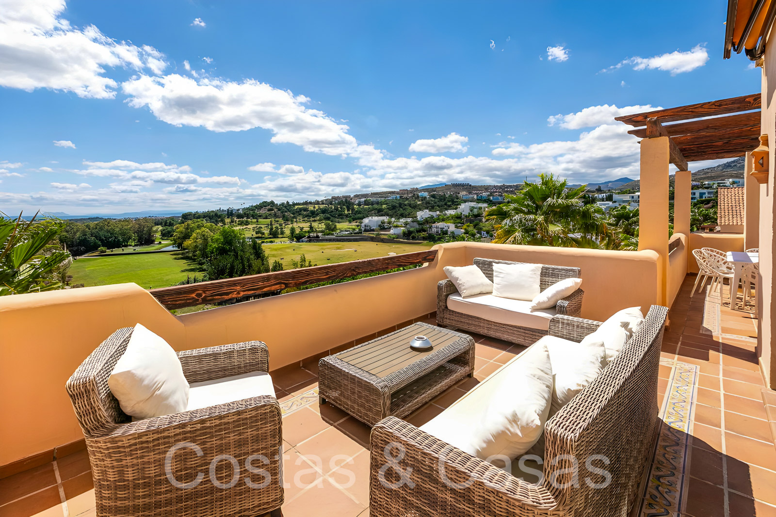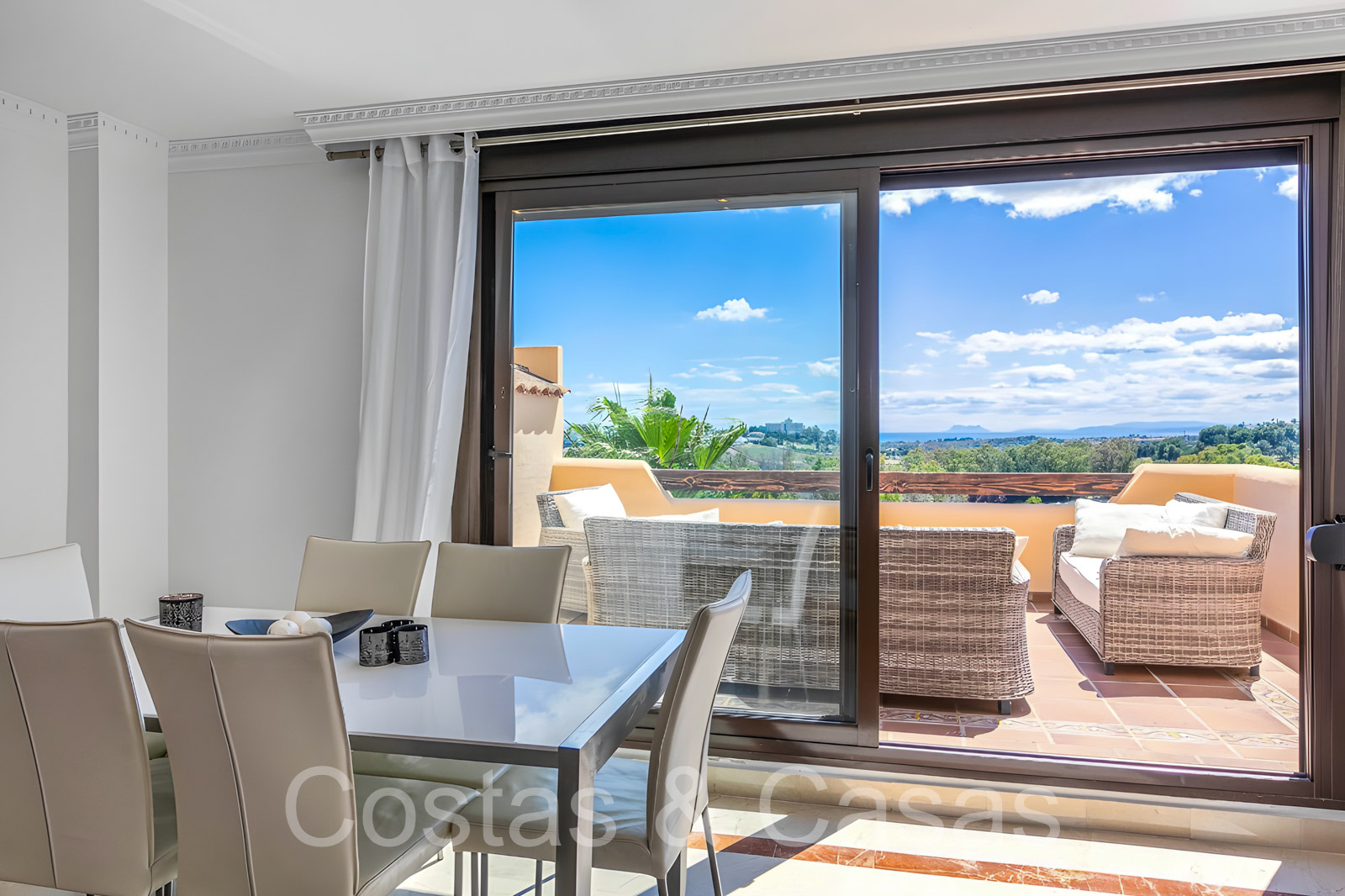 Zonnige terrassen waar je geniet van een schitterend uitzicht op de golfbaan, het berglandschap, Gibraltar en de Middellandse Zee.