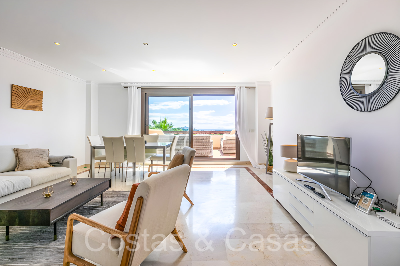 Lichtrijke woonkamer met TV lounge en geïntegreerde eetruimte, die direct uitkomt op het terras.