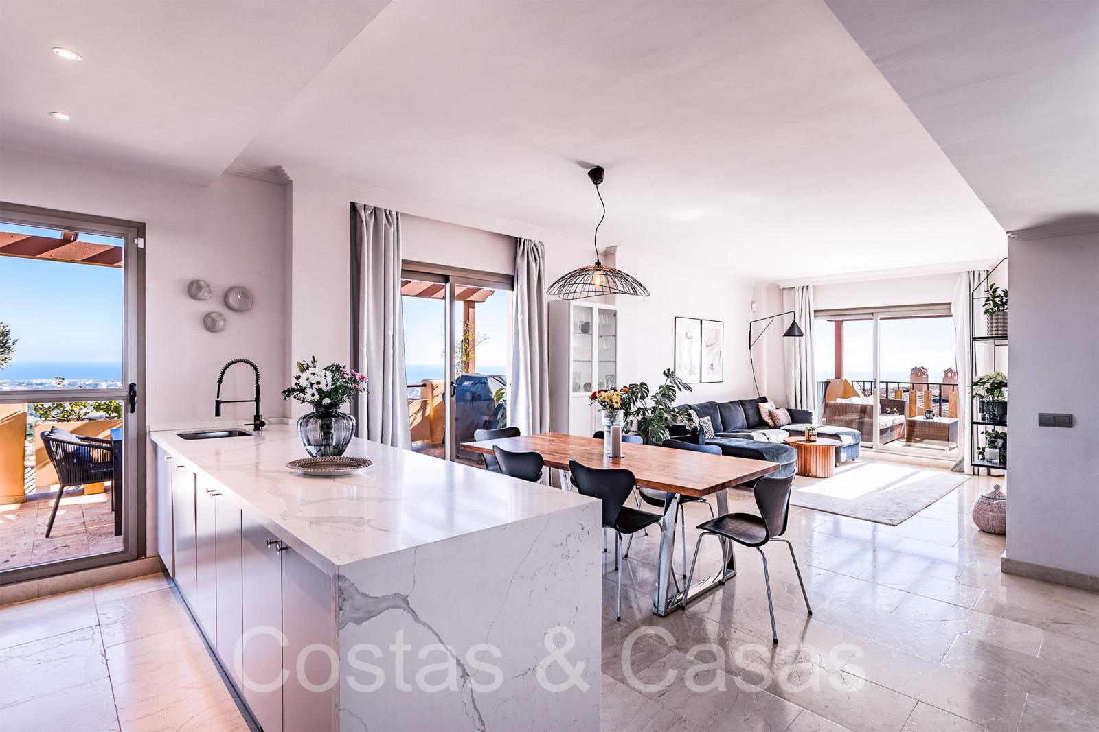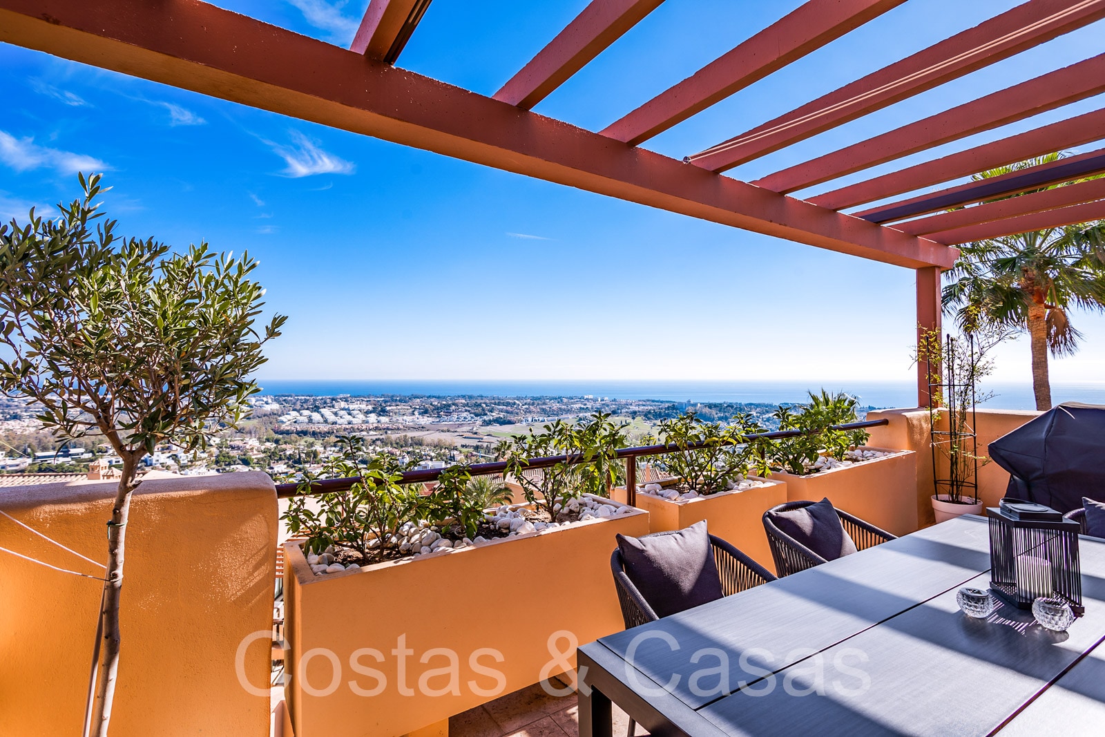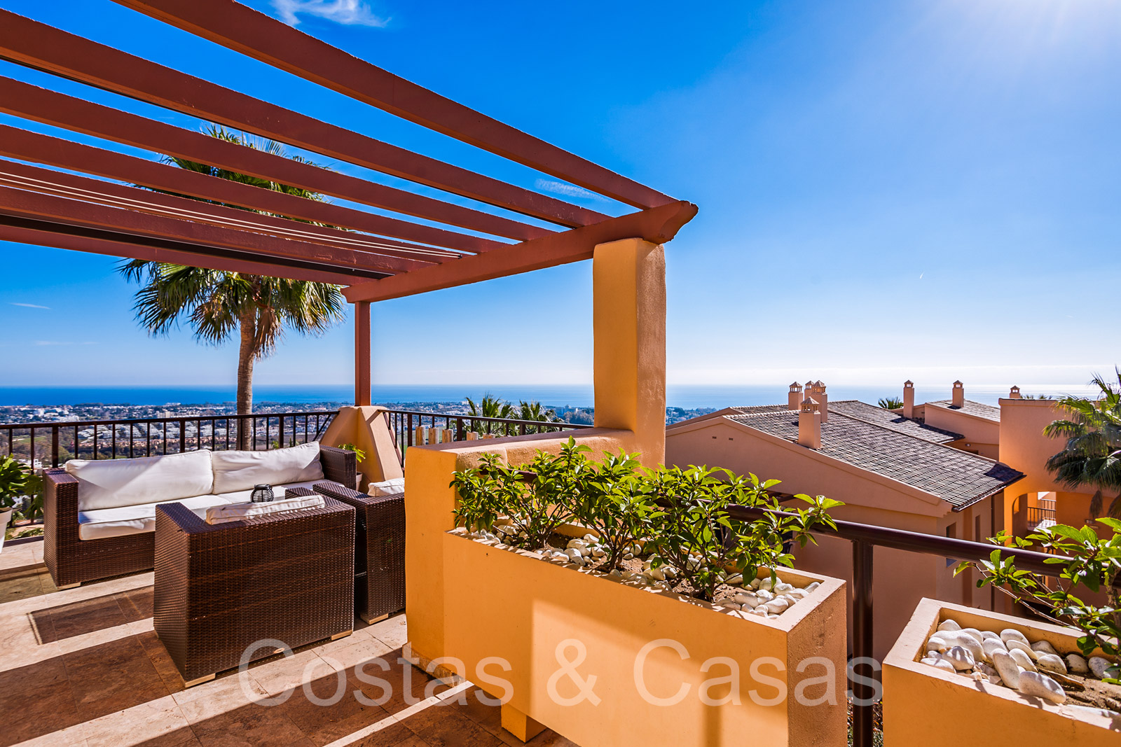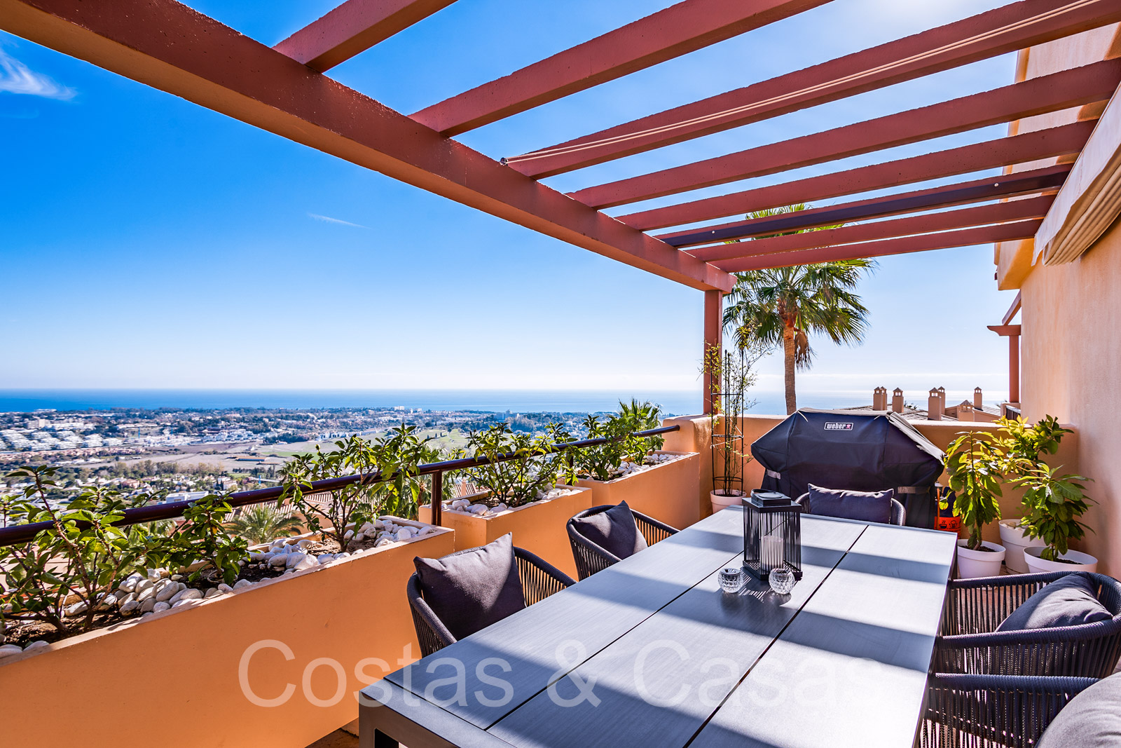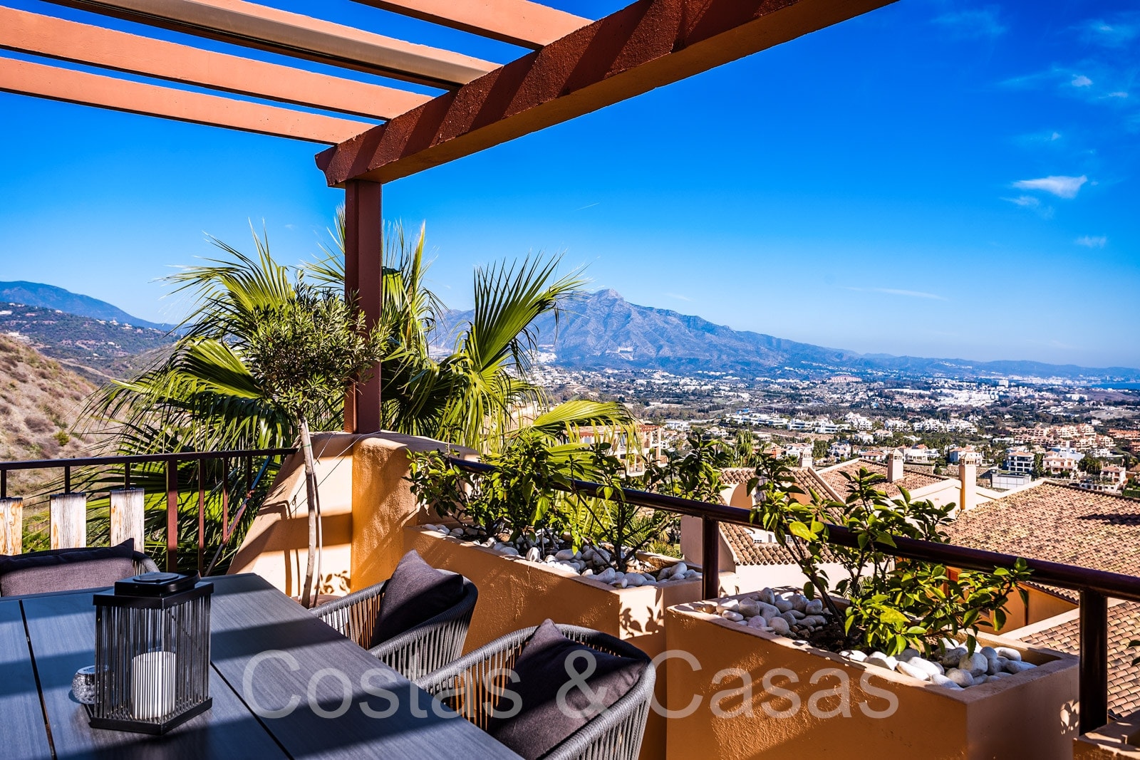 Twee grote terrassen, waarvan één op het zuidoosten met uitzicht op de bergtop van La Concha en de Atalaya golfbaan, en een ander terras op het zuidwesten met prachtig uitzicht op de Middellandse Zee, Gibraltar en de bergen van Noord-Afrika.