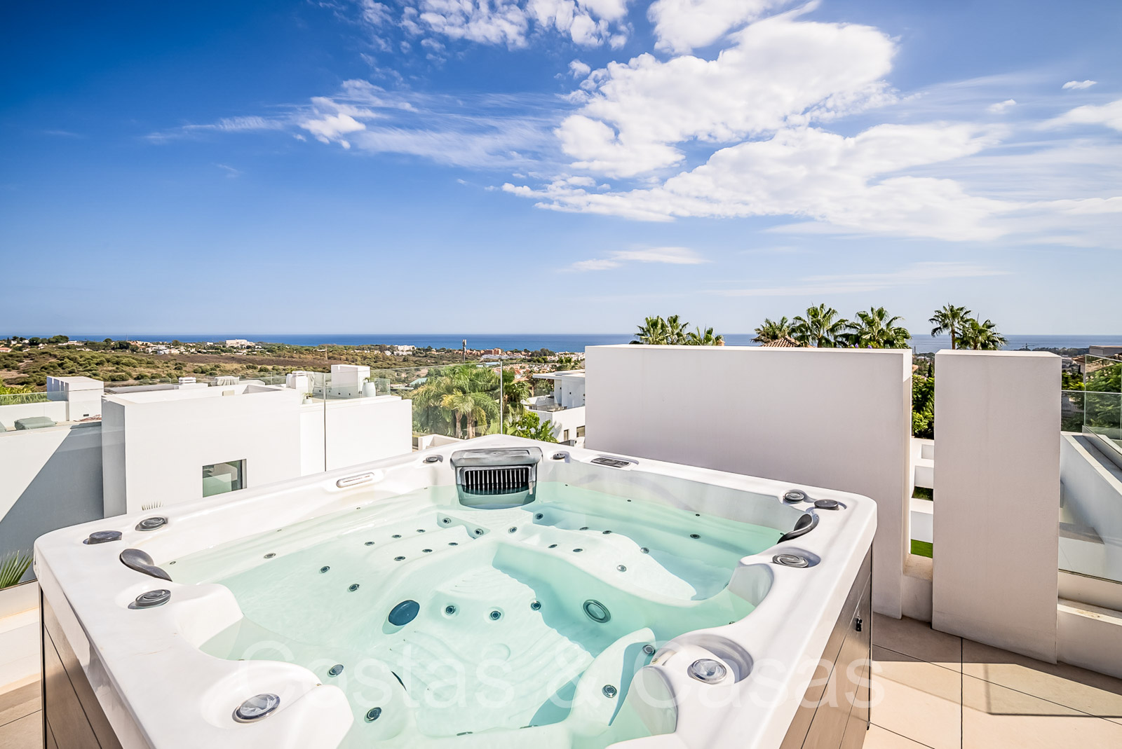 Uitgestrekt dakterras met lounge en eetgedeelte en een jacuzzi, waarvan panoramisch zicht op de bergen en zee tot aan Gibraltar en Afrika.