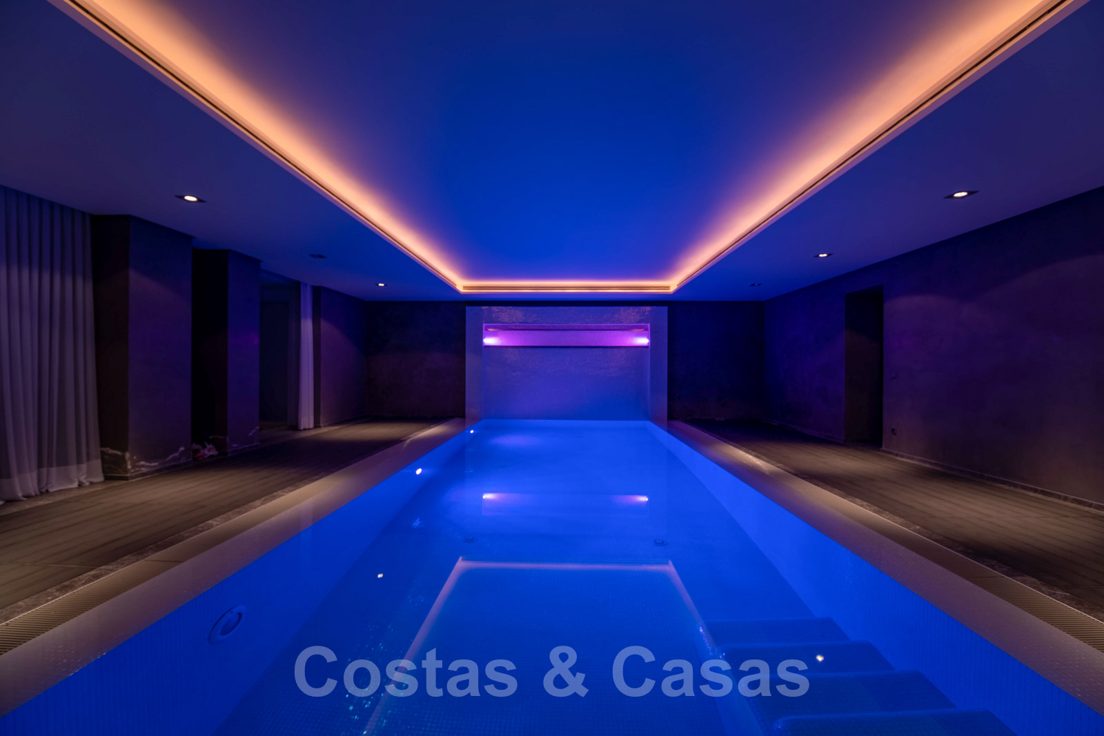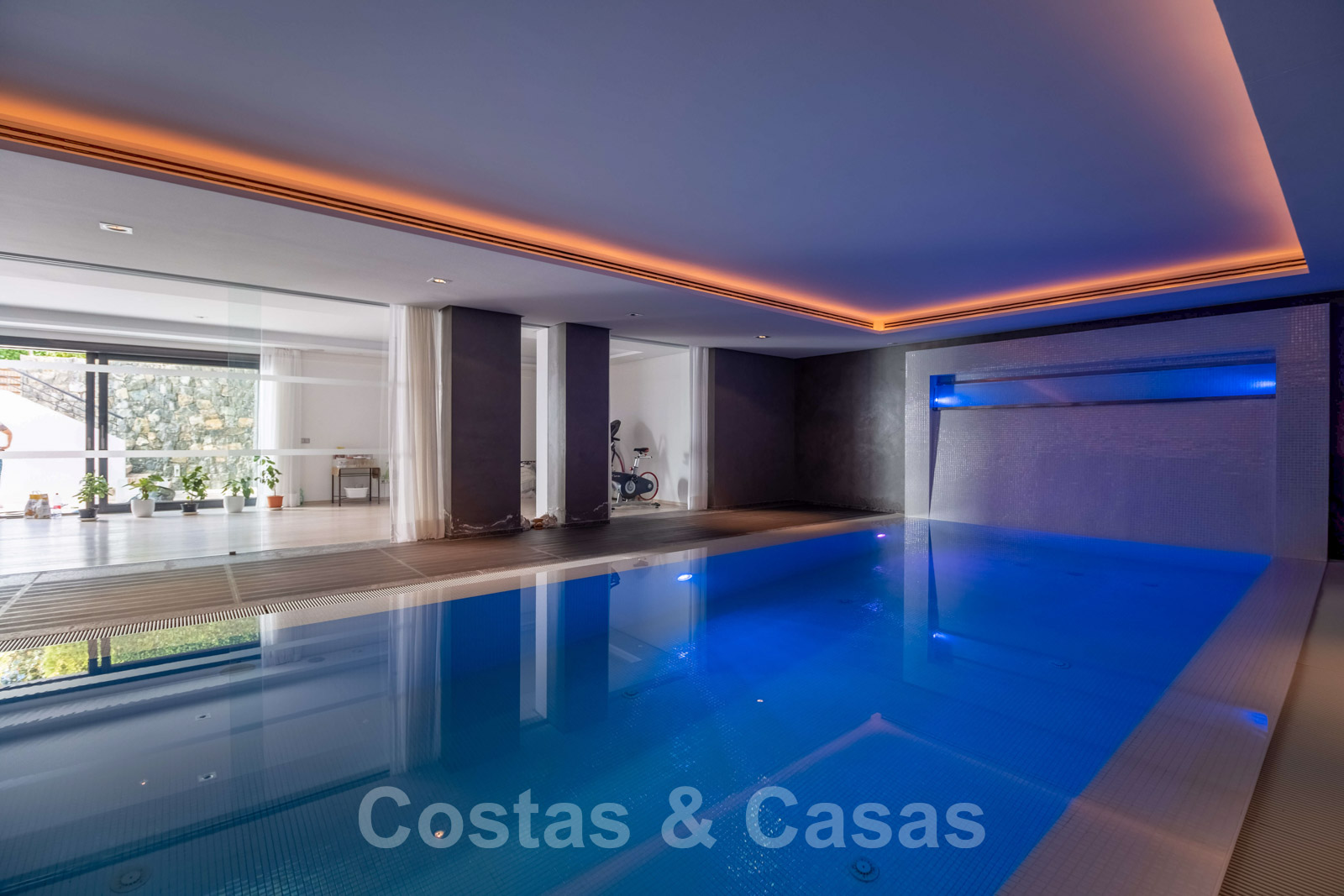 • De benedenverdieping voorziet een gym met glaswand en een groot verwarmd binnenzwembad met waterval.