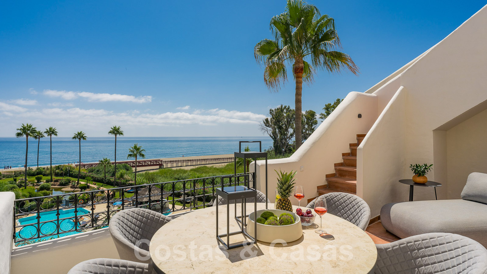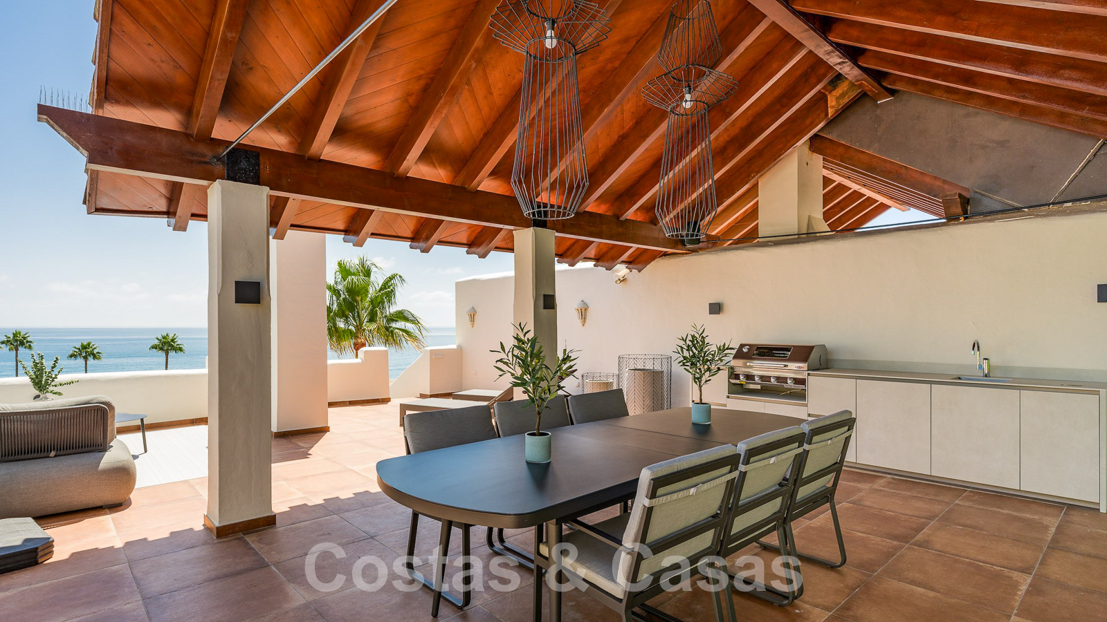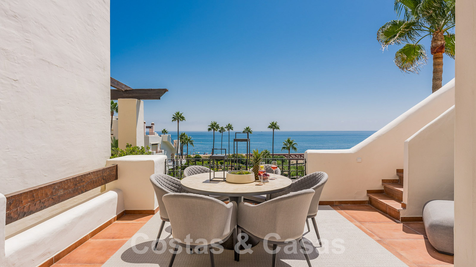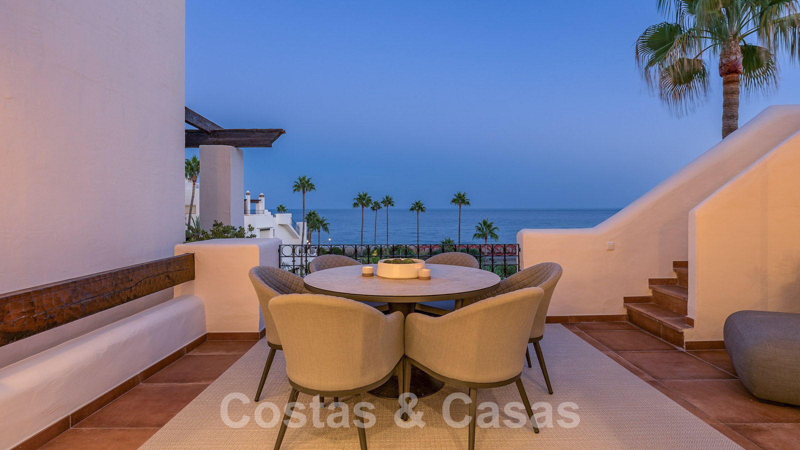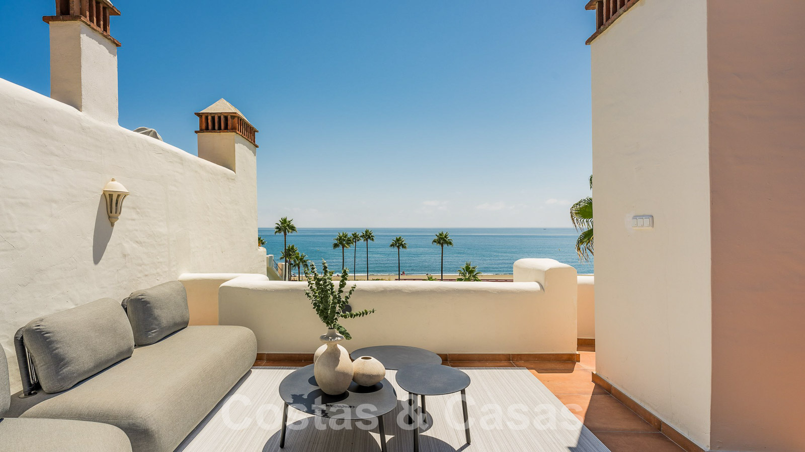 Eigentijds gerenoveerd penthouse te koop in een eerstelijnsstrand complex met frontaal zeezicht, New Golden Mile tussen Marbella en Estepona