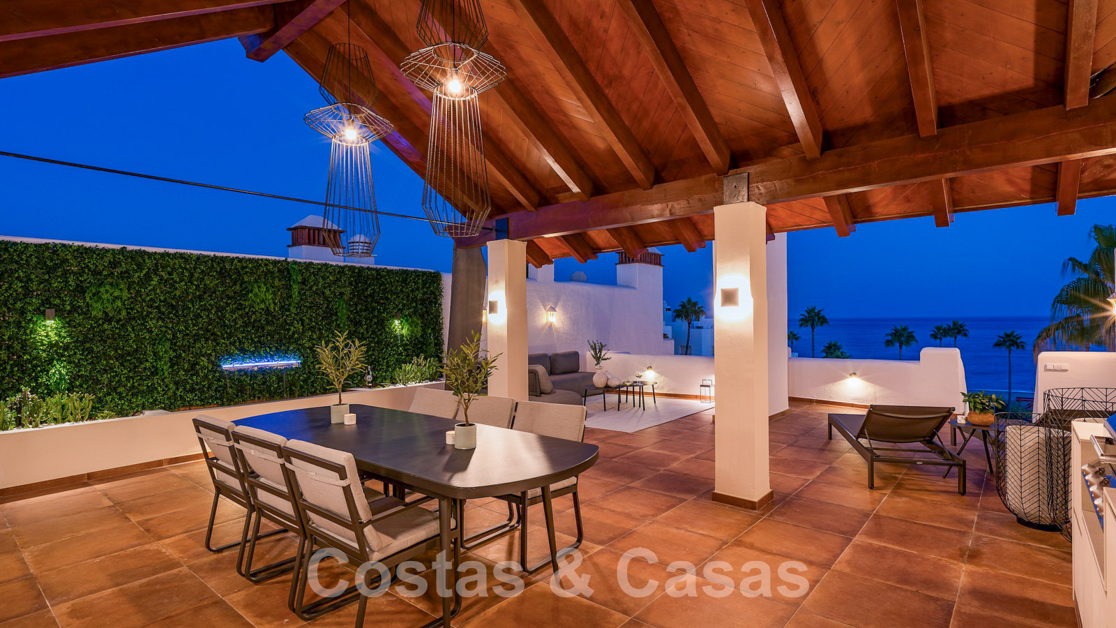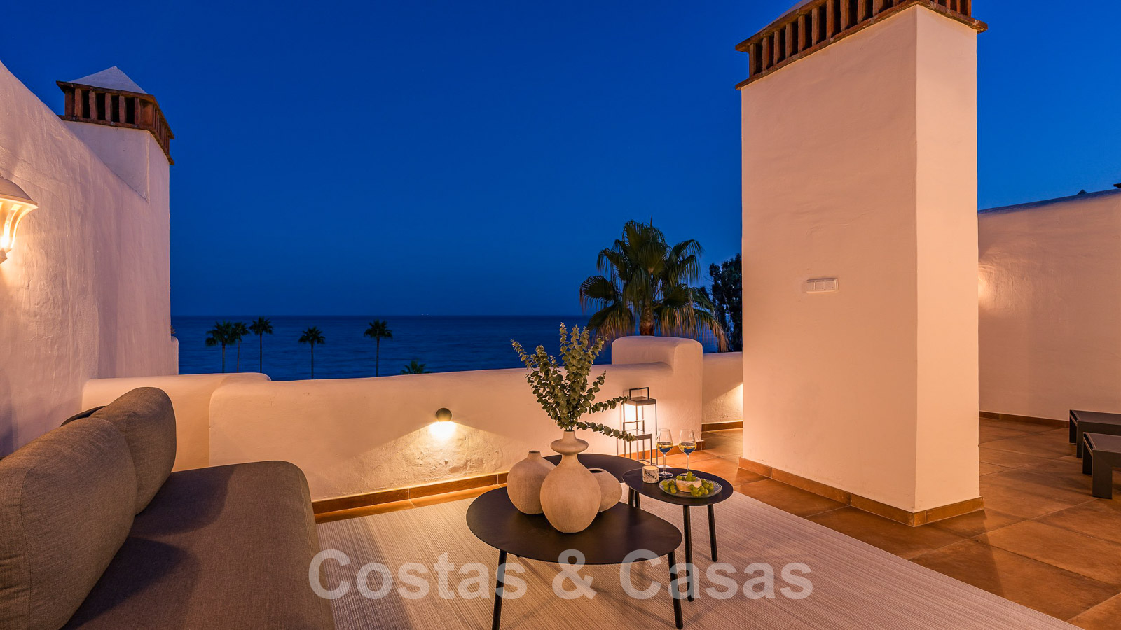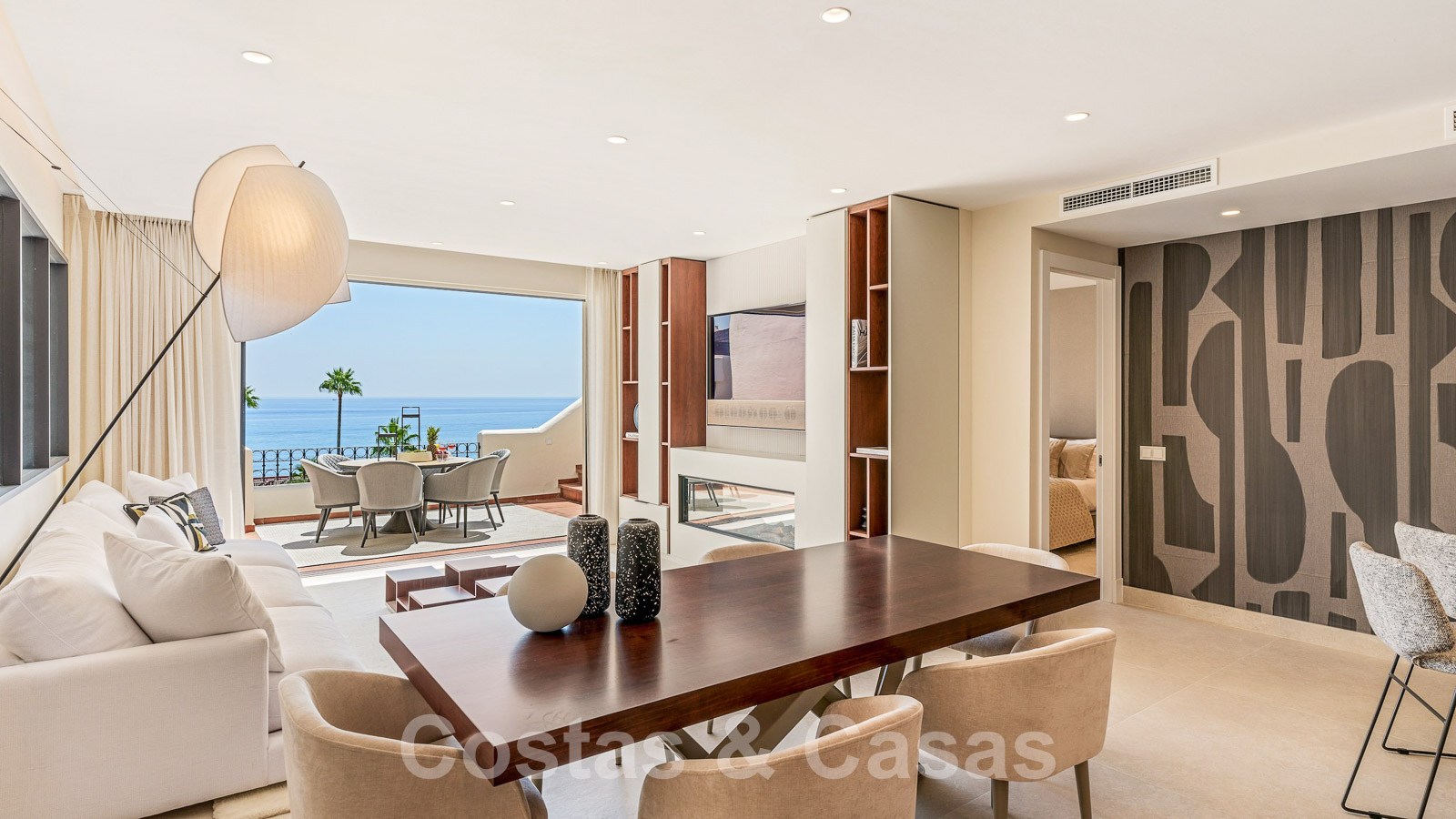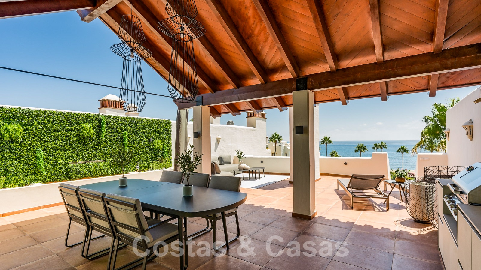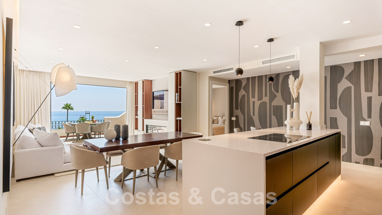 Eigentijds gerenoveerd penthouse te koop in een eerstelijnsstrand complex met frontaal zeezicht, New Golden Mile tussen Marbella en Estepona