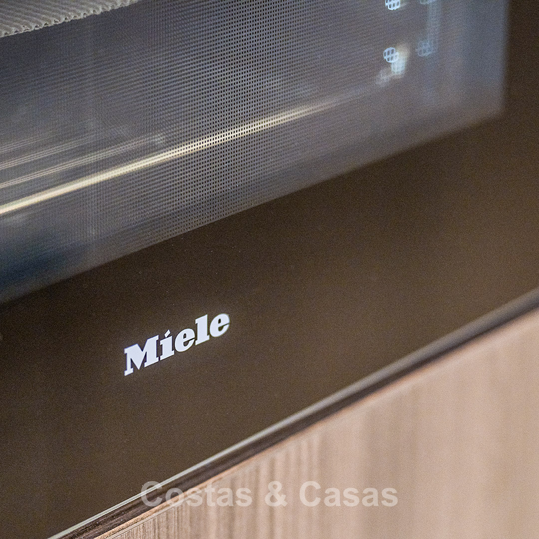 Gloednieuwe, open designkeuken met Miele toestellen en een eiland waaraan je kan ontbijten.